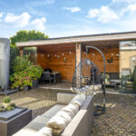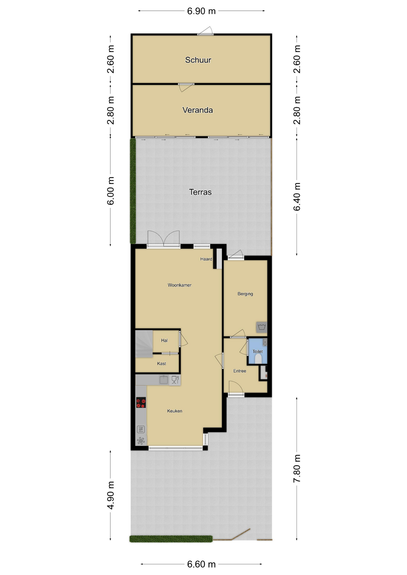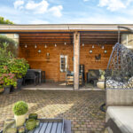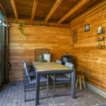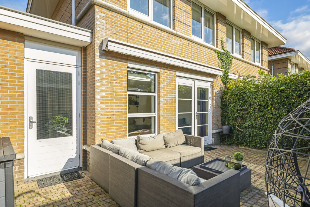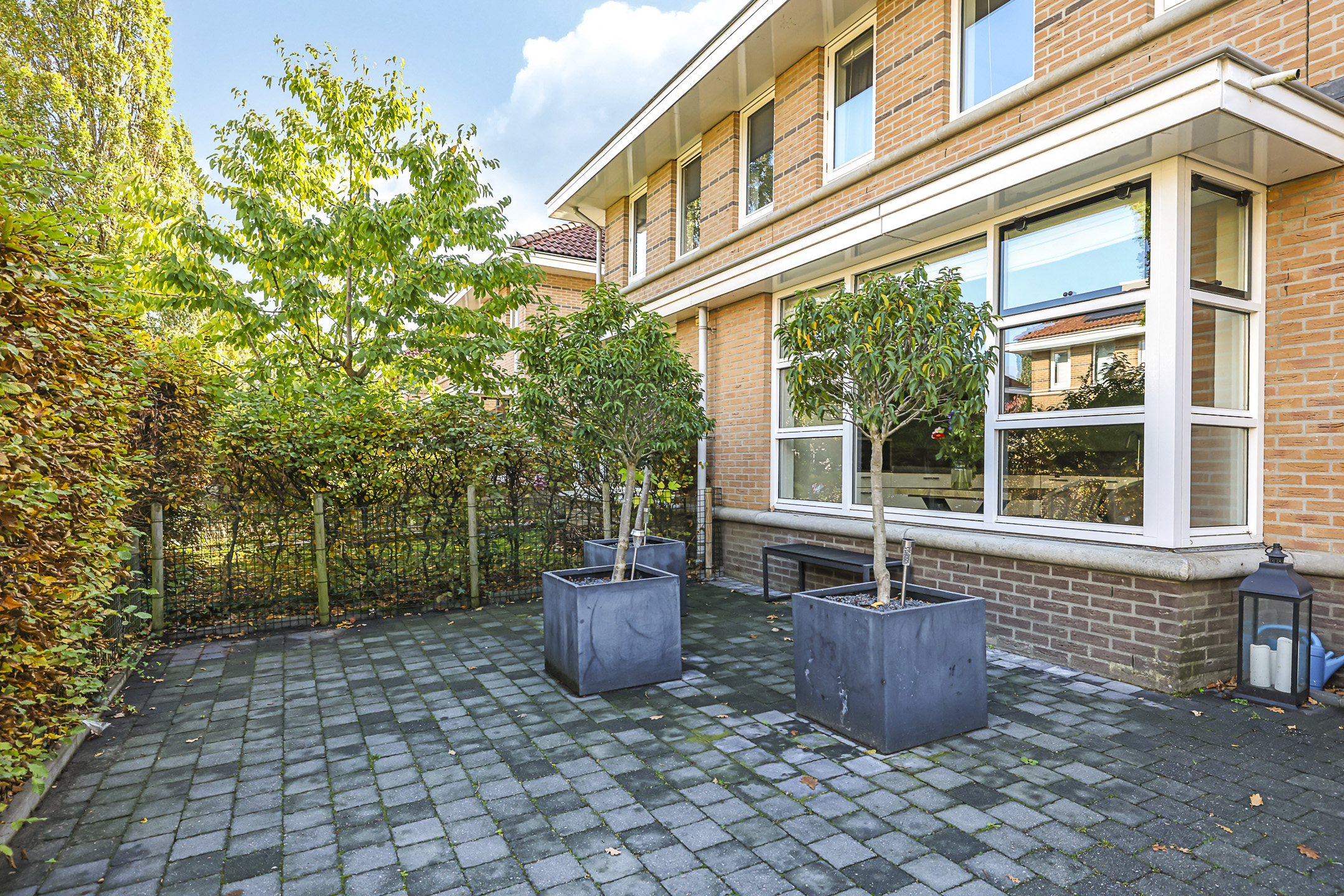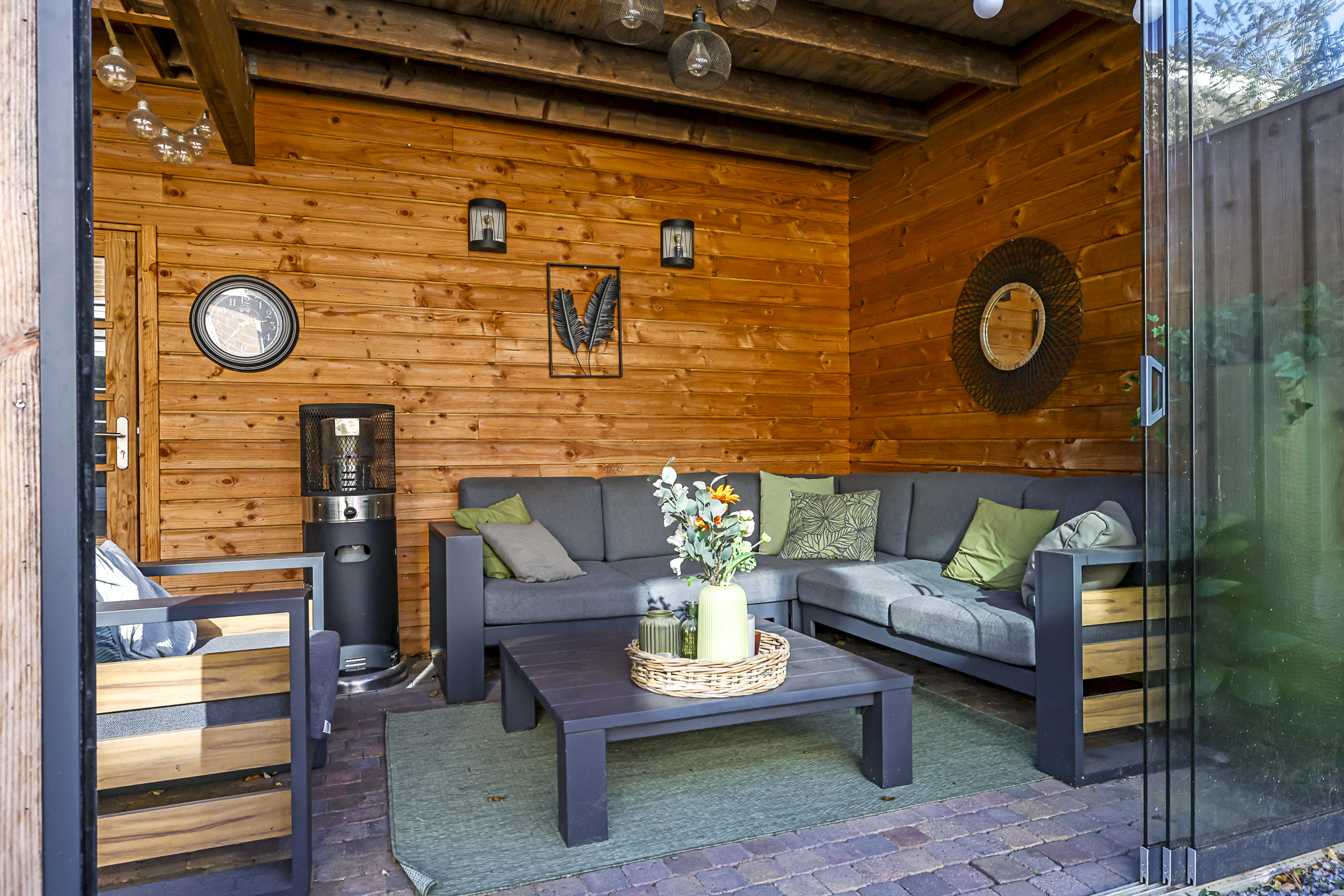 Bij de woning hoort een comfortabele, onderhoudsvriendelijke achtertuin. De tuin is voorzien van een groot terras waarbij een elektrische bedienbare zonwering voor de nodige schaduw kan zorgen. In de zomerdag zal je hier dankbaar gebruik van maken gezien de tuin op het zuidwesten is gelegen. Er is een tuinkamer geplaatst over de volle breedte tuin. Glazen schuifwanden zorgen dat je deze ruimte geheel kan afsluiten waardoor je hier ook bij lagere temperaturen nog heerlijk kan zitten. Via deze tuinkamer heb je toegang tot de achtergelegen schuur. Doordat deze eveneens over de volle breedte is geplaatst heb je hier met 18m² meer dan genoeg opbergruimte. Via de schuur heb je toegang tot de achtergelegen weg.