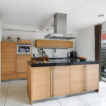 Open keuken met eilandopstelling en v.v. inbouwapparatuur, voorraadkast en tuindeur
