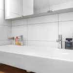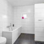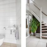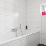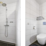 Net als de rest van de woning is ook de badkamer modern en luxe. Alles is immers aanwezig, van een ligbad tot een separate inloopdouche. Een 2-persoons wastafelmeubel en een 2e zwevend wandcloset maken de badkamer compleet. Overigens is er opvallend veel opbergruimte voor toiletspullen voorhanden, namelijk in de ladekorven onder het wastafelmeubel als in de spiegelkast erboven. Het tegelwerk is neutraal en degelijk uitgevoerd, evenals de scheidingswand voor de douche. De douche is voorzien van een rainshower, een handdouche en een strakke drainafvoer. Het aanwezige raampje zorgt voor de nodige lichtinval en ventilatiemogelijkheid. Overigens is er ook mechanische ventilatie aanwezig. En niet te vergeten de vloerverwarming én wandverwarming (1 wand betreft de ‘knuffelwand’).