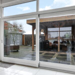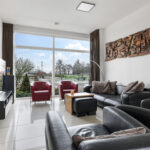 Woonkamer met grote glaspuien, hoog plafond, vrij uitzicht en brede schuifpui