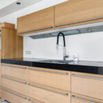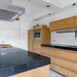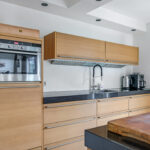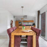 Het dikke natuurstenen werkblad geeft de keuken een luxe uitstraling. Verder is er meer dan voldoende kastruimte, waaronder in de bovenkasten met liftdeuren. En mocht je nog ruimte zoeken voor voorraad en keukenmachines, dan is er aan de zijkant een onopvallende inbouwkast met schappen te vinden. En mocht je in de zomer lekker buiten willen eten, dan biedt de tuindeur direct toegang tot het buitenterras.