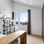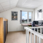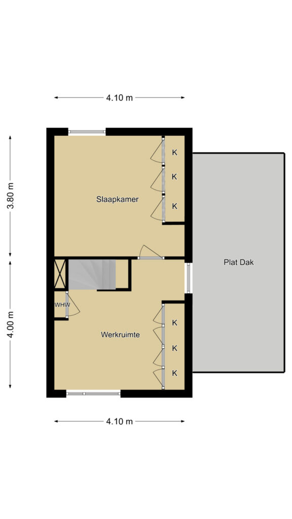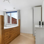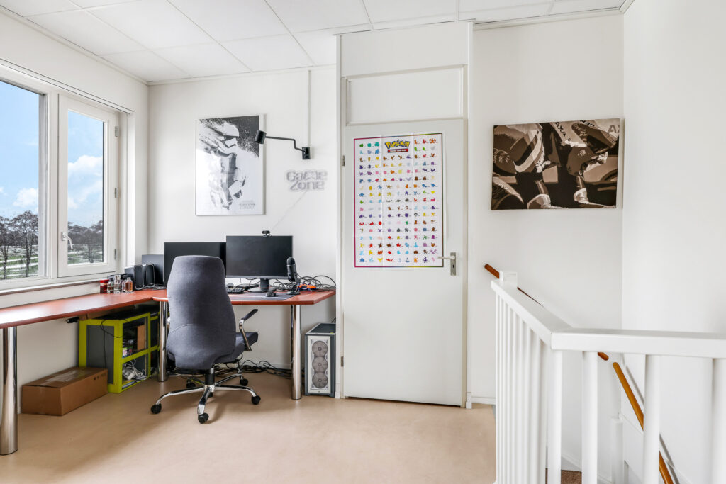 De 2e verdieping is ingedeeld met een multifunctionele voorzolder en een 3e slaapkamer. De voorzolder is dermate ruim dat je hier wellicht nog een extra (slaap)kamer kunt maken. In de huidige setting is er een werk/studiehoek gecreëerd, handig voor wanneer je regelmatig vanuit huis werkt. Het is geen straf om bij het raam te zitten wanneer je je bedenkt dat je een panoramisch vrij uitzicht hebt. De slaapkamer is met 16m2 eveneens ruim van opzet en doet niet onder aan de slaapkamers op de 1e verdieping. Deze kamer heeft misschien wel het meest ruimtelijke gevoel omdat je hier tot in de 4 meter hoge nok omhoog kijkt. De aanwezige kastenwand is erg handig als garderobekast.