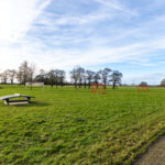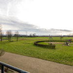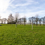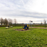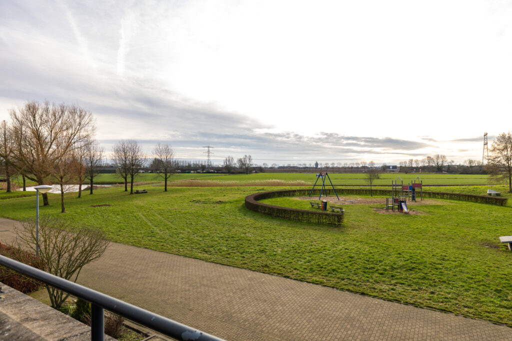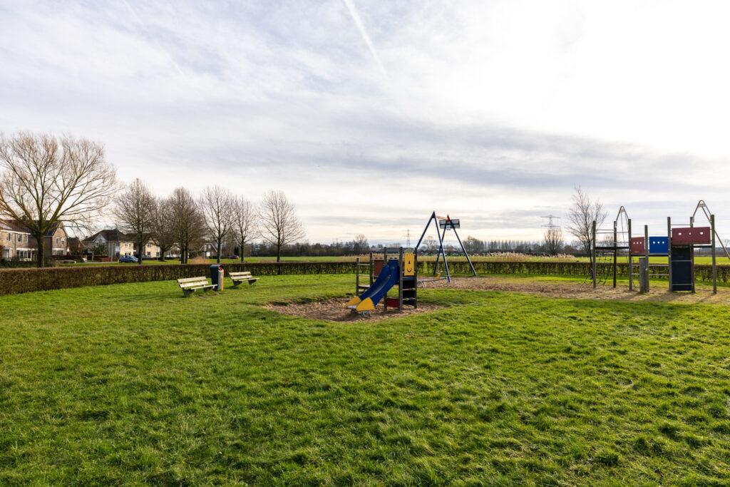 Speelweide met speeltoestellen voor de deur