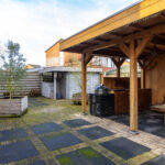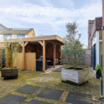 De achtertuin is misschien iets minder diep, maar wel breder dan gemiddeld. Hierdoor heeft de tuin alsnog een ruimtelijk gevoel met ruimte voor verschillende zithoeken en/of speeltoestellen zoals een trampoline. Erg fraai is de stijlvolle veranda van bijna 5m bij 4m met grote overstek waar je een uitgebreide tuinset en/of loungebank kwijt kunt. Zomers zit je lekker beschut in de schaduw terwijl je in de winter de warmte kunt opzoeken van een heater of houtkachel. Indien gewenst zou je er zelfs voor kunnen kiezen om glaswanden te plaatsen om de veranda af te kunnen sluiten.