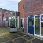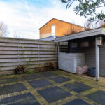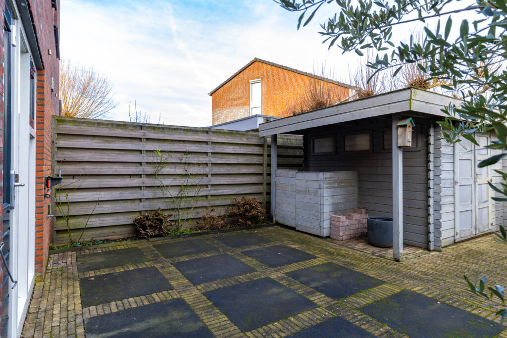 In de andere hoek van de tuin staat een houten tuinhuis. Hier kun je de nodige tuinspullen, buitenspeelgoed voor kinderen en/of fietsen kwijt. Omdat je ook een inpandige garage hebt, zou je kunnen overwegen om deze schuur weg te halen voor nóg meer ruimte in de tuin, bijvoorbeeld wanneer je een trampoline wilt plaatsen (of ingraven). Noemenswaardig is de poort (achterom) waardoor de achtertuin goed toegankelijk is. Bij andere 2-kappers zie je nog wel eens dat de achtertuin alleen toegankelijk is via de garage. Dat is hier dus niet het geval. Naast de woning ligt een eigen pad (zijtuin) waardoor je vanuit de achtertuin naar de voortuin en oprit kunt lopen.