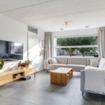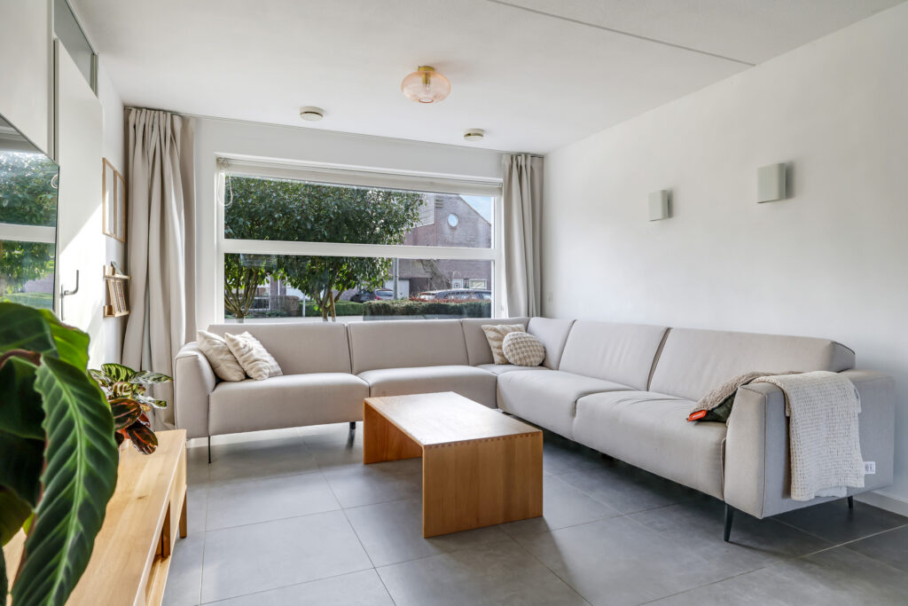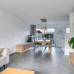 Een doorzonwoonkamer met aantrekkelijke raampartijen die doorlopen tot aan de vloer. De raamverdeling is horizontaal en zorgt voor een speels karakter. In de achtergevel is een brede schuifpui geplaatst waardoor je direct het buitenterras op loopt. Aan de voorzijde kijk je vrij weg op een groenstrook en wadi die voor het huis zijn gelegen. De vloer in de woonkamer betreft een lichte, trendy plavuizen vloer met ‘betonlook’ welke is v.v. vloerverwarming. Deze geldt als hoofdverwarming waardoor radiatoren achterwege gelaten konden worden.