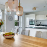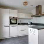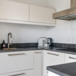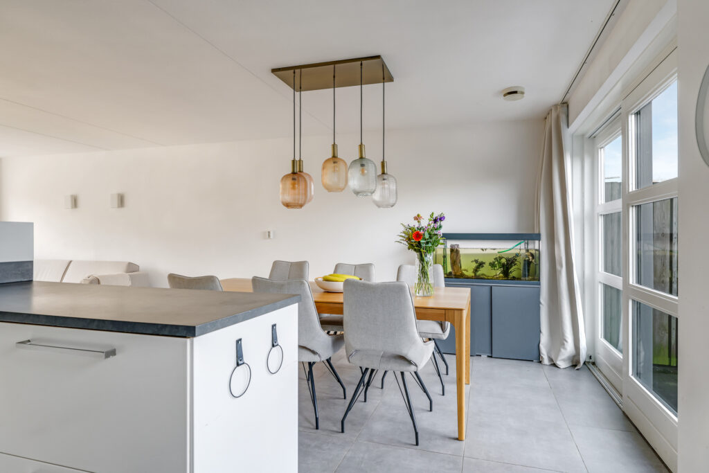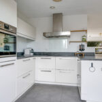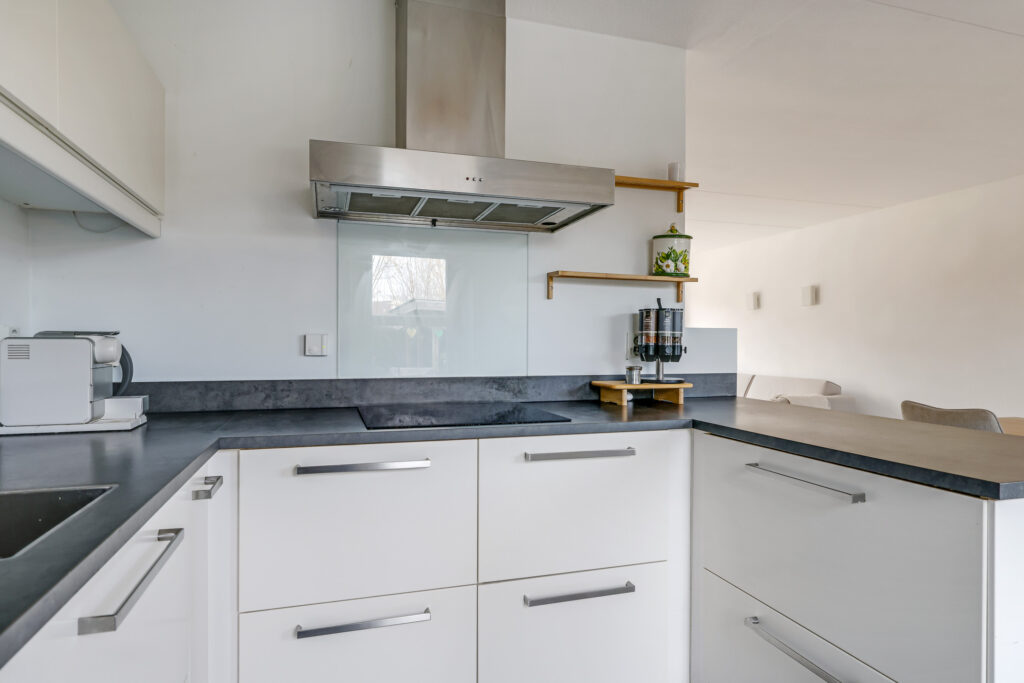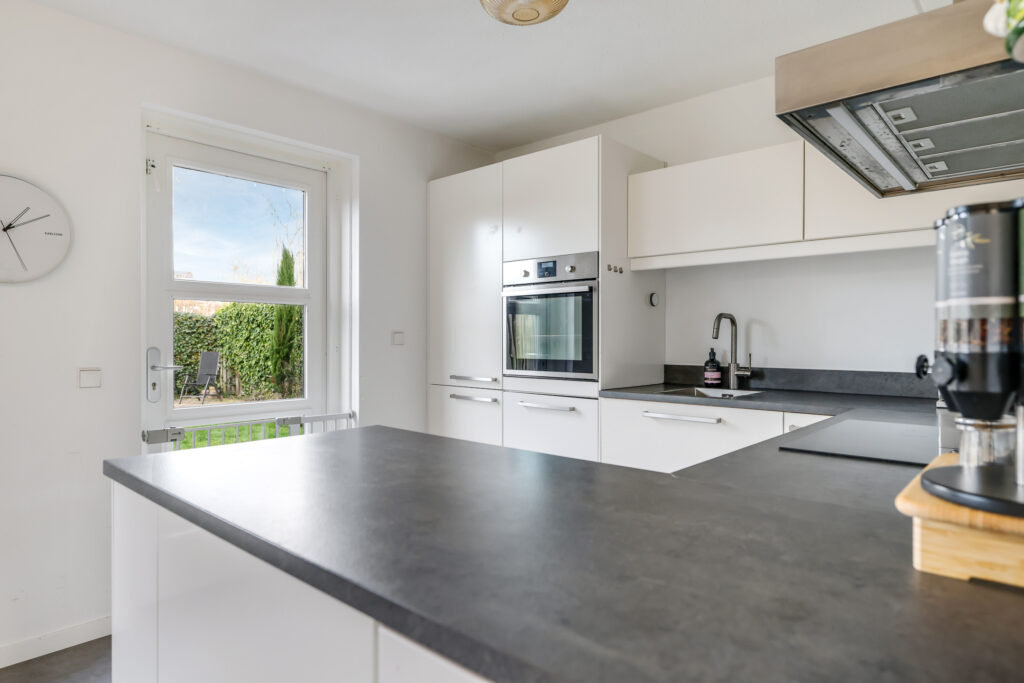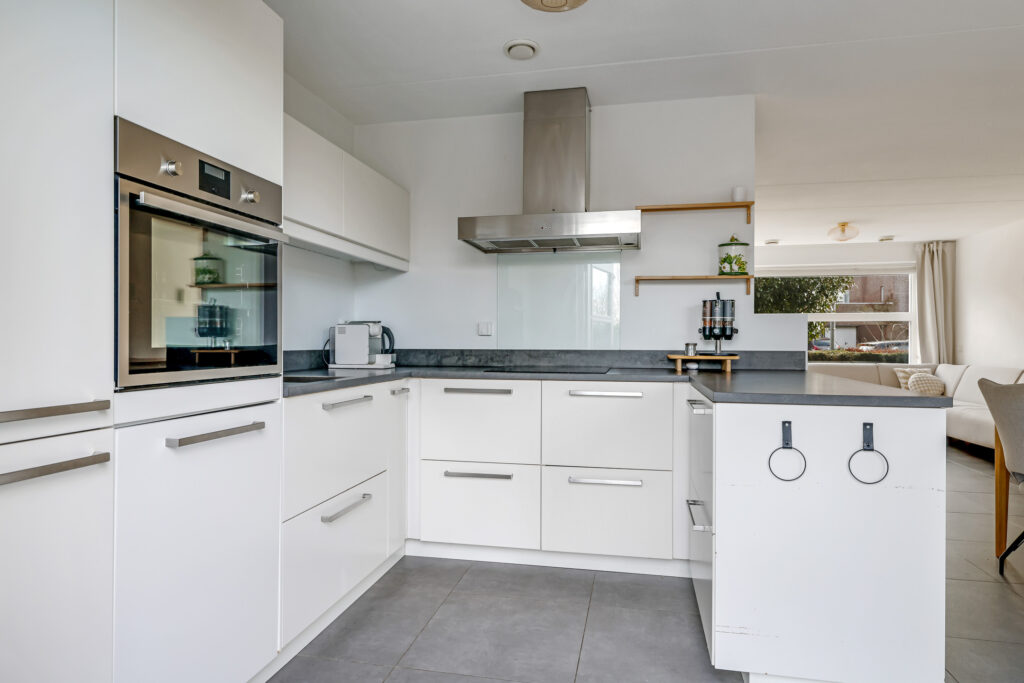 Deze keuken heeft een open karakter, zowel naar de woonkamer als naar de achtertuin (extra tuindeur). De keuken is in 2018 volledig vervangen door een moderne en neutrale inbouwkeuken waarbij er gekozen is voor een U-opstelling met schiereiland. De inbouwapparatuur bestaat uit een vaatwasser, een heteluchtoven, een 4-pits inductie kookplaat, een afzuigschouw met ‘luchtgordijn’ en een koel/vriescombinatie. Verder is de keuken praktisch ingedeeld met handige kastruimte zoals een draaicarrousel en bovenkastjes. Onder de bovenkastjes is extra verlichting geplaatst. Door het schiereiland heb je tevens veel aanrechtblad.