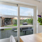Brede schuifpui in woonkamer naar zonnig buitenterras