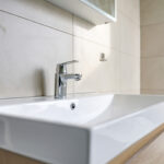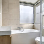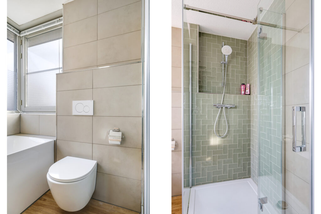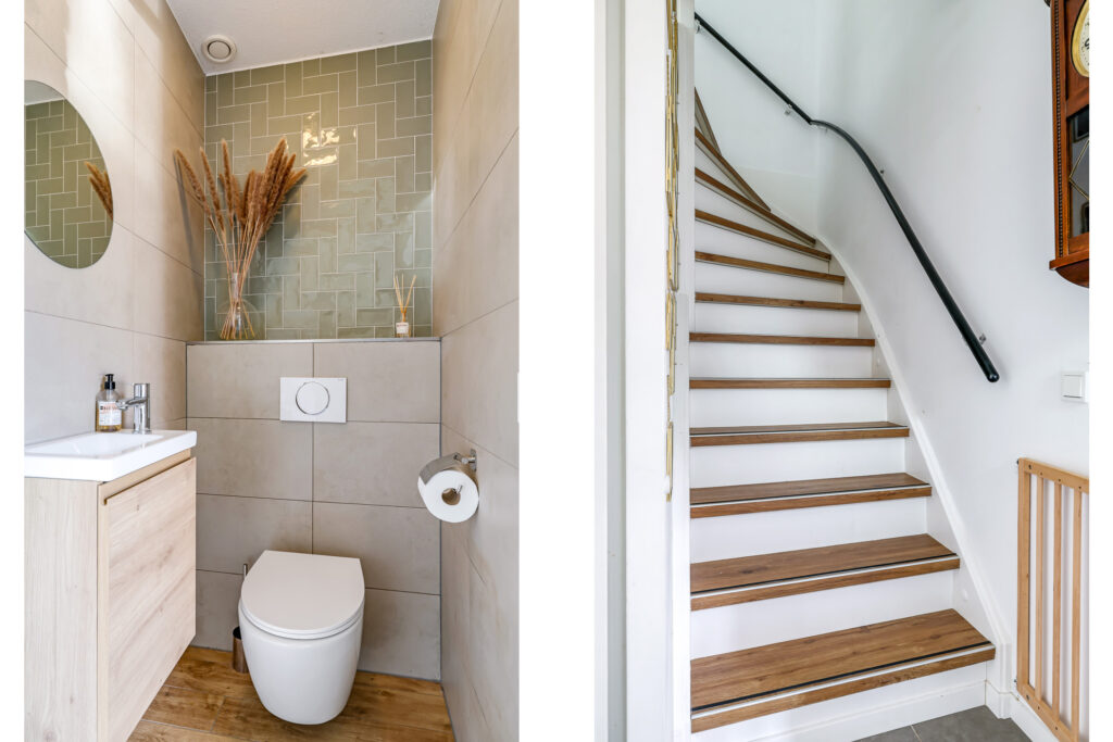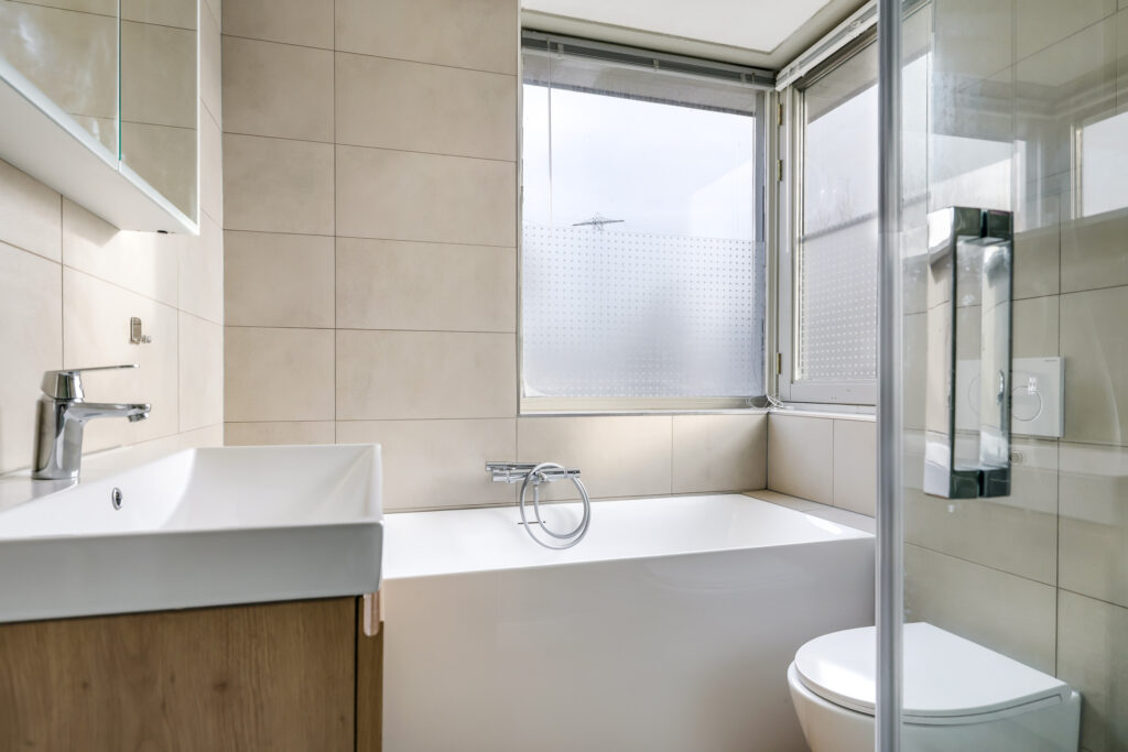 In 2023 zijn zowel de badkamer als het toilet op de begane grond volledig gerenoveerd. Dit zorgt voor moderne ruimtes met een eenduidige uitstraling. De badkamer is opvallend licht door het aanwezige hoekraam. Door de ruime opzet kan je al het wenselijke sanitair kwijt. Zo tref je hier een ligbad, een douche, een 2e toilet en een wastafelmeubel. Het wastafelmeubel is voorzien van 2 lades en een spiegelkast voor de nodige opbergruimte. Koude voeten hoef je hier niet te krijgen aangezien ook hier de vloerverwarming door loopt (incl. 1 ‘knuffelwand’).