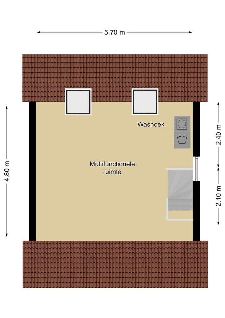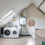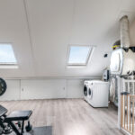 Via een vaste trap komen we op de 2e verdieping terecht. Deze verdieping is verrassend groot, mede door de hoge nok die op 3,8m ligt. Deze woonlaag biedt daardoor veel potentie om er een extra slaapkamer, een zoldervliering en bijvoorbeeld een wasruimte te creëren. Nu betreft het een open, multifunctionele woonlaag waar je eenvoudig een werkhoek en een gym kunt maken. Kinderen kunnen hier spelen en/of een hobby uitvoeren. De verkopers hebben 2 grote dakramen geplaatst waardoor je hier op de gehele verdieping geniet van veel lichtinval. In de hoek vind je de witgoedaansluitingen terug, alsmede de WTW-unit. Onder de schuine kappen is knieschot opbergruimte gecreëerd.