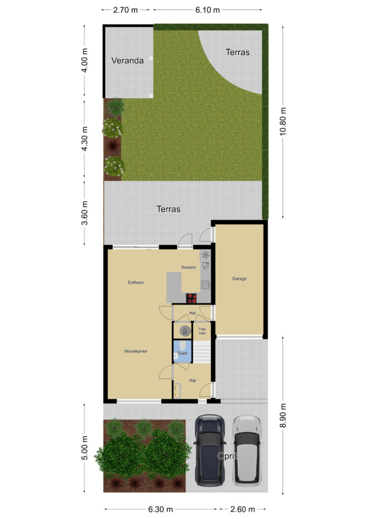 Vóór de garage ligt een prettige oprit waarbij je 2 auto’s naast elkaar kunt parkeren. Vaak is een oprit lang en smal waardoor je bij 2 auto’s achter elkaar parkeert. Hier is de oprit in de breedte aangelegd waardoor je naast elkaar kunt parkeren. Het eventueel omwisselen van auto’s is bij deze woning geen issue.