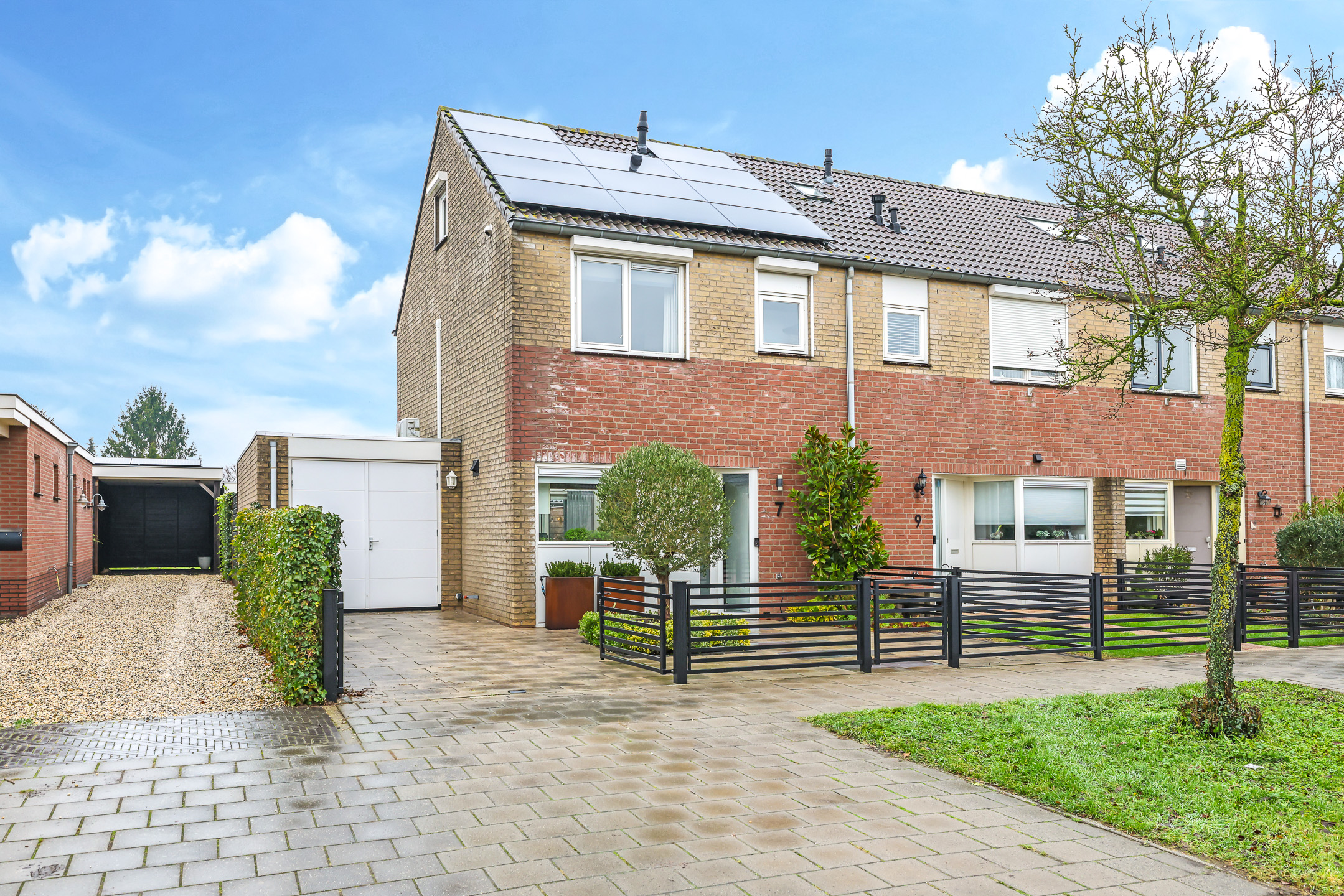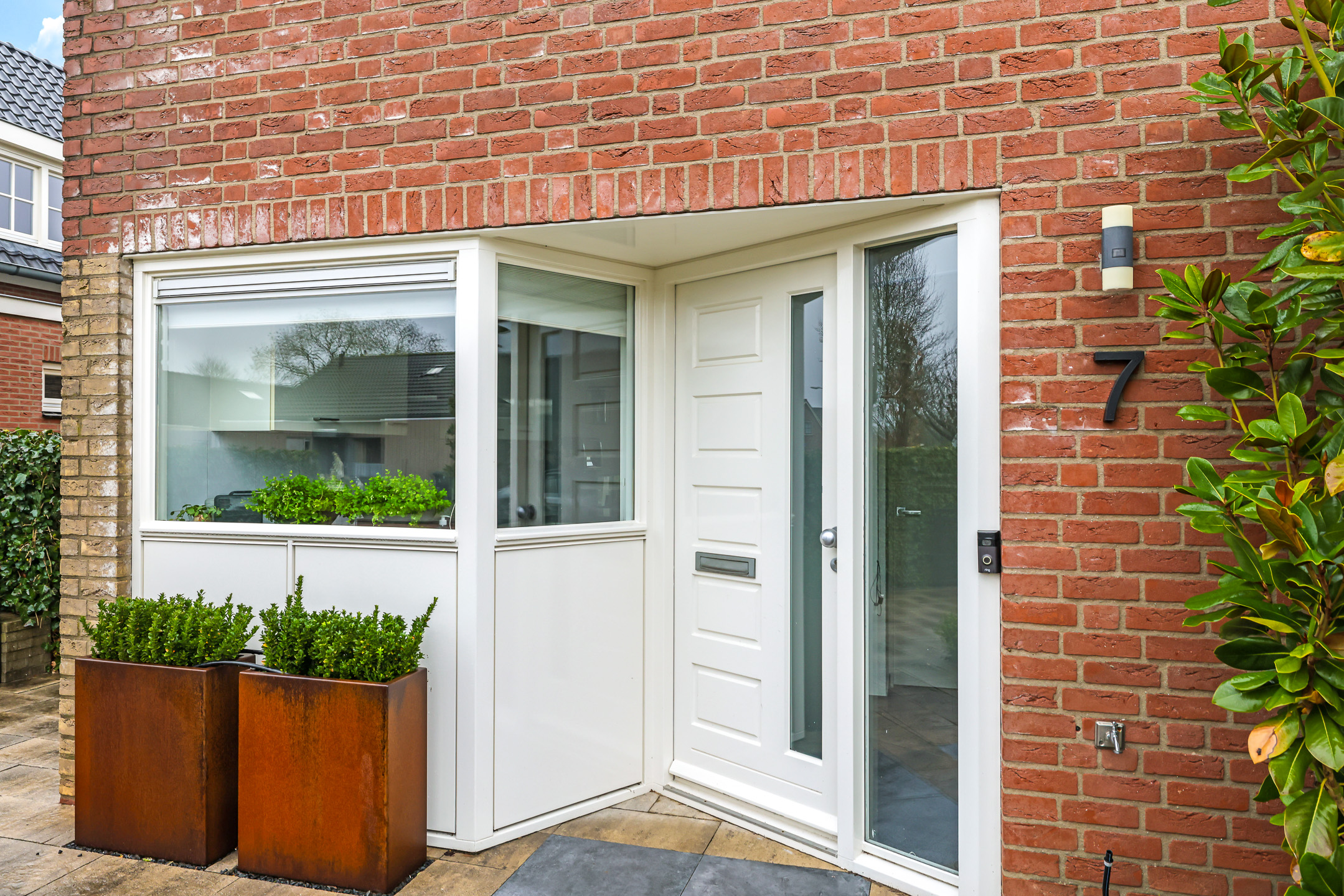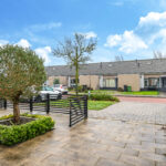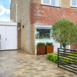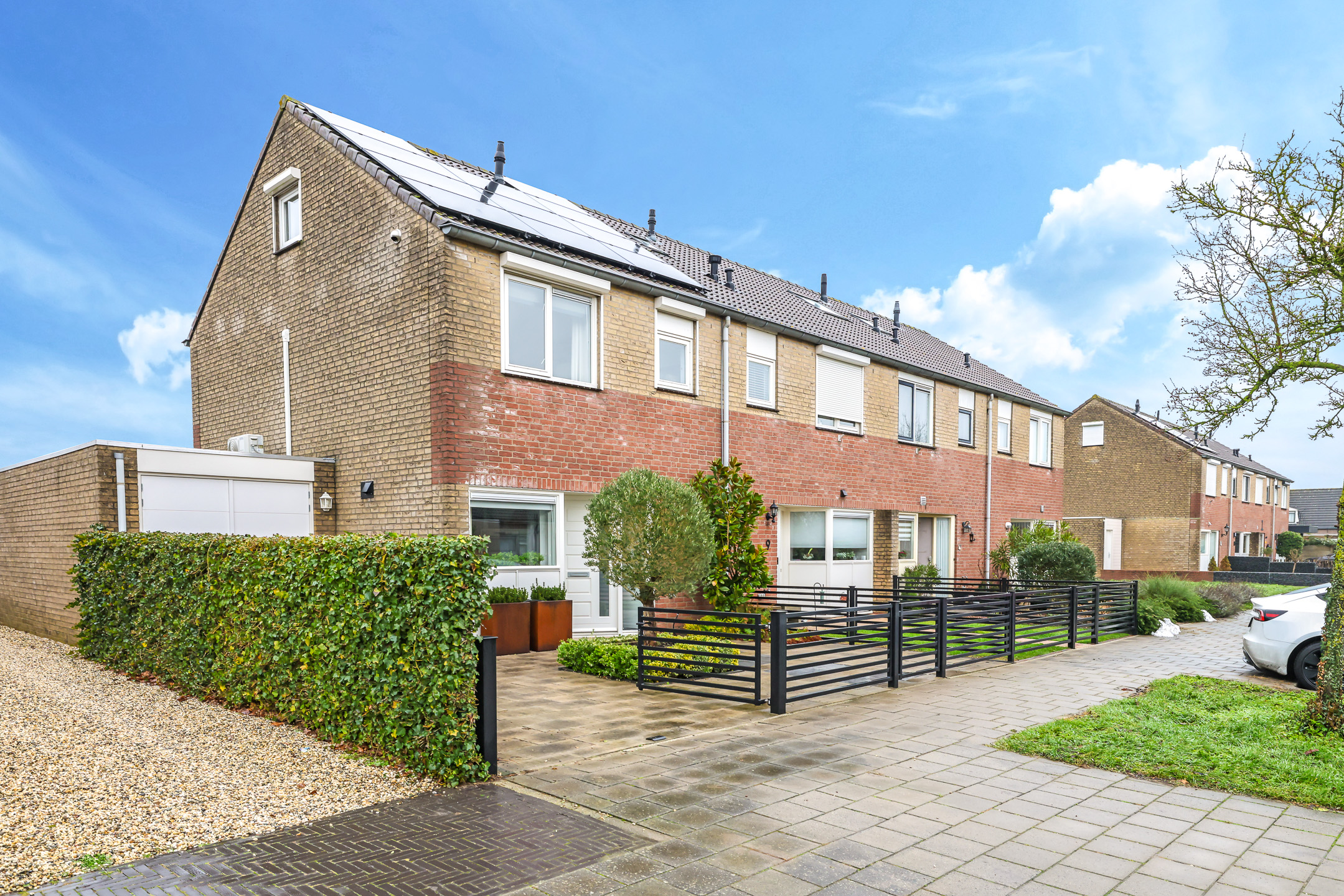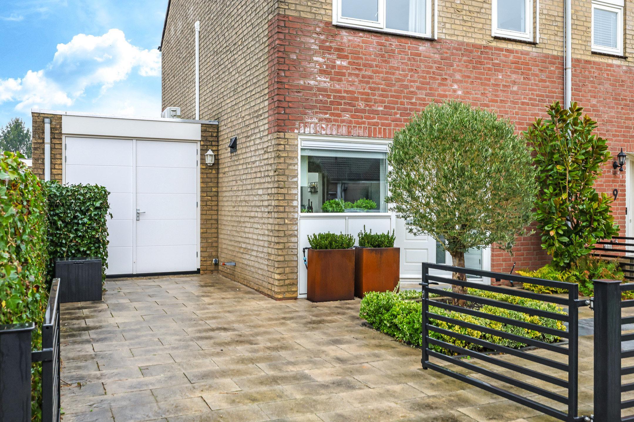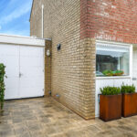 Voor de garage ligt een oprit van ca. 8m diep waardoor je ten alle tijden een auto op eigen terrein parkeert. Een stijlvol hekwerk zorgt voor een moderne afscheiding tussen de voortuin en de stoep.