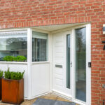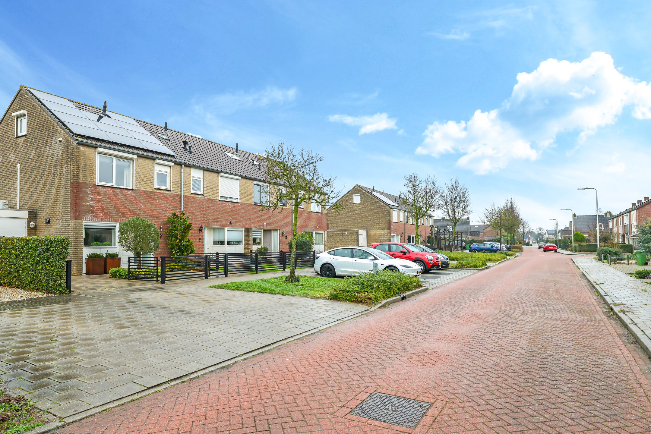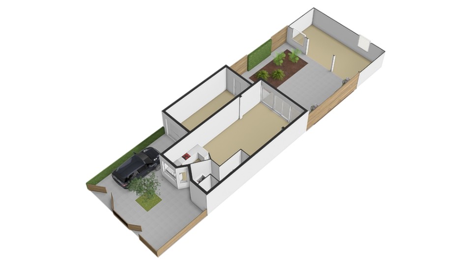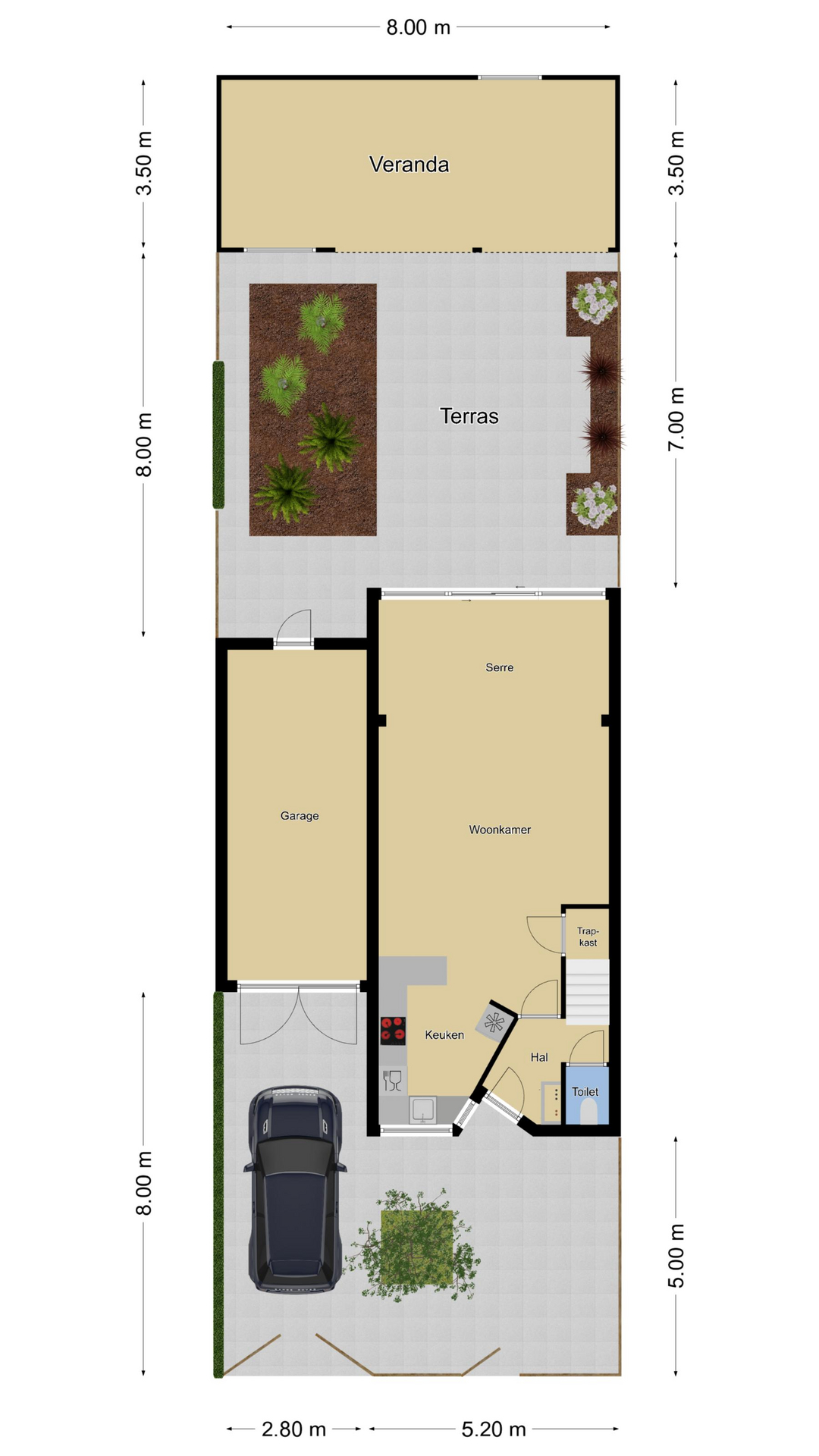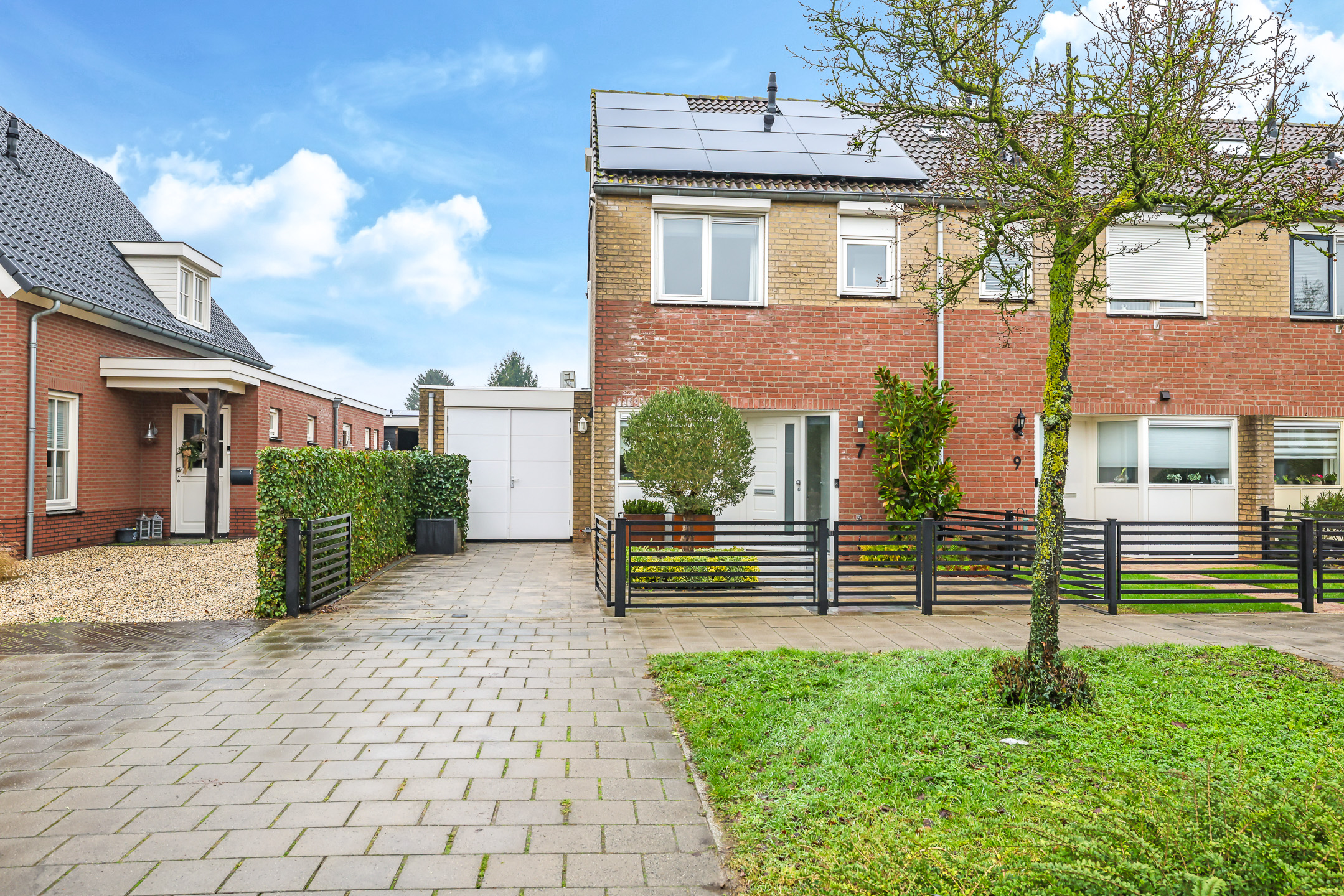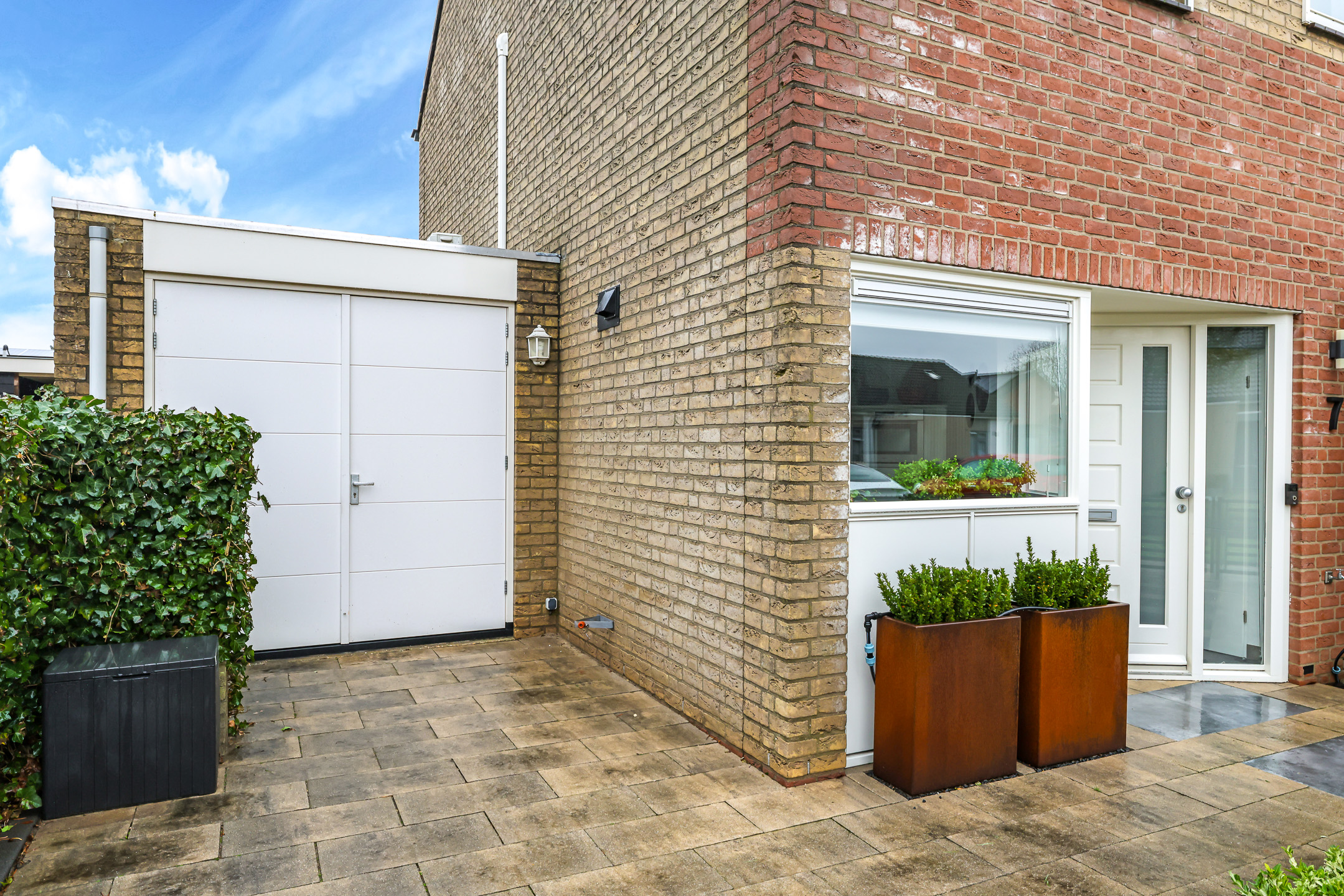 Voor de garage ligt een oprit van ca. 8m diep waardoor je ten alle tijden een auto op eigen terrein parkeert. Een stijlvol hekwerk zorgt voor een moderne afscheiding tussen de voortuin en de stoep.
