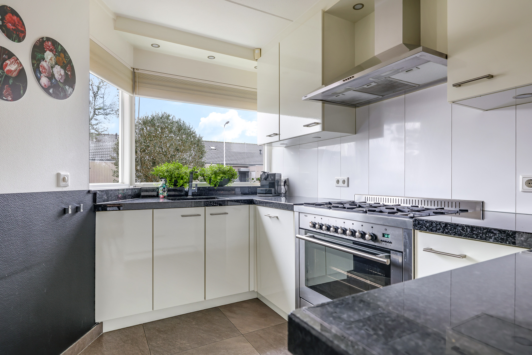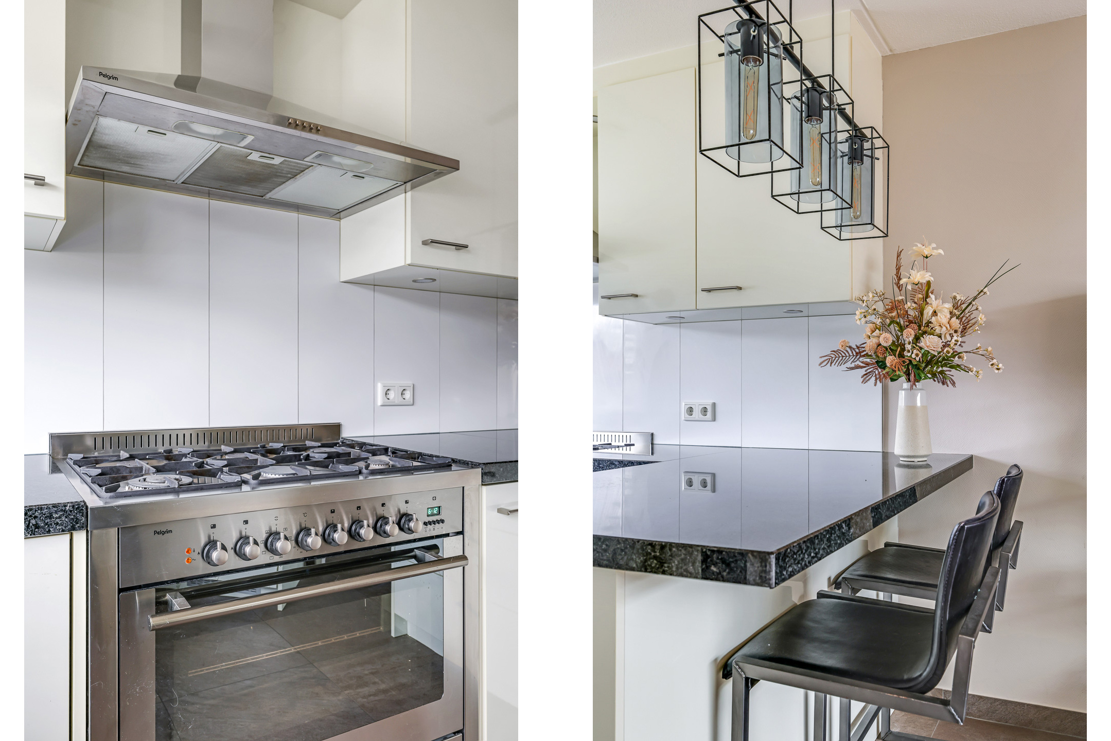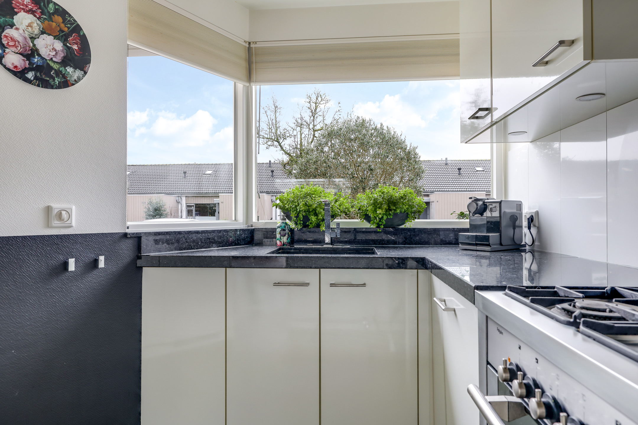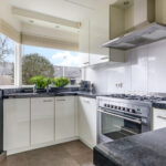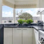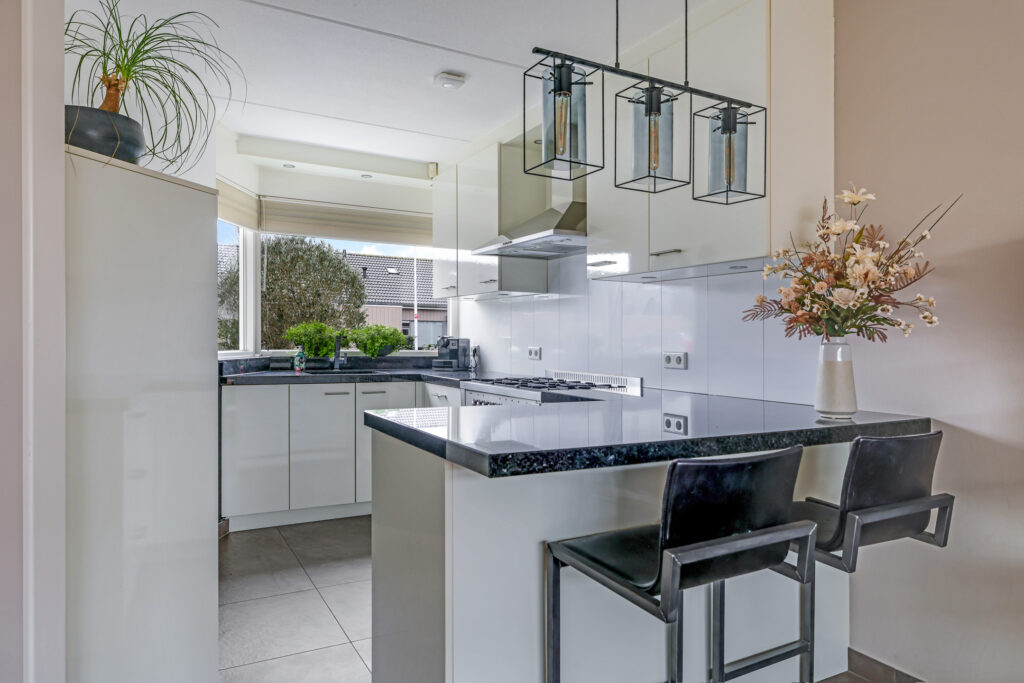 De keuken bevindt zich aan de voorzijde van de woning waardoor je tijdens het koken fijn de straat in kijkt. Er is gekozen voor een neutrale kleurstelling met witte fronten en een granieten werkblad. Met de schuine wand is creatief gewerkt door daar een extra kast te plaatsen. Hierdoor heb je maximaal veel opberg-/werkruimte in de keuken. Een leuk detail is het schiereiland wat zorgt voor nog meer ruimte maar wat ook zorgt voor een extra zithoekje wanneer je er 2 barstoelen bij plaatst. Hier neem je tijdens het koken fijn samen de dag door. De aanwezige inbouwapparatuur bestaat uit een 90-cm breed fornuis met 6 gaspitten, een afzuigkap, een vaatwasser, een koelkast, een combi-oven/magnetron.