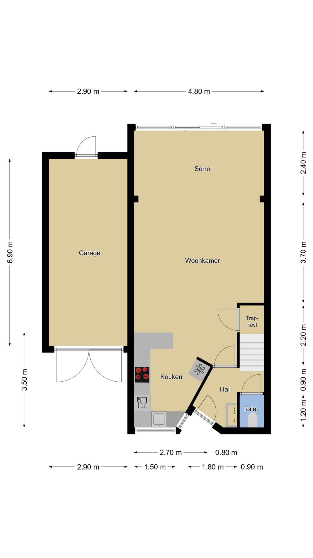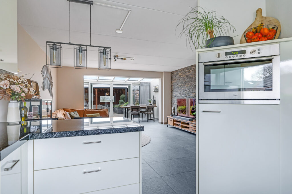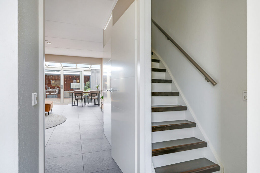 Dat deze woonkamer niet meer standaard is zal bij binnenkomst direct opvallen. Aan de achterzijde is een riante serre geplaatst waardoor je hier enorm veel lichtinval hebt. Overigens is er aan de buitenzijde van de serre zonwering aanwezig (elektrisch bedienbaar). Daarbij heeft het de woonkamer verlengd waardoor er nóg meer leefruimte is ontstaan. Door de aanwezige vloerverwarming (ook in de serre) heb je hier een aangenaam woonklimaat. De groot formaat plavuizen zorgen voor een rustige, neutrale uitstraling van de ruimte. Opvallend zijn de hardstenen vensterbanken die luxe uitstralen, deze vind je overigens door het hele huis terug. Onder de trap is een diepe trapkast aanwezig voor de nodige opbergruimte.