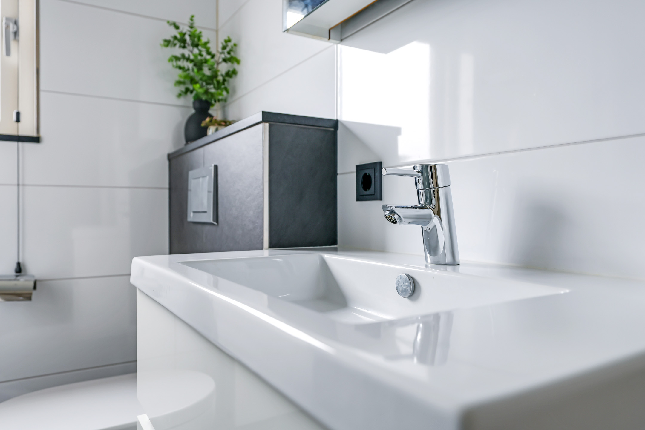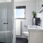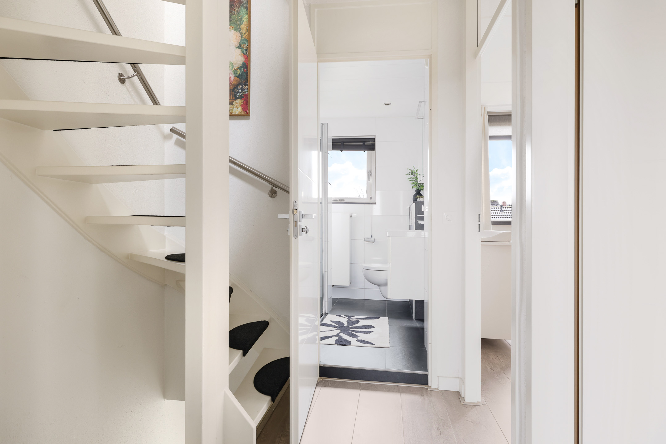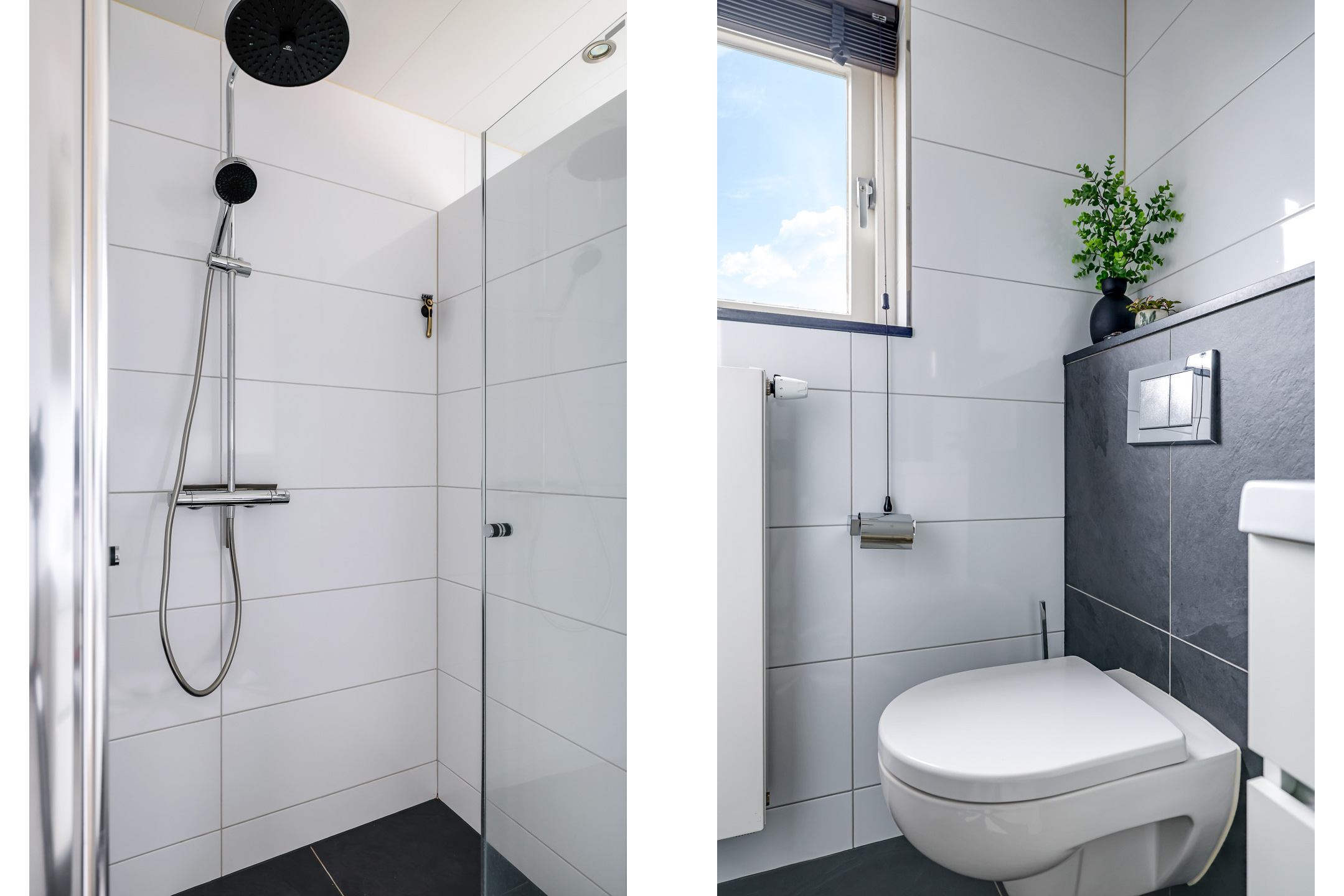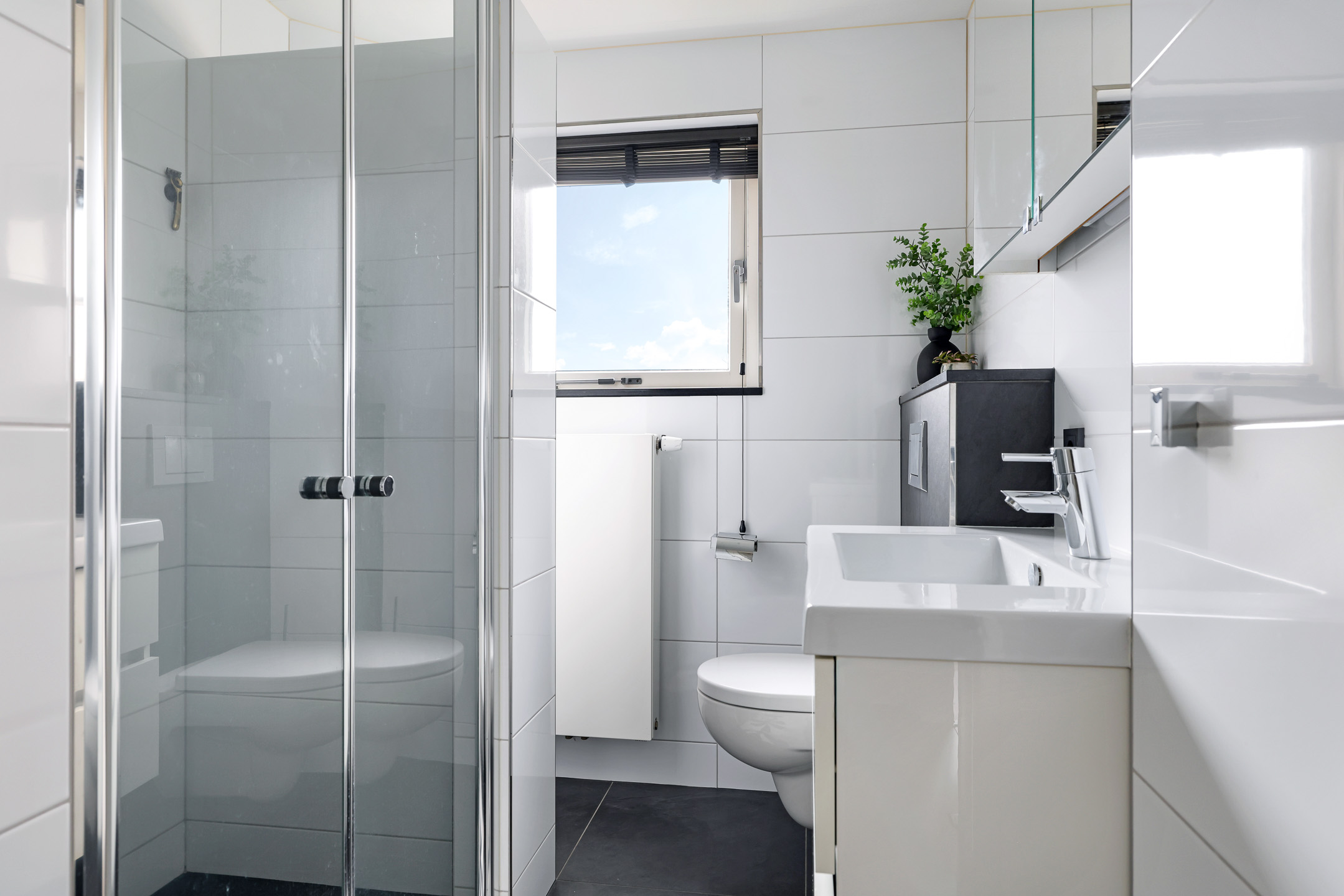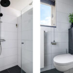 De laatste deur op de overloop is van de badkamer. Deze ruimte is ingedeeld met onder andere een brede inloopdouche, een wastafelmeubel en een 2e toilet (zwevend geplaatst). Er is gekozen voor een groot formaat tegel voor zowel de witte wandtegels als de antracietkleurige vloertegels. In het plafond is spotverlichting ingebouwd. Een groot raam zorgt voor daglicht en een fijne ventilatiemogelijkheid.