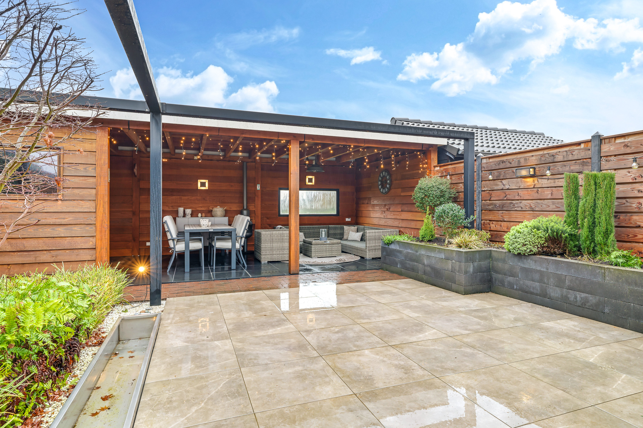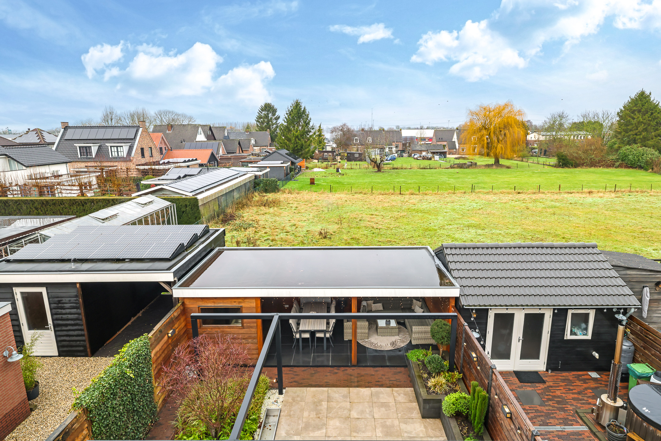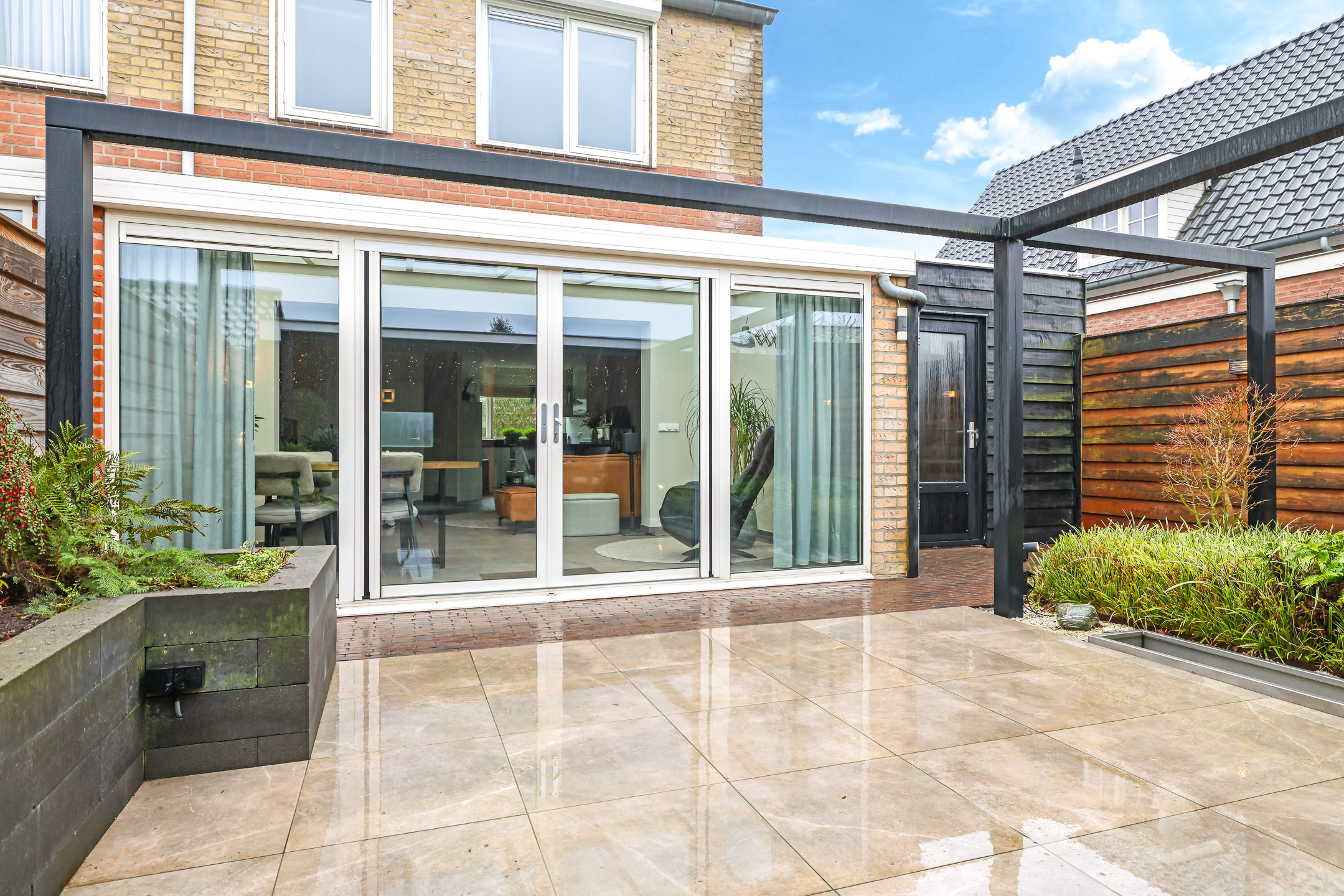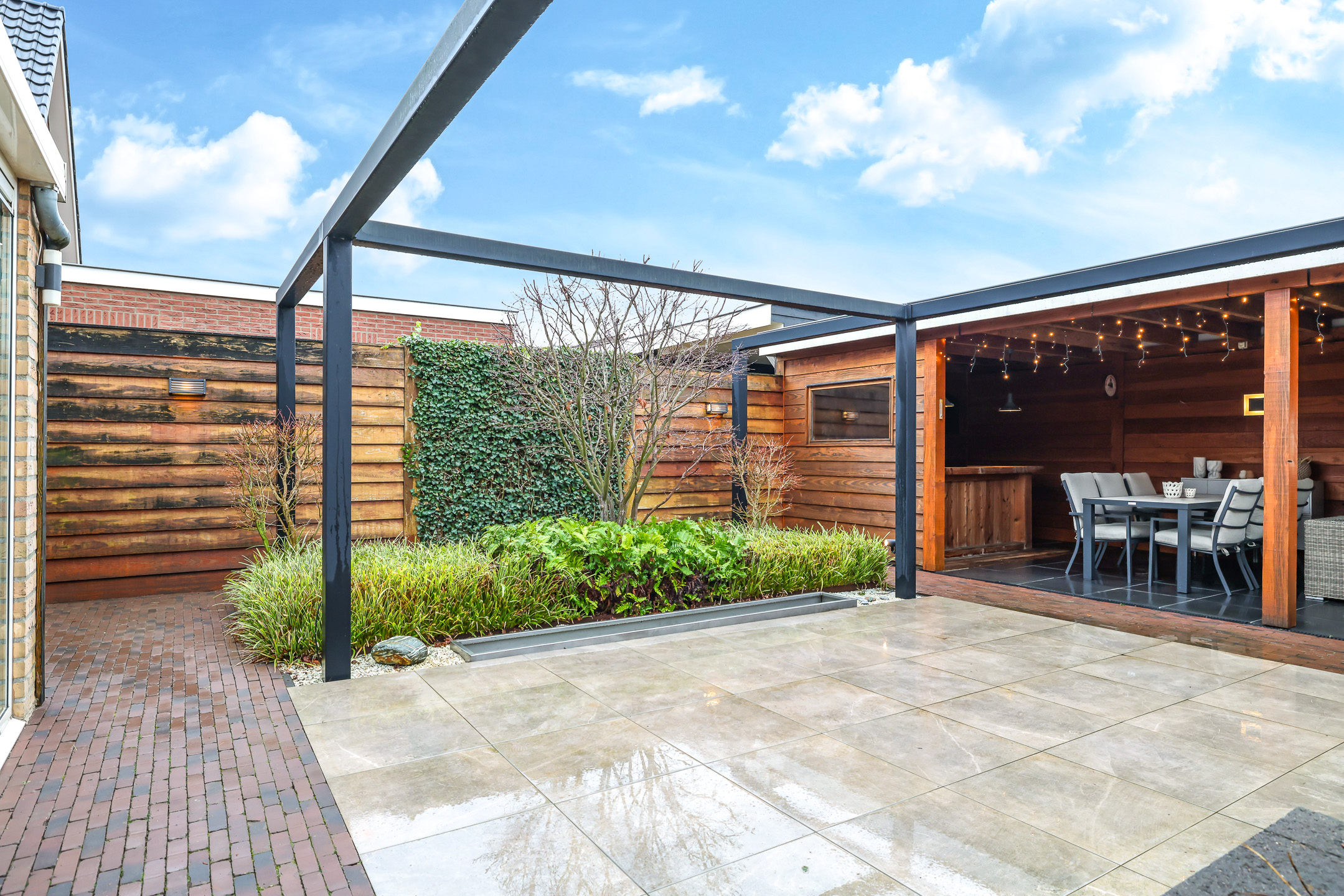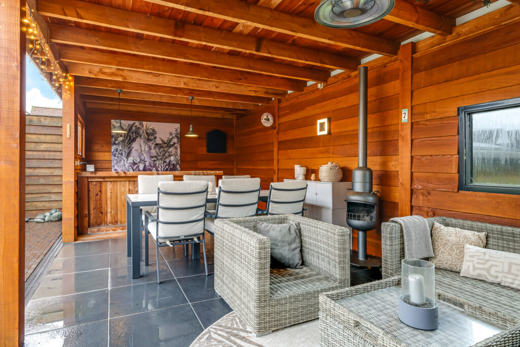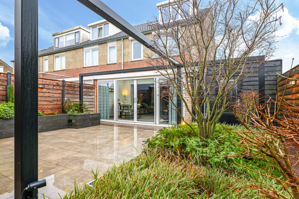 Bij een comfortabele woning hoort een eveneens comfortabele tuin. Het grootste pluspunt van deze tuin staat achterin. Hier tref je namelijk een riante terrasoverkapping/veranda van bijna 30m² groot. Hier kan je met gemak meerdere zithoeken kwijt. Een leuk detail is de bar met wastafel (wateraansluiting aanwezig, niet aangesloten) welke ideaal is voor de borrelavond of de barbecue. Door de ruit in de achterzijde van deze overkapping kijk je ook nog een vrij weg over weilanden waar af en toe paarden grazen. De tuin is verder aangelegd met een groot terras van keramische tegels, met aan de ene kant een verhoogde borderbak en een de andere kant een lage border met diverse planten en struiken. Buitenom het terras een fraai aangelegd pad van gebakken waaltjes. Verder is er ook een robuuste stalen pergola geplaatst, welke niet alleen een stoer en modern accent aan de tuin geeft, maar tevens de mogelijkheid biedt om een schaduwdoek of sfeervolle verlichting te bevestigen. Hierdoor is eenvoudig extra comfort en sfeer te creëren, passend bij ieder moment van de dag.