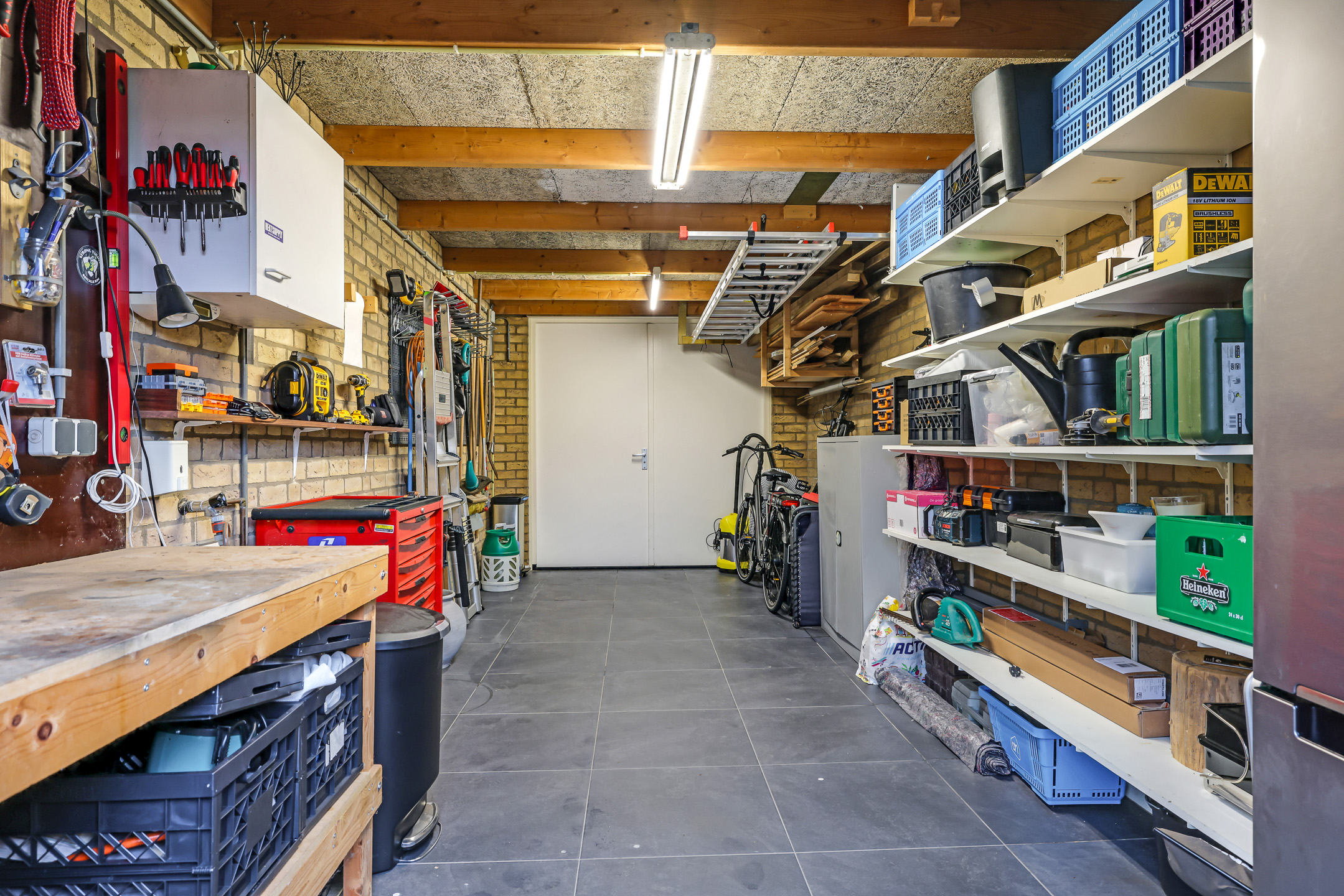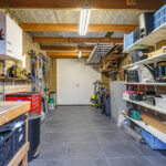 Naast de woning is een garage aangebouwd. De garage is een meter langer dan gemiddeld waardoor je hier lekker veel ruimte hebt. Aan de voorzijde bieden dubbele deuren toegang tot de oprit, aan de achterzijde is tevens een toegang tot de tuin. Er is een antracietkleurige tegelvloer ingelegd waardoor de ruimte er verzorgd uit ziet. Er is elektra én een wateraansluiting aanwezig waardoor dit de ideale ruimte is voor je hobby of om te klussen.