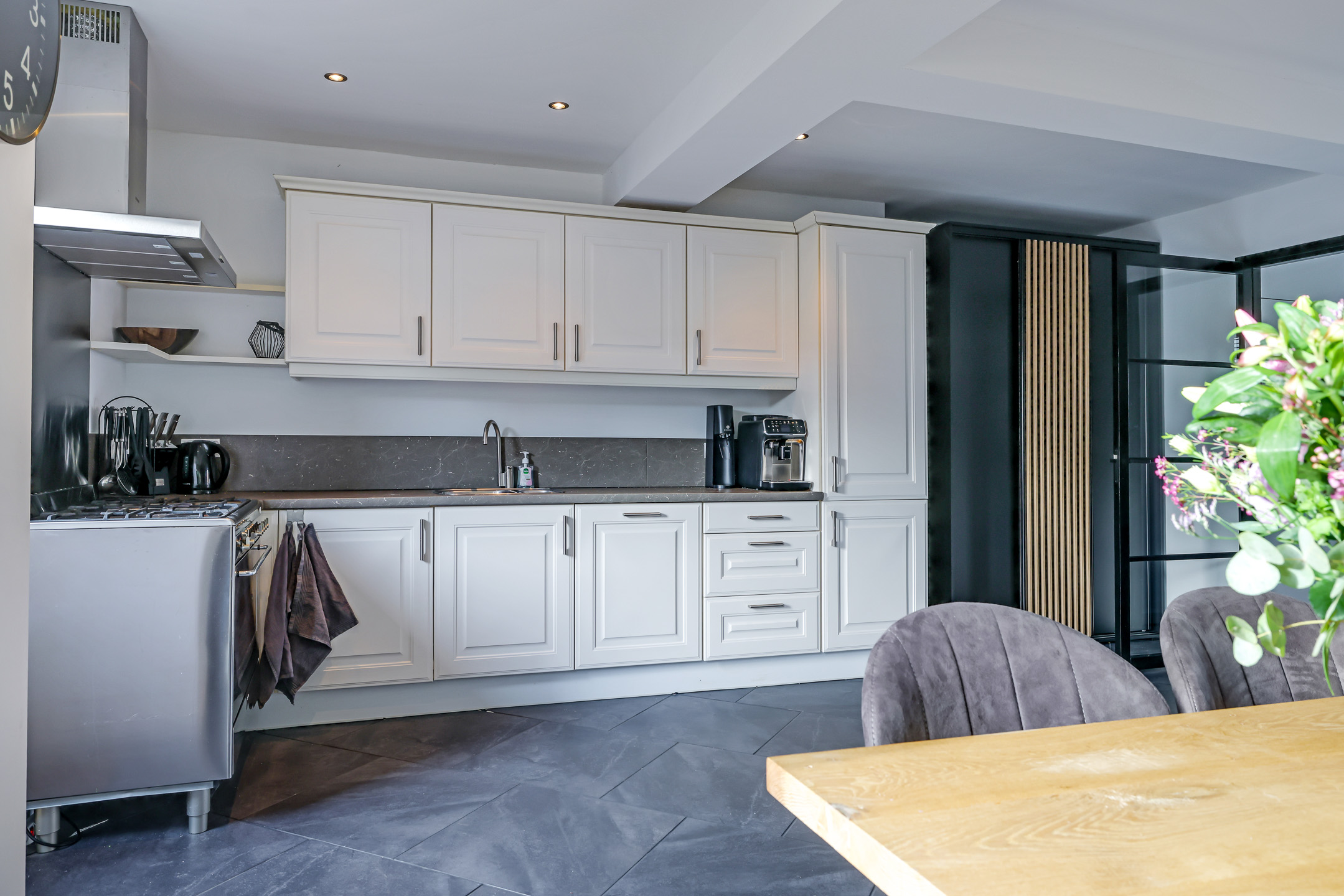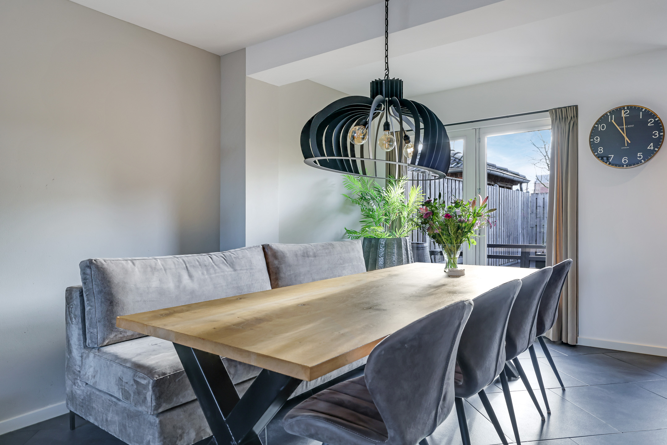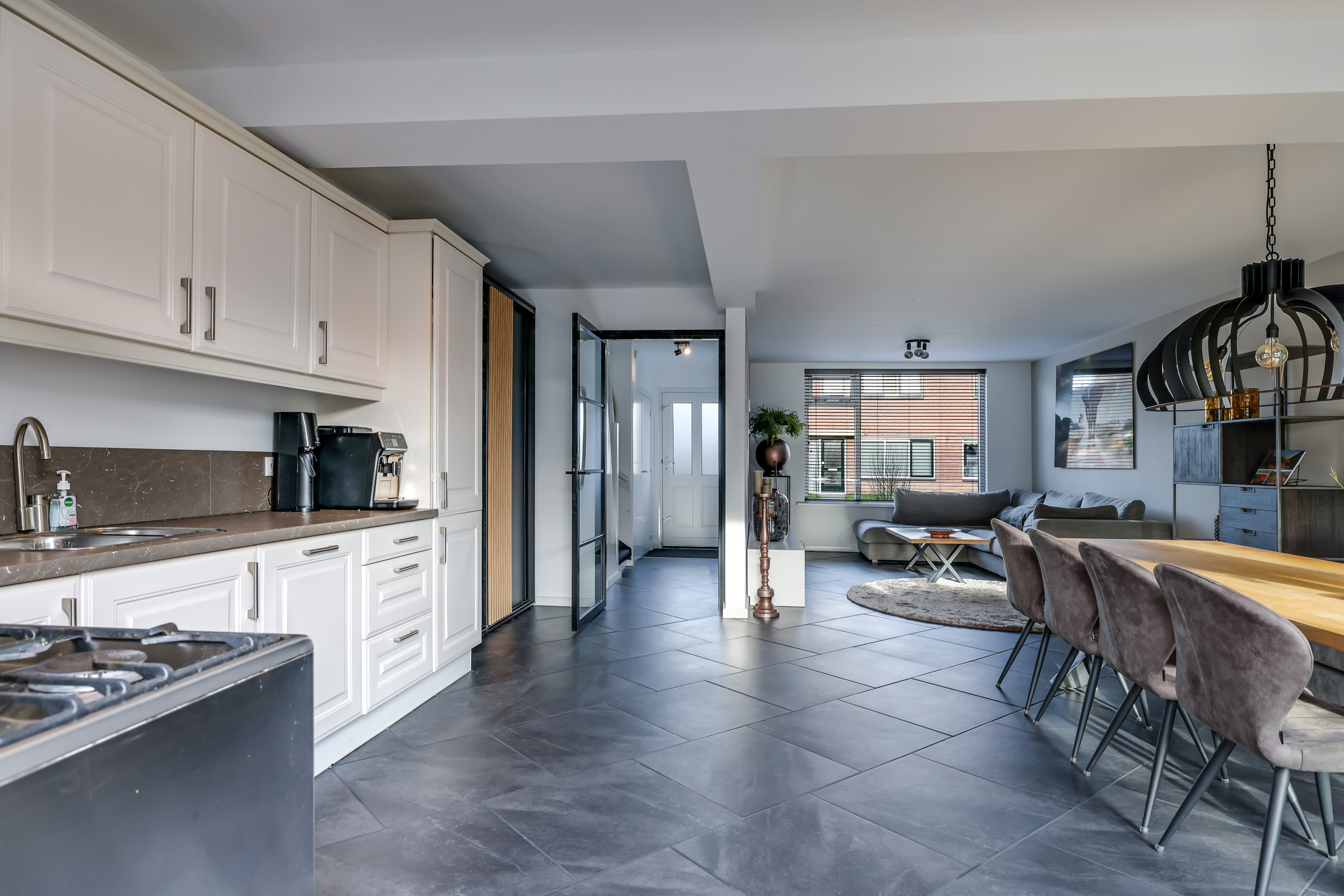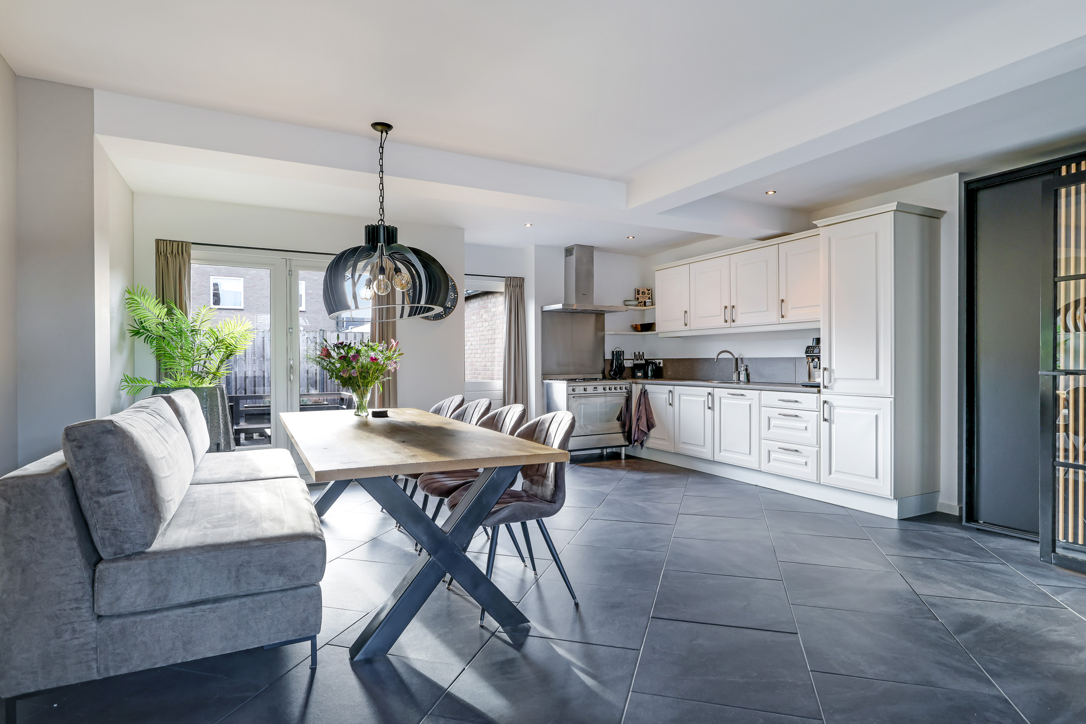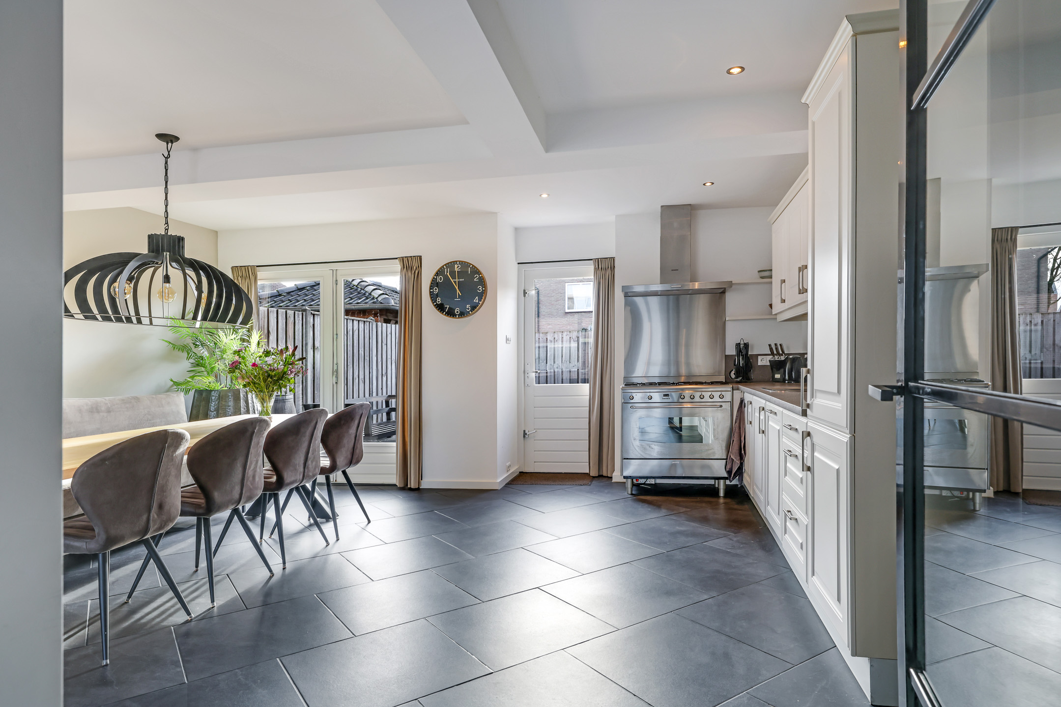 Door deze uitbouw en het openbreken van de keuken is de leefruimte op de begane grond aanzienlijk vergroot. Het zal dan ook niet verbazen dat je hier met gemak een 8-persoons eettafel en een grote zithoek kwijt kan. Dubbele terrasdeuren in de achtergevel zorgen dat je hier in de zomerdag zo de tuin in loopt. Onder de plavuizen ligt vloerverwarming, hierdoor heb je een aangenaam klimaat en geen radiatoren in het zicht. De gestucte wanden en het plafond zorgen daarbij voor een moderne uitstraling.