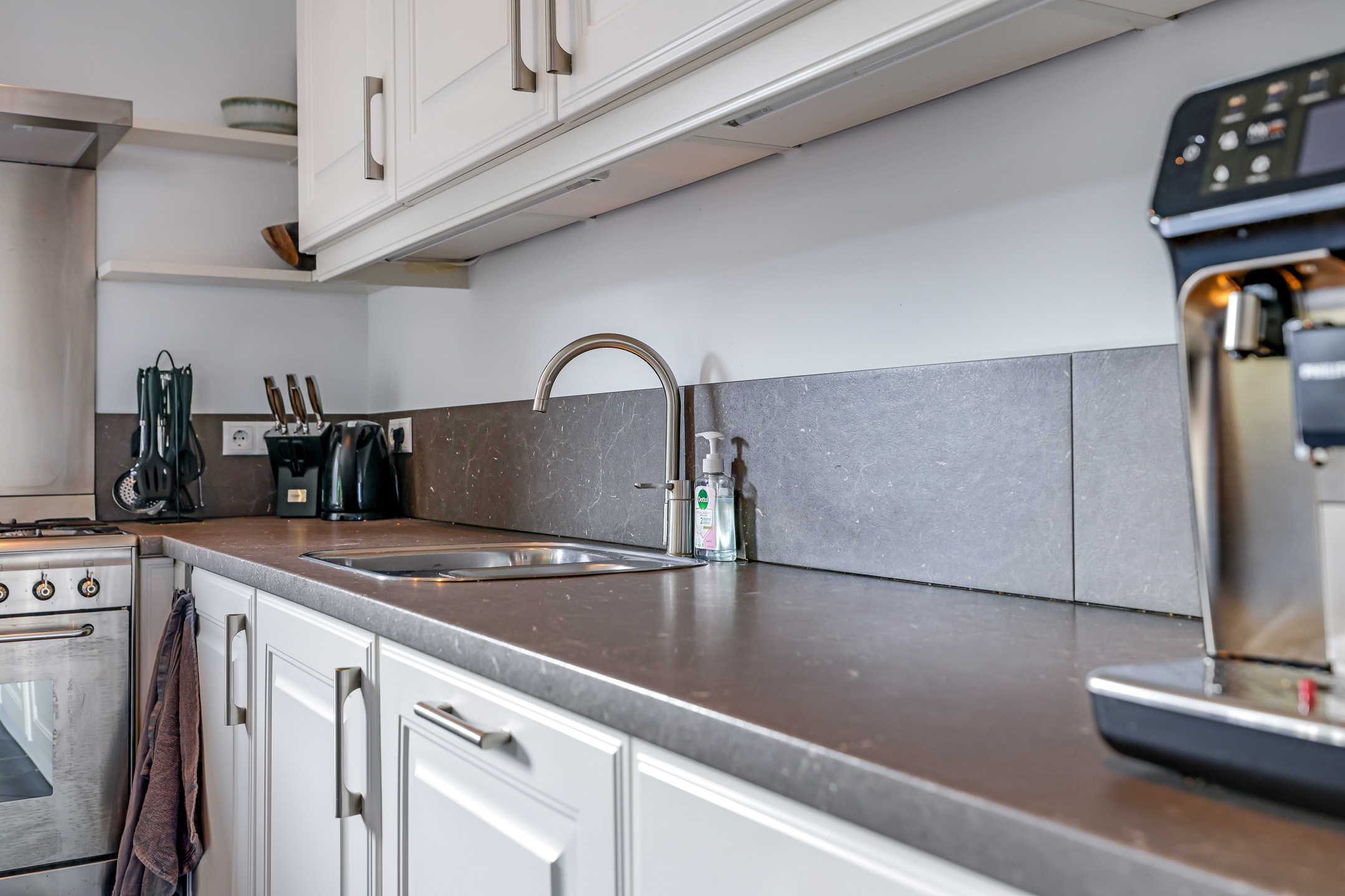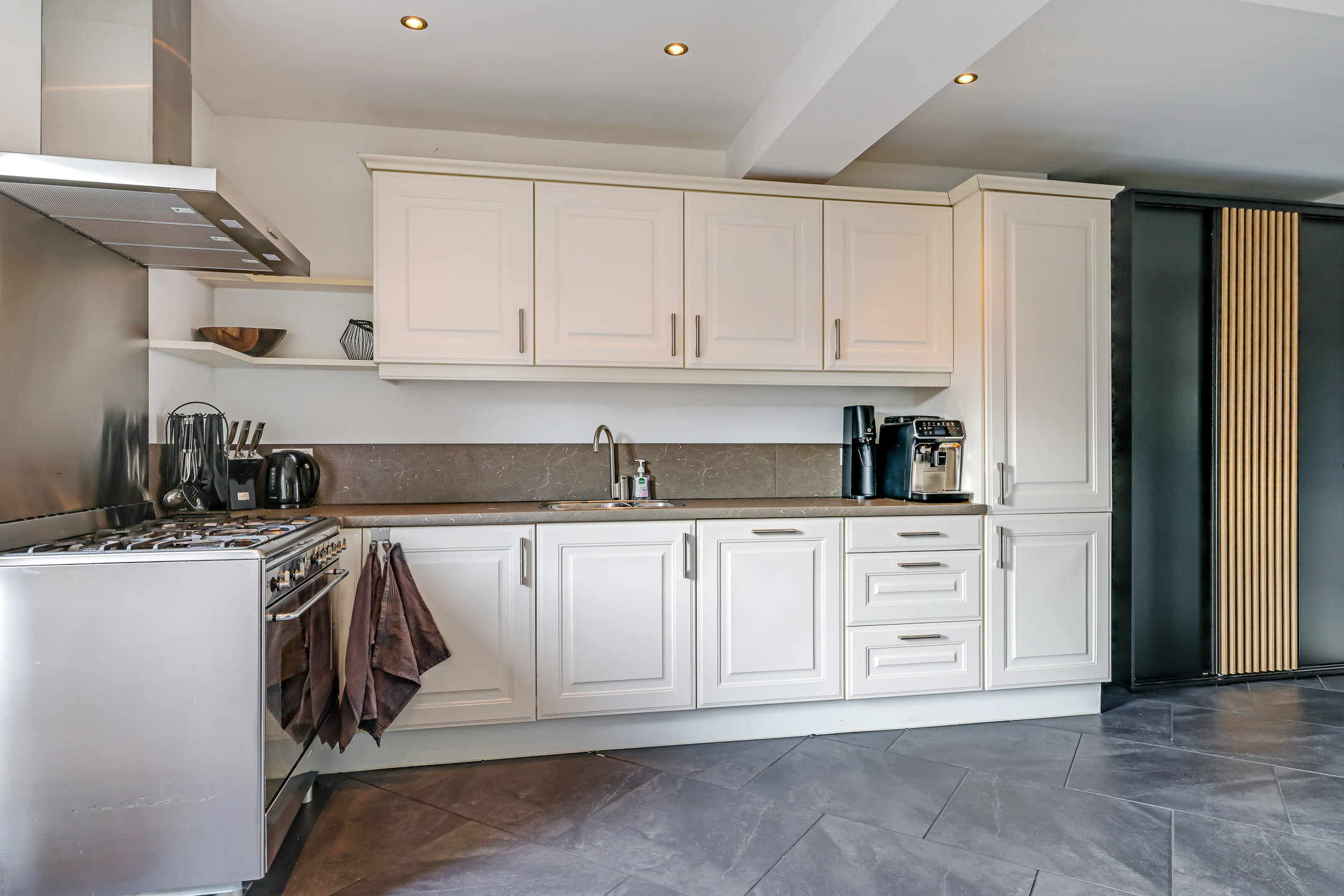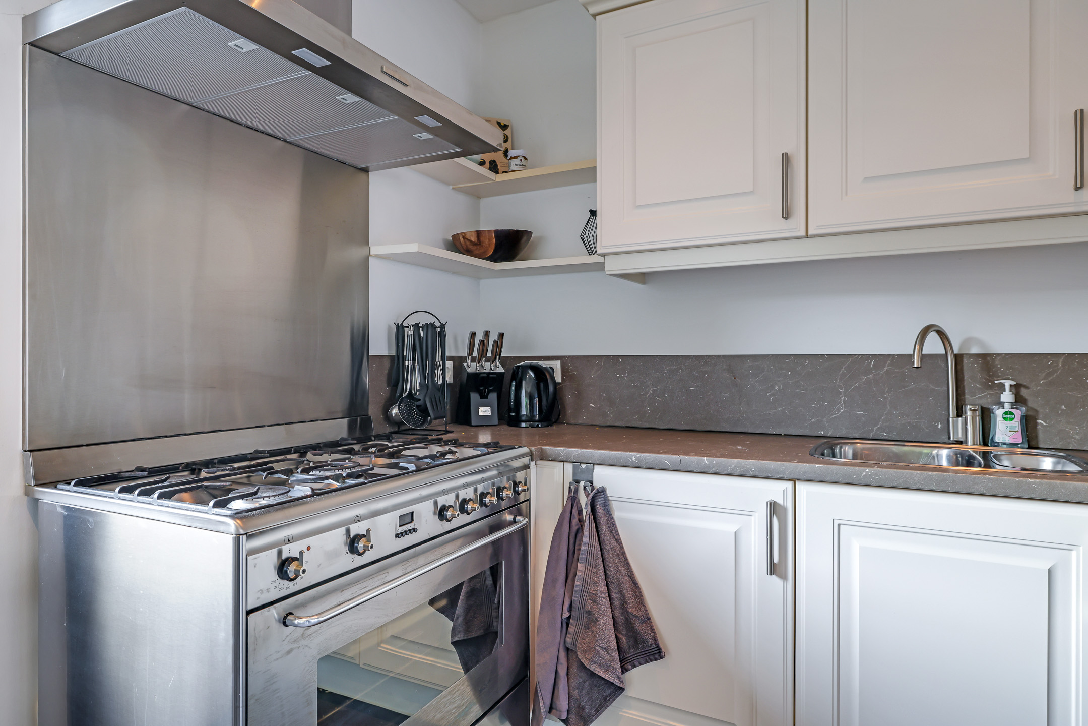 Van origine heeft deze woning een dichte keuken. Echter is bij deze woning de keuken opengebroken en vergroot de keuken meer een onderdeel is geworden van de leefruimte. De keuken is in een hoekopstelling geplaatst met diverse bovenkasten waardoor je veel opbergruimte treft. Opvallend is het brede fornuis met een grote oven en 5 gaspitten. De inbouwapparatuur bestaat uit een koel/vriescombinatie, en een vaatwasser.