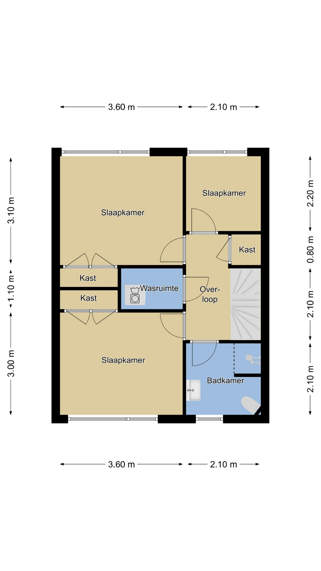 Via een prettige trapopgang in de hal bereiken we de 1e verdieping. Hier vinden we 3 slaapkamers, de badkamer en de wasruimte. De slaapkamers zijn respectievelijk 11m2, 11m2 en 4,5m2 groot. Grote raampartijen zorgen hier voor een fijne lichtinval. De slaapkamer aan de voorzijde heeft een rolluik waardoor deze geheel te verduisteren is. De twee grotere slaapkamers hebben ieder een vaste inbouwkast. Op de overloop is nog een 3e vaste kast aanwezig. De kleinere kamer zou een prima werk- of logeerkamer kunnen zijn.