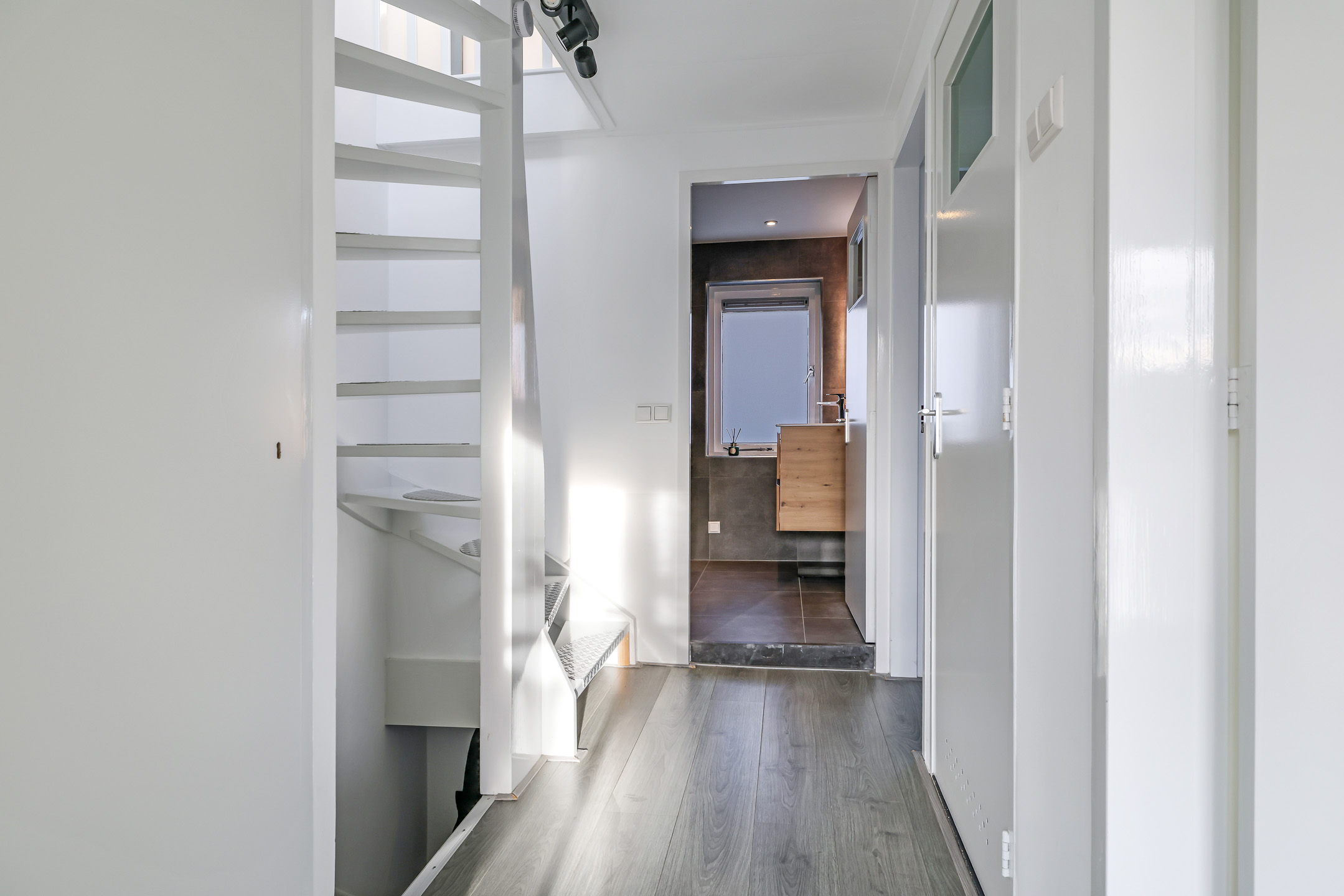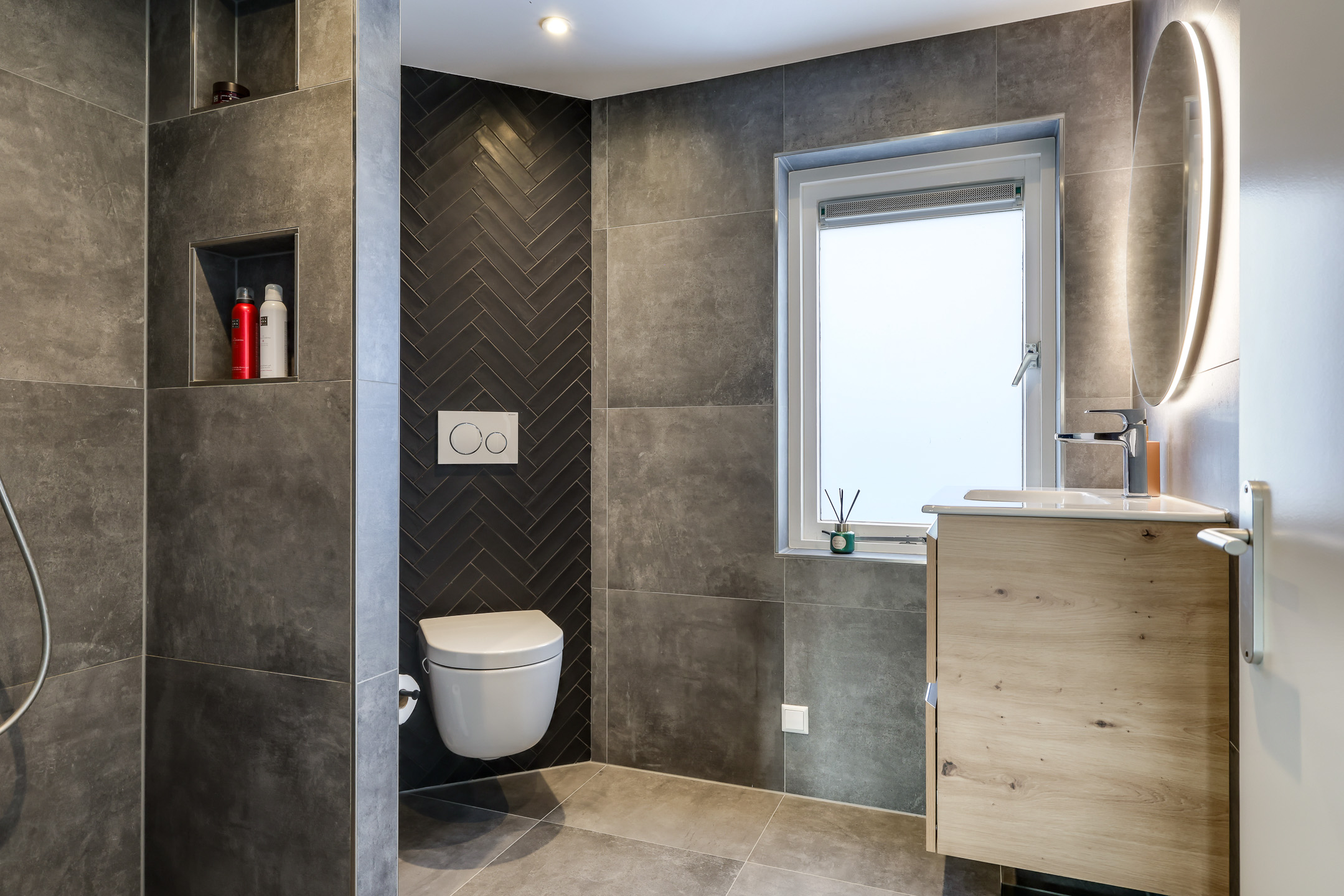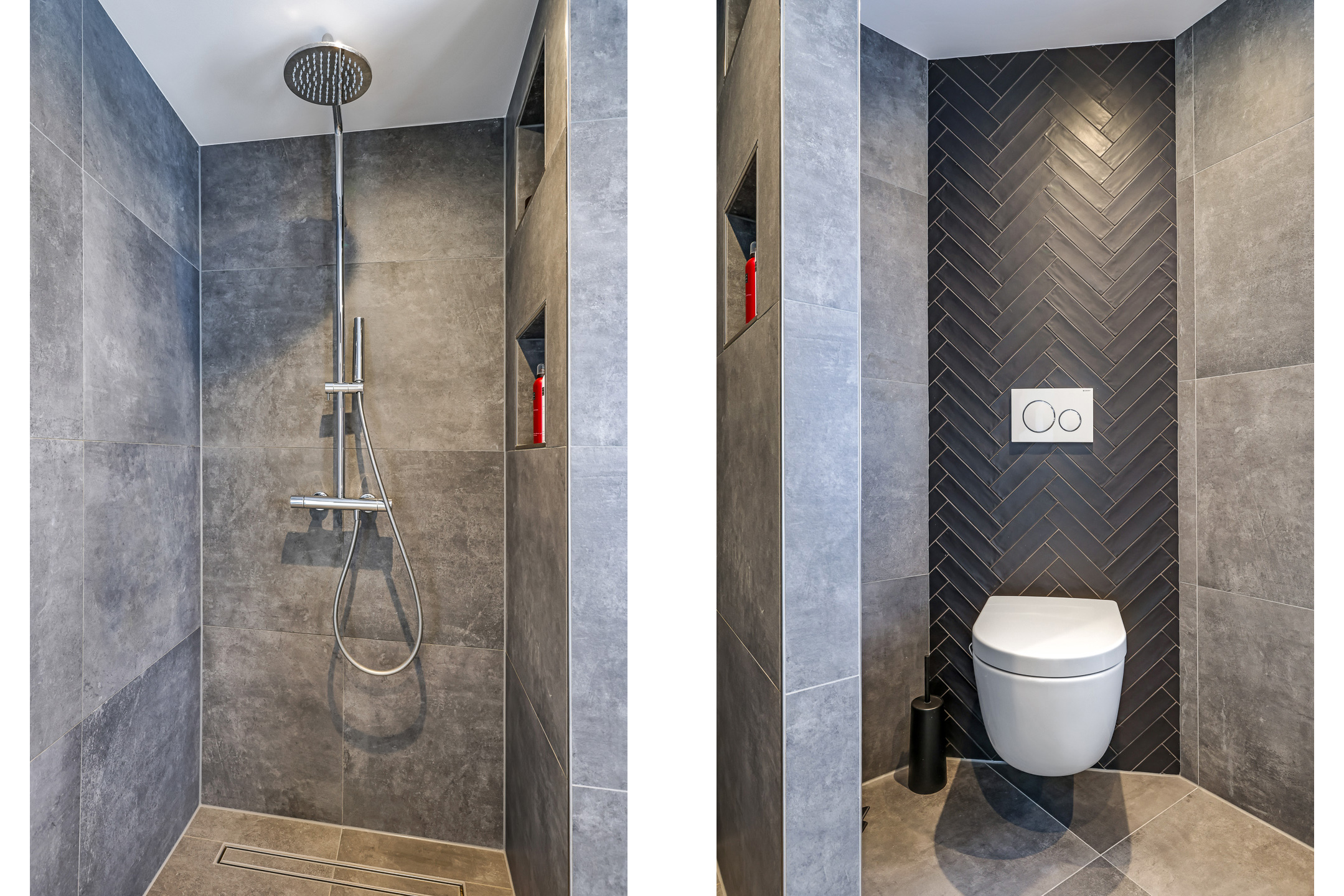 De van oorsprong 4e slaapkamer is dus opgeofferd voor een badkamer. De huidige badkamer is in 2022 geplaatst en is ingedeeld met een ruime inloopdouche, en 2e toilet (zwevend geplaatst) en een wastafelmeubel. Groot formaat tegels in antraciettinten zorgen voor een luxe uitstraling. Net als de inbouwspots en het aanwezige raam. Deze zorgt niet alleen voor een fijne lichtinval, maar ook voor de ideale ventilatiemogelijkheid. Aangenaam is de aanwezige vloerverwarming waardoor je hier nooit koude voeten hebt.