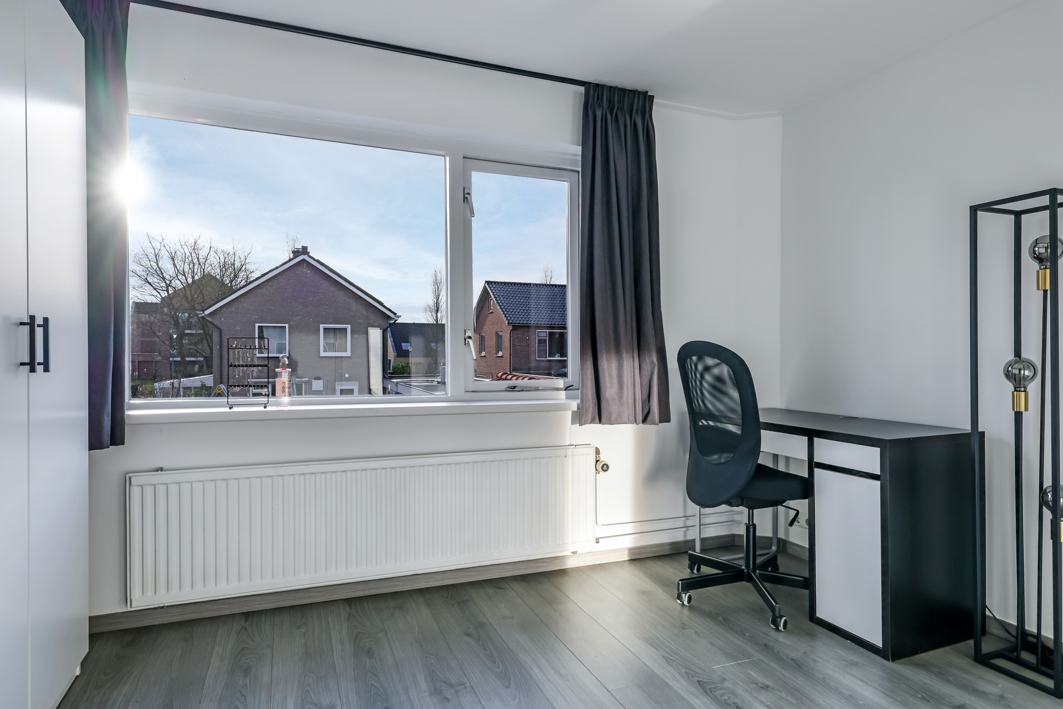Een 2e vaste trap geeft toegang tot de 2e verdieping. Door een scheidingswand is deze woonlaag opgedeeld in een voorzolder en een 4e slaapkamer. Beide ruimtes hebben een groot dakraam waardoor je veel lichtinval hebt. Op de voorzolder is naast bergruimte ook de opstelling van de cv-ketel terug te vinden. Met 10m2 oppervlakte (gemeten vanaf 1,5m hoogte) is de 4e slaapkamer volwaardig te noemen. Mocht je het wensen dan zou je de ruimte zelfs nog kunnen vergroten door een dakkapel te plaatsen.