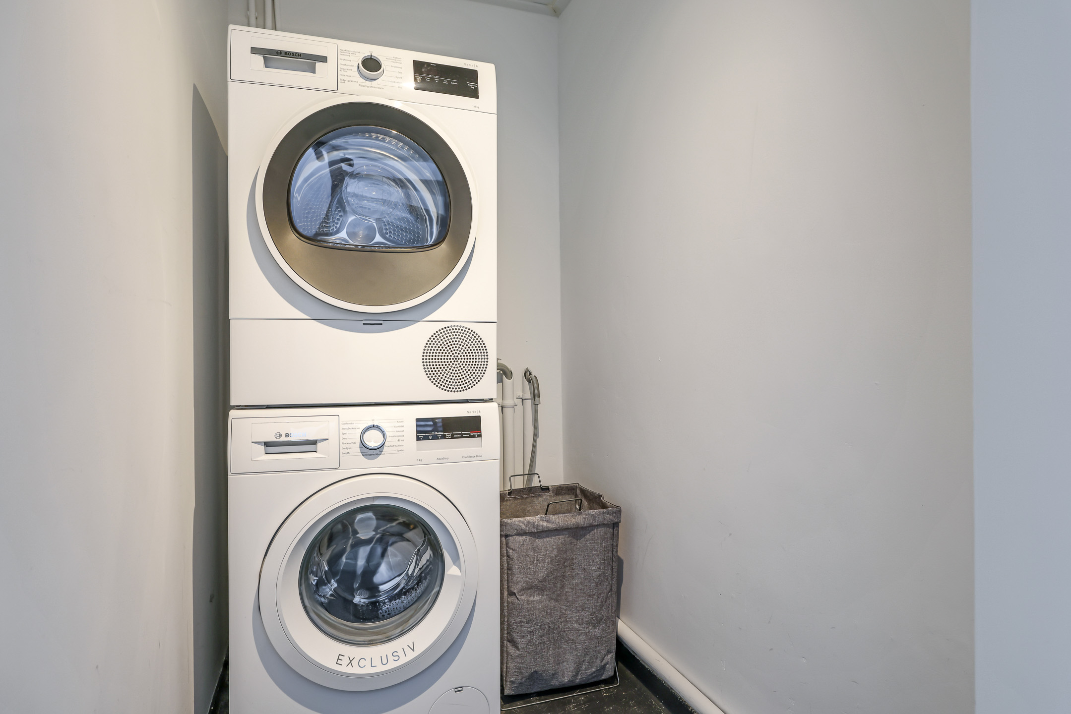 De originele badkamer is in gebruik genomen als wasruimte waardoor je hier eenvoudig de wasmachine en wasdroger uit het zicht plaatst.