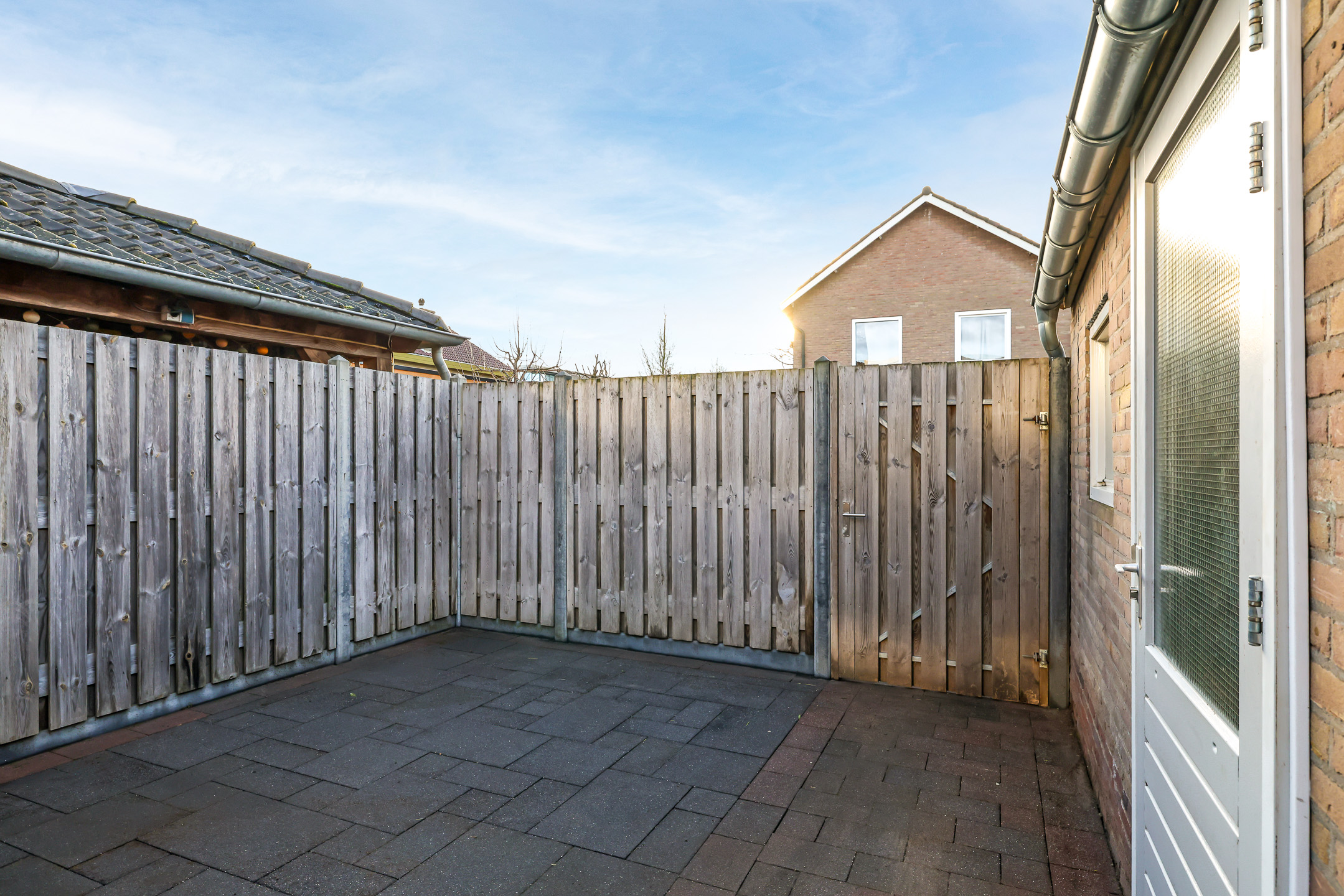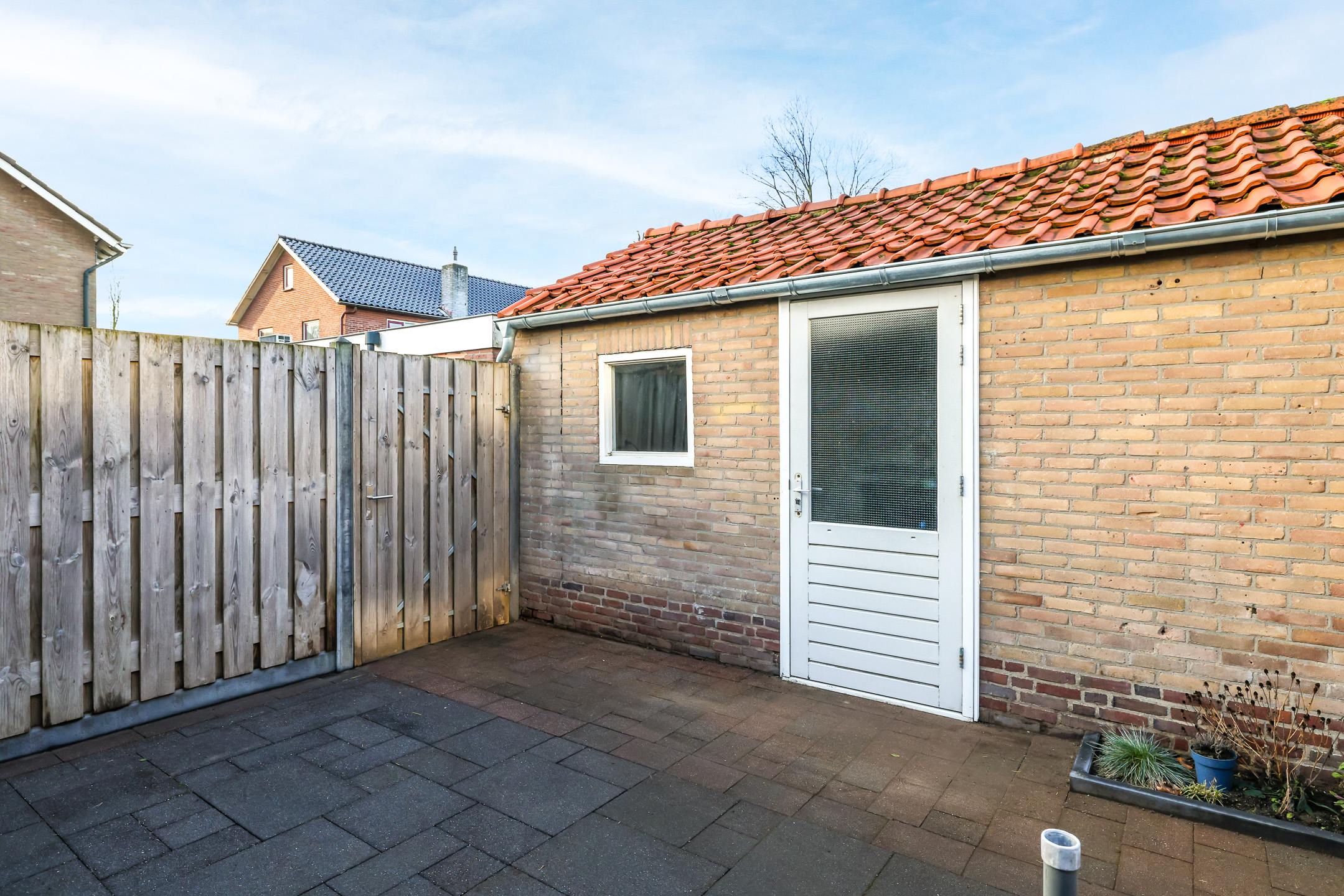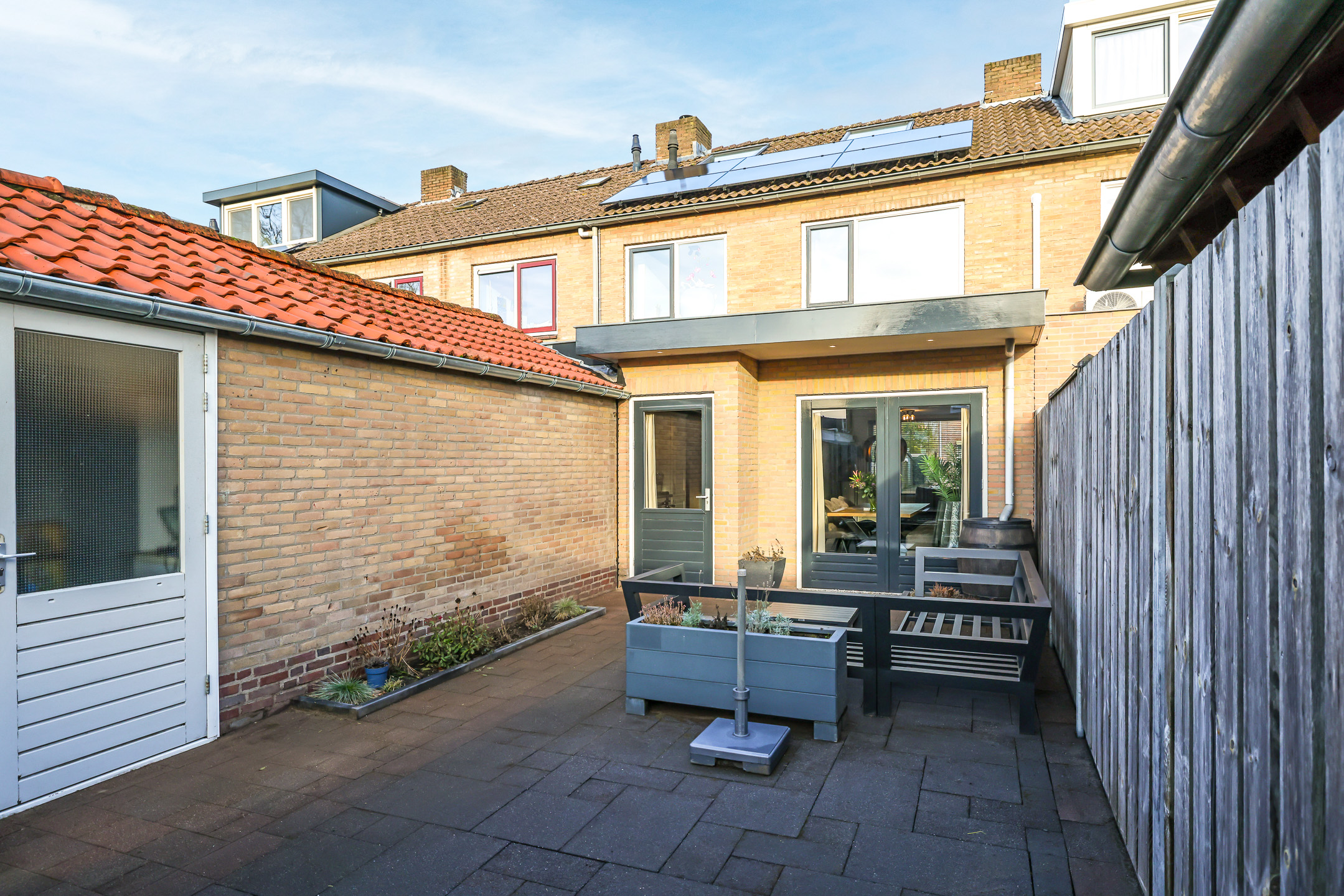 Bij deze woning hoort een zonnige achtertuin. Door de ligging op het zuiden geniet je hier de hele dag van de zon op je terras. De tuin is onderhoudsvriendelijk aangelegd met een groot terras en nette bestrating. Ook de erfafscheiding is degelijk uitgevoerd in een schutting met stevige betonpalen. Een poort geeft toegang tot de achterom. Noemenswaardig is het overstek aan de achtergevel van de woning. Dit overstek met spotverlichting zorgt voor nét die luxere uitstraling van de uitbouw. Aan opbergruimte geen gebrek door de stenen schuur van ruim 13m2 groot. Dit is al groter dan gemiddeld waarbij je door het zadeldak ook nog eens opbergruimte in de nok van de schuur treft.