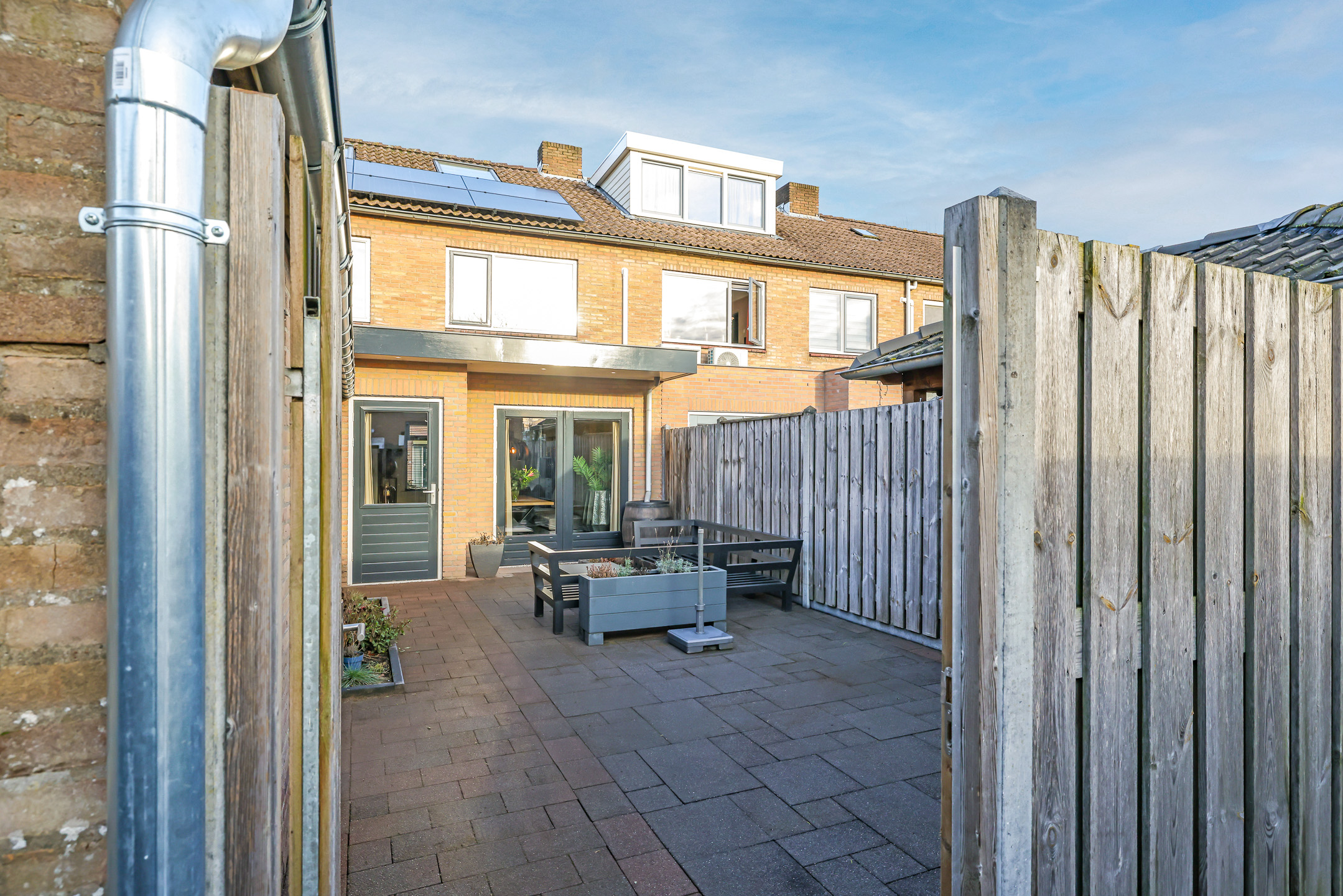 De woning heeft een onderhoudsvriendelijke achtertuin met gunstige zonligging (pal op het zuiden), een achterom en een ruime, stenen berging. De locatie van de woning is zeer gunstig gezien dat de woning aan een rustige eenrichtingsweg op loopafstand van het dorpshart is gelegen.