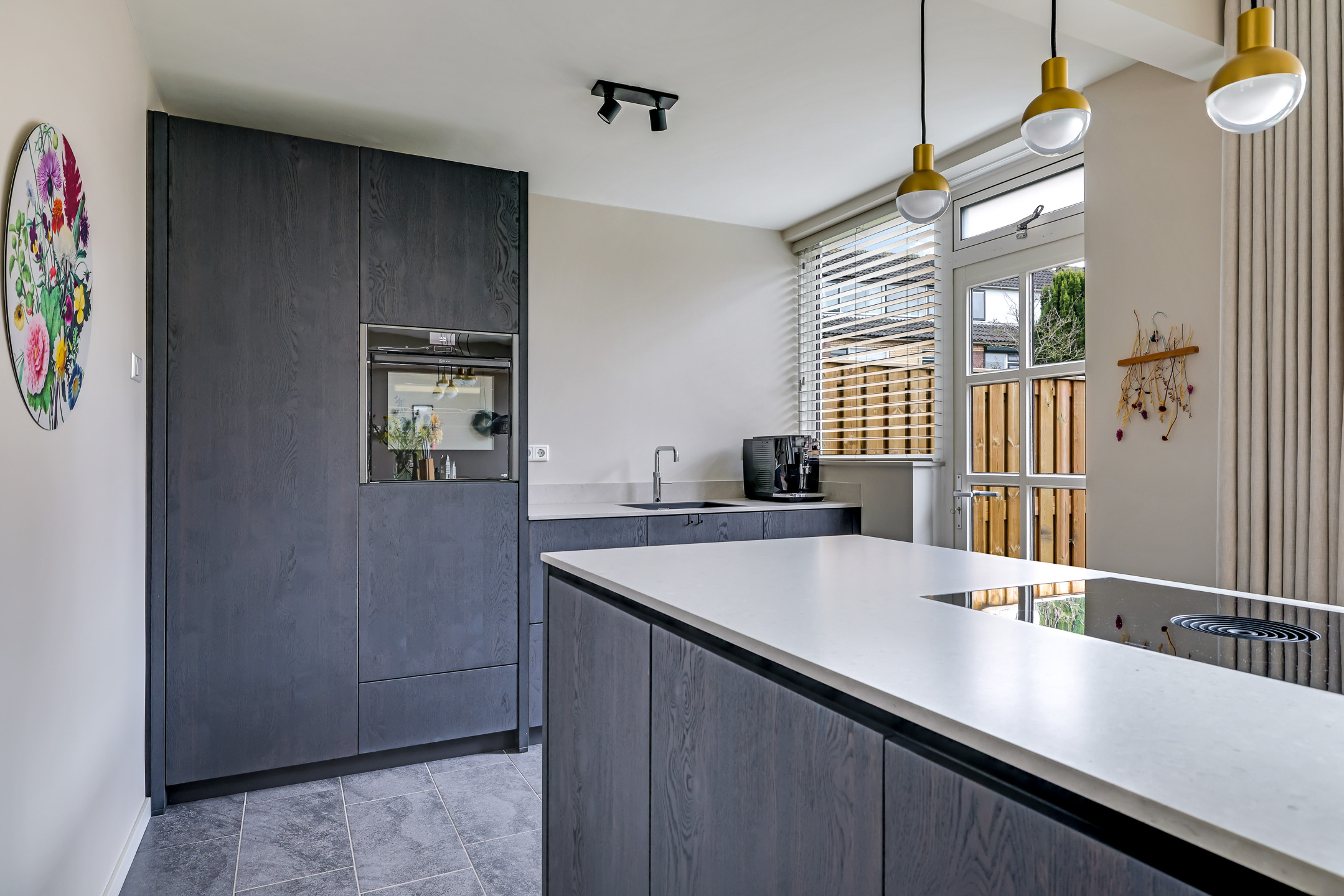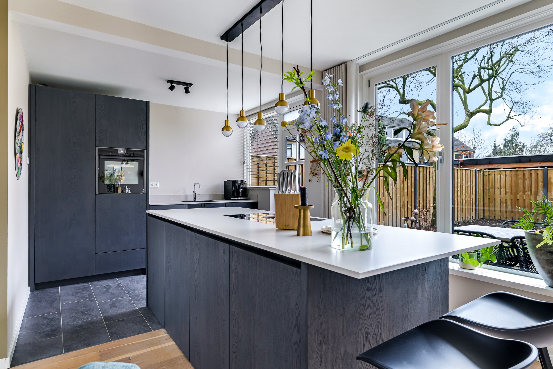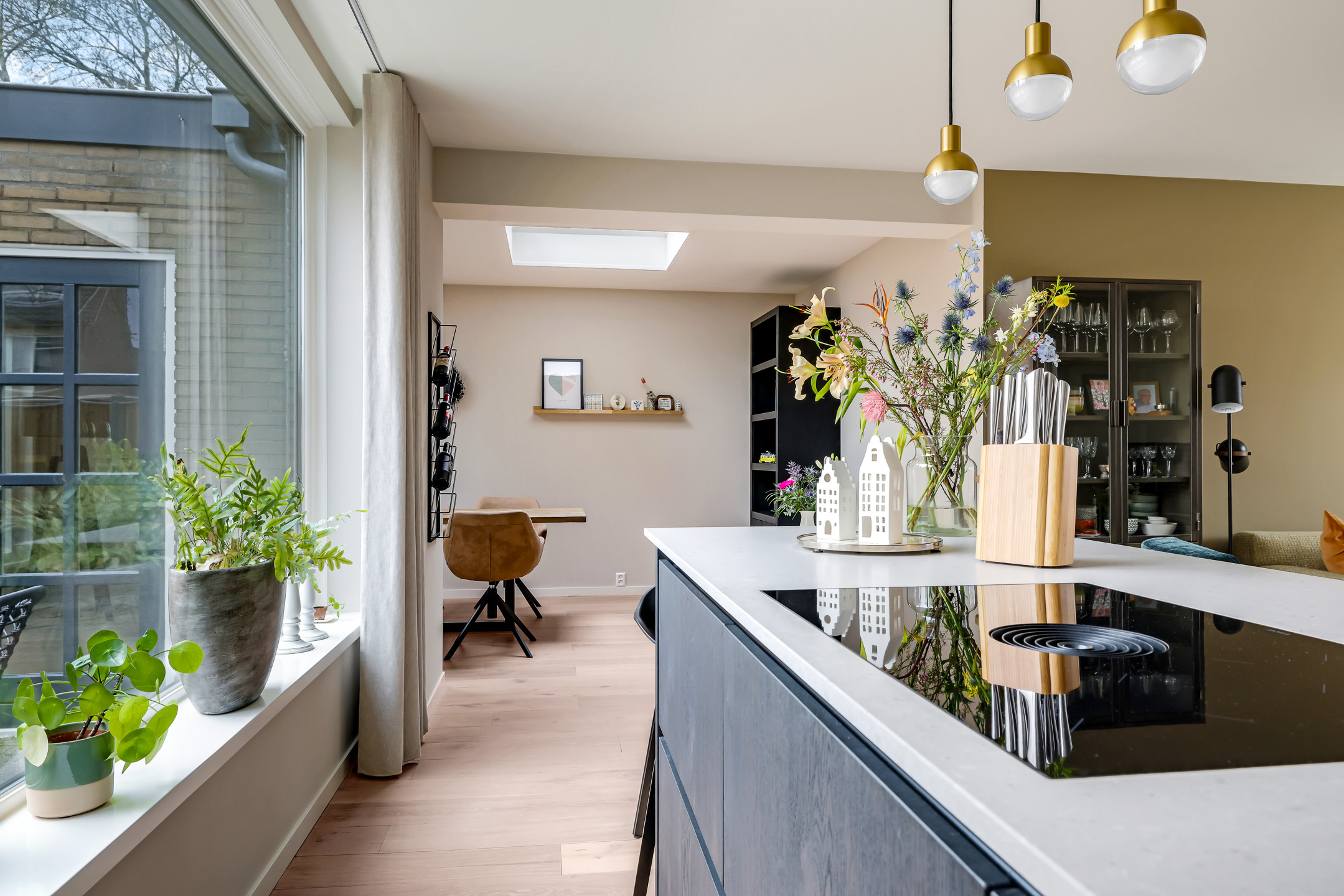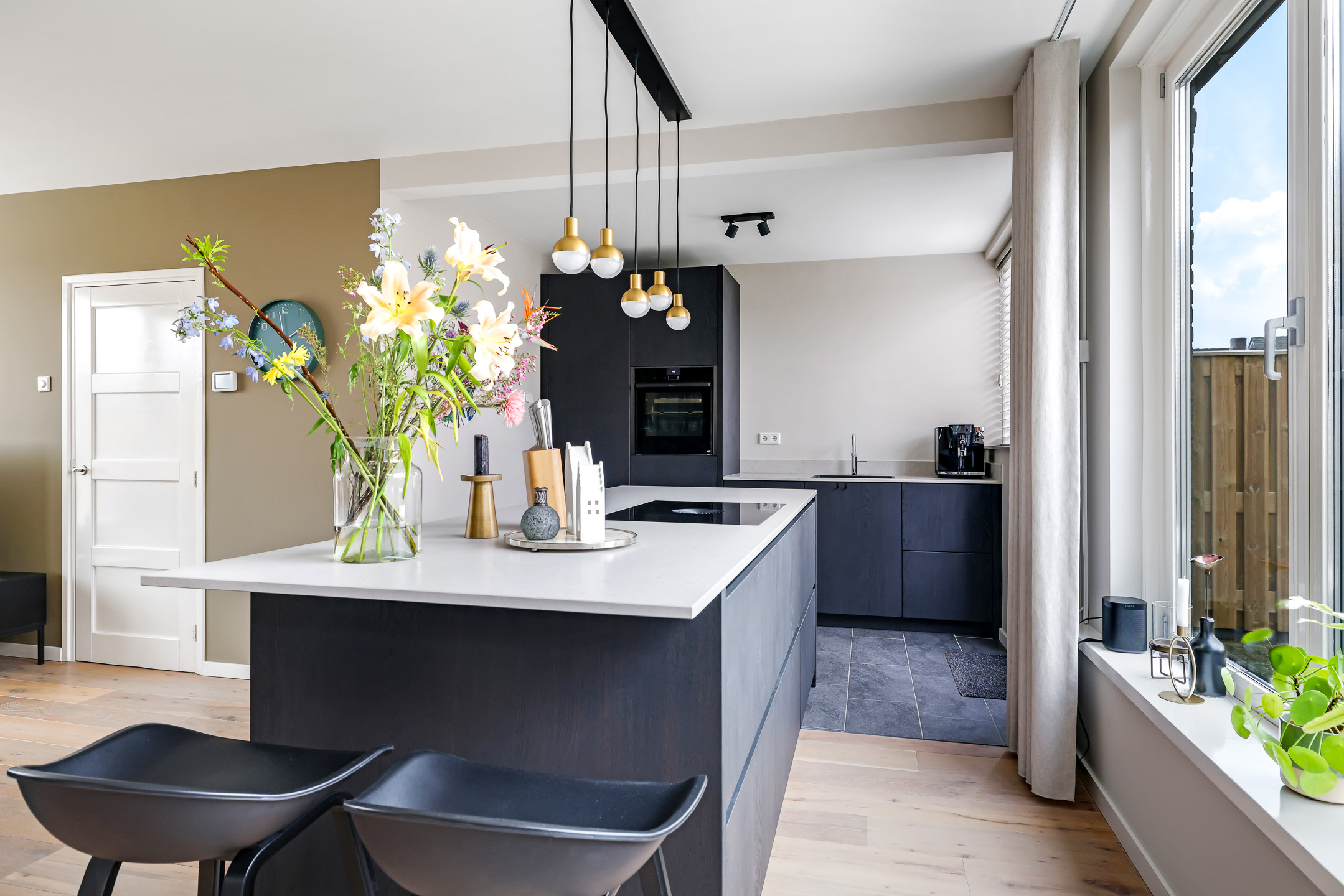 De eyecatcher van deze woning is toch wel de keuken. De van oorsprong dichte keuken is in 2021 opgebroken waardoor er een open leefkeuken is ontstaan. Bij het plaatsen van de keuken is gekozen voor een uitgebreide opstelling met een kookeiland welke centraal in de woning staat. De antraciethouten fronten steken mooi af bij het lichte composiet werkblad. Aan de aanwezige inbouwapparatuur ontbreekt er ook niets, je krijg hier namelijk een 4-pits Bora inductiekookplaat met geïntegreerde afzuiging, een vaatwasser op hoogte, een combi-oven met stoomfunctie en een grote koelkast. Nog een pluspunt is de Quooker waardoor er direct kokend water uit de kraan komt. Het blad van het kookeiland steekt iets uit waardoor je al snel op een barkruk plaats zal nemen. Zie jij je hier al zitten?