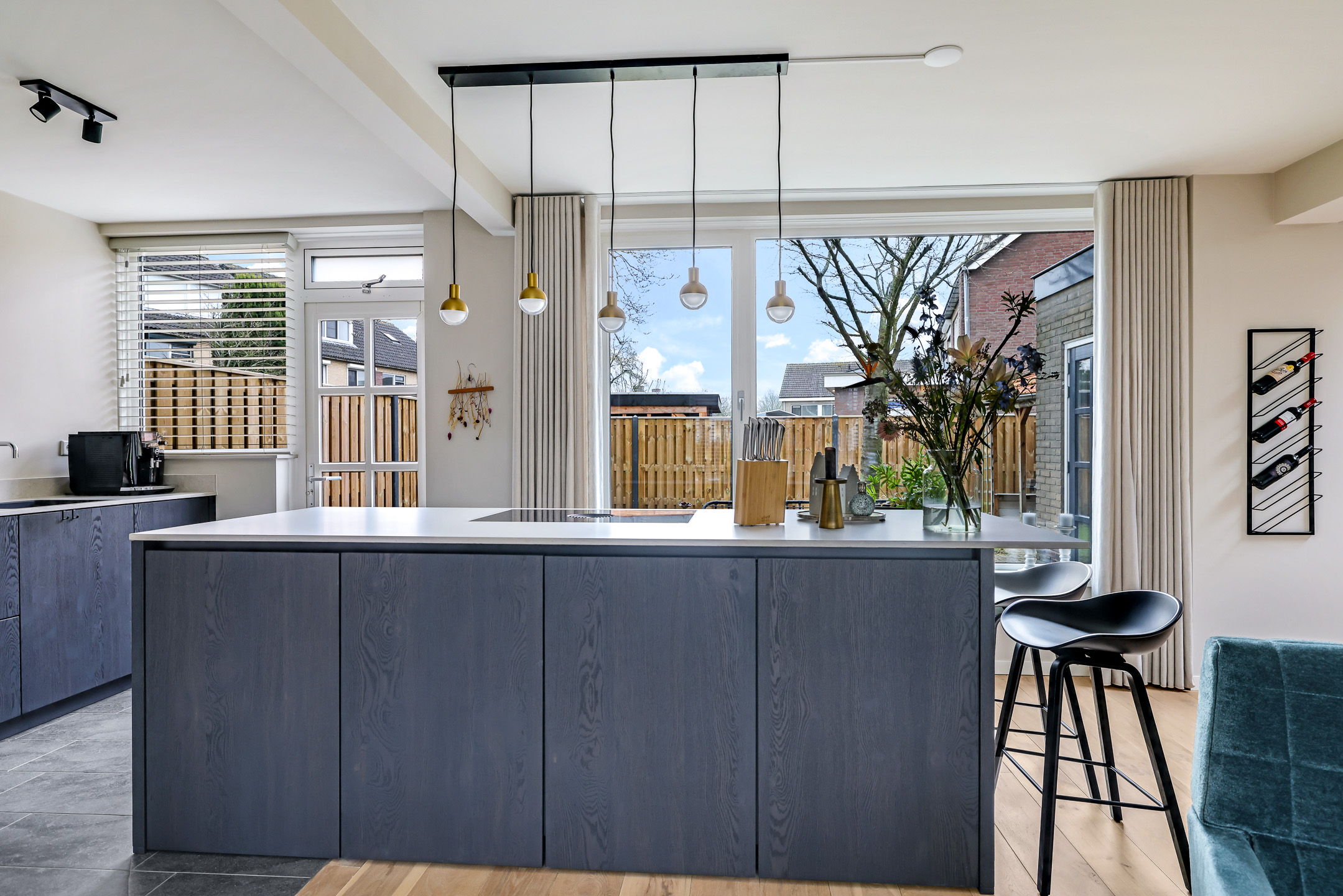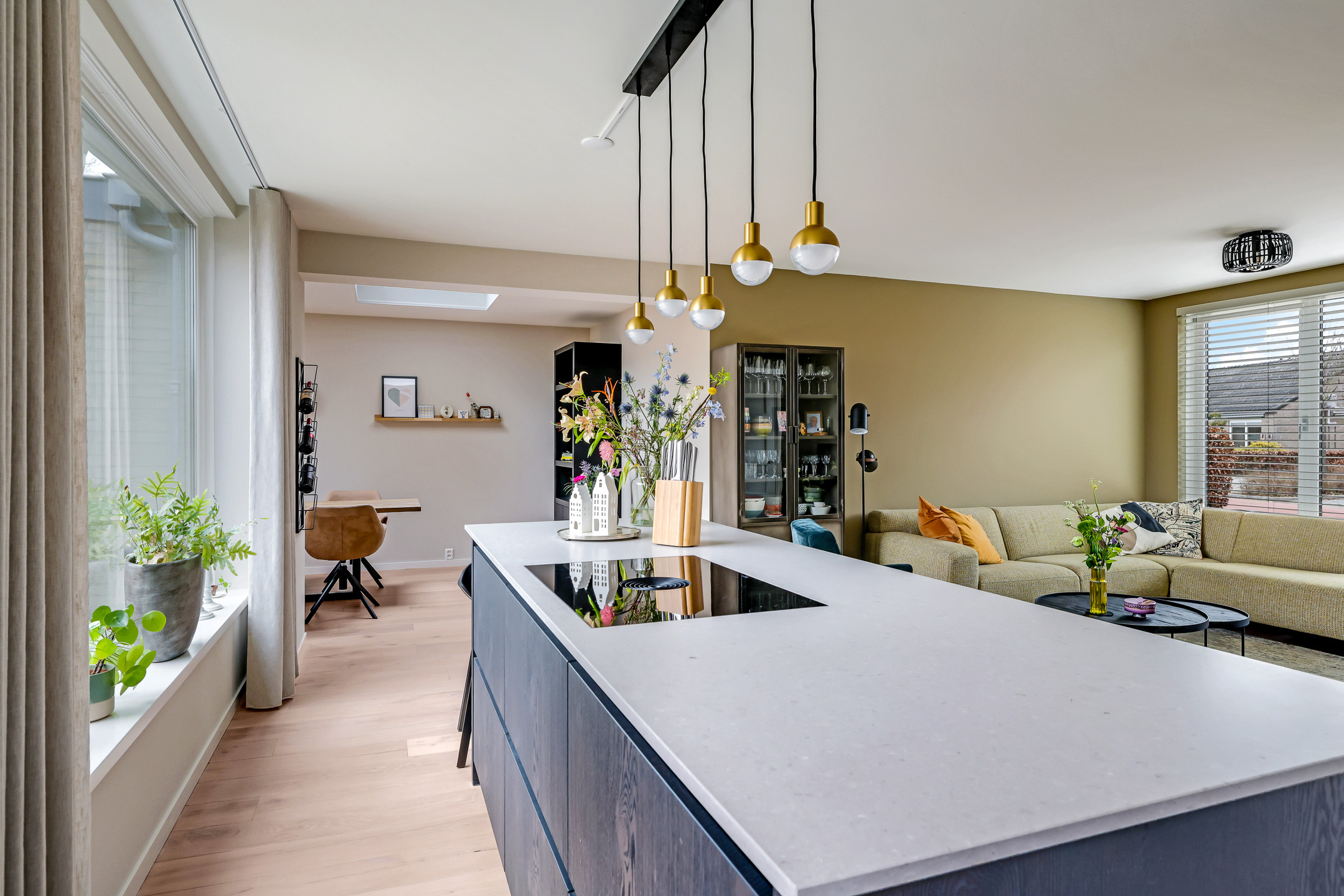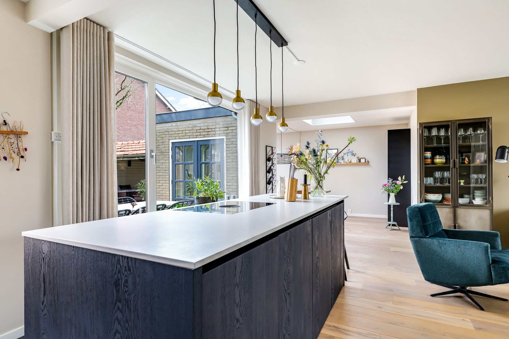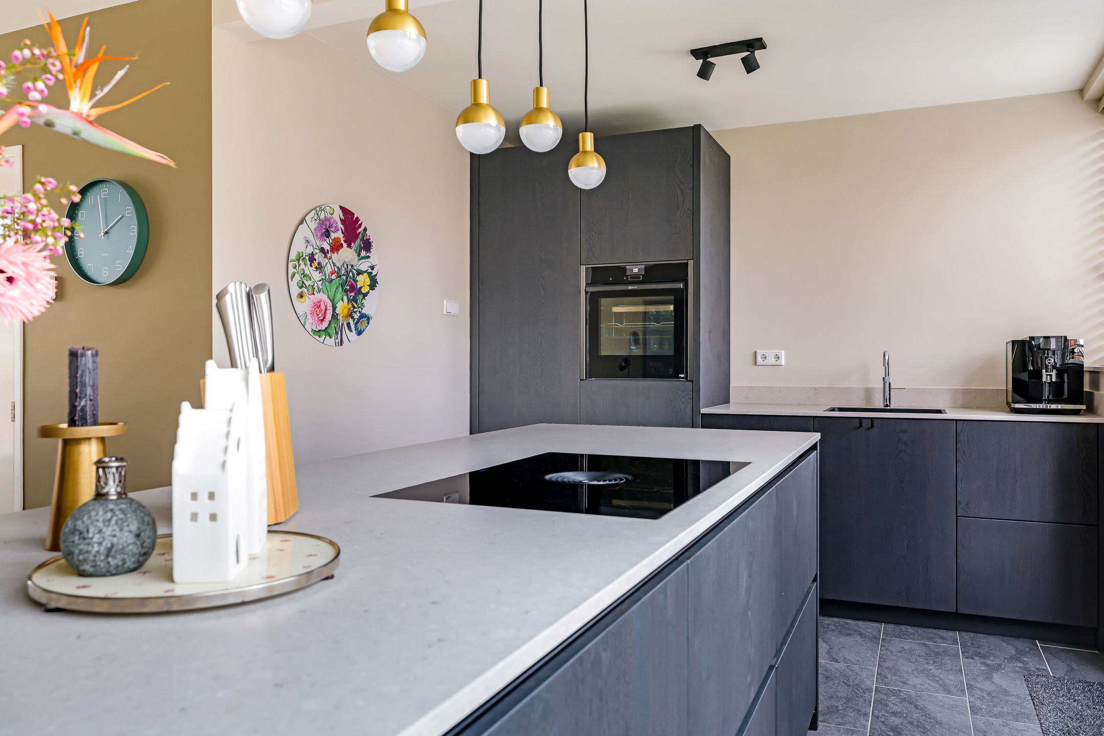 De eyecatcher van deze woning is toch wel de keuken. De van oorsprong dichte keuken is in 2021 opgebroken waardoor er een open leefkeuken is ontstaan. Bij het plaatsen van de keuken is gekozen voor een uitgebreide opstelling met een kookeiland welke centraal in de woning staat. De antraciethouten fronten steken mooi af bij het lichte composiet werkblad. Aan de aanwezige inbouwapparatuur ontbreekt er ook niets, je krijg hier namelijk een 4-pits Bora inductiekookplaat met geïntegreerde afzuiging, een vaatwasser op hoogte, een combi-oven met stoomfunctie en een grote koelkast. Nog een pluspunt is de Quooker waardoor er direct kokend water uit de kraan komt. Het blad van het kookeiland steekt iets uit waardoor je al snel op een barkruk plaats zal nemen. Zie jij je hier al zitten?