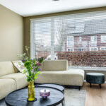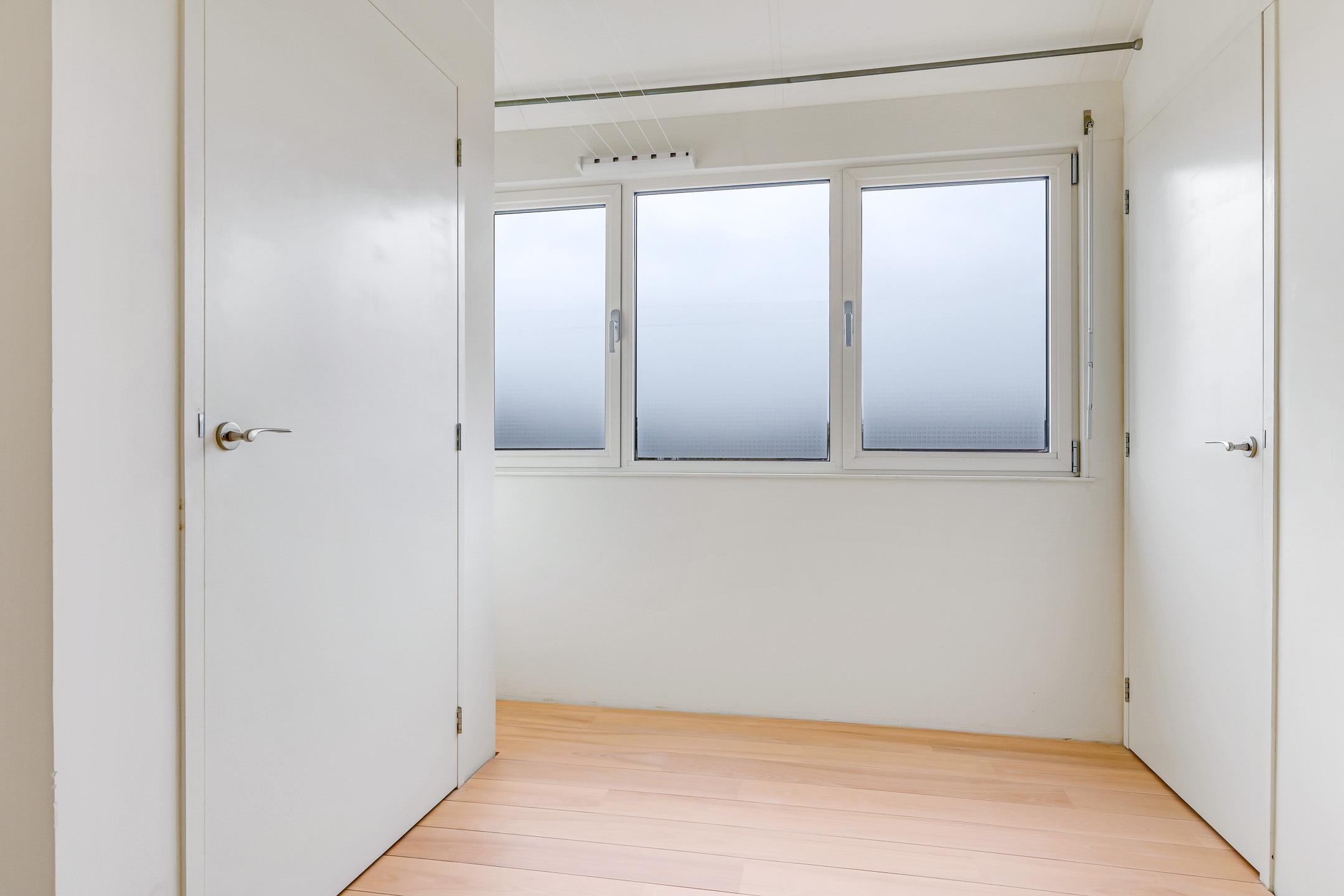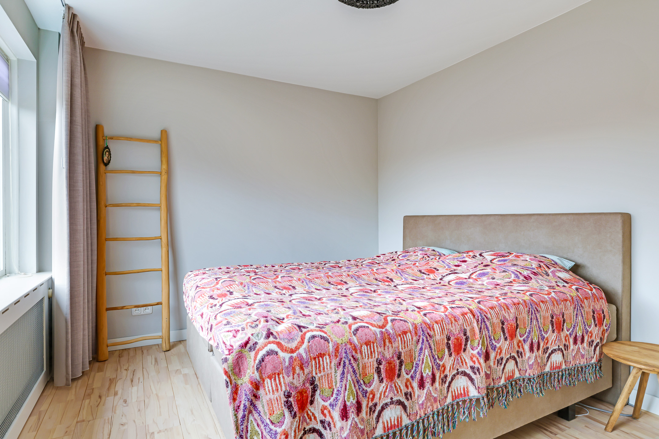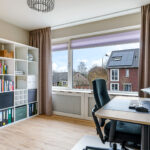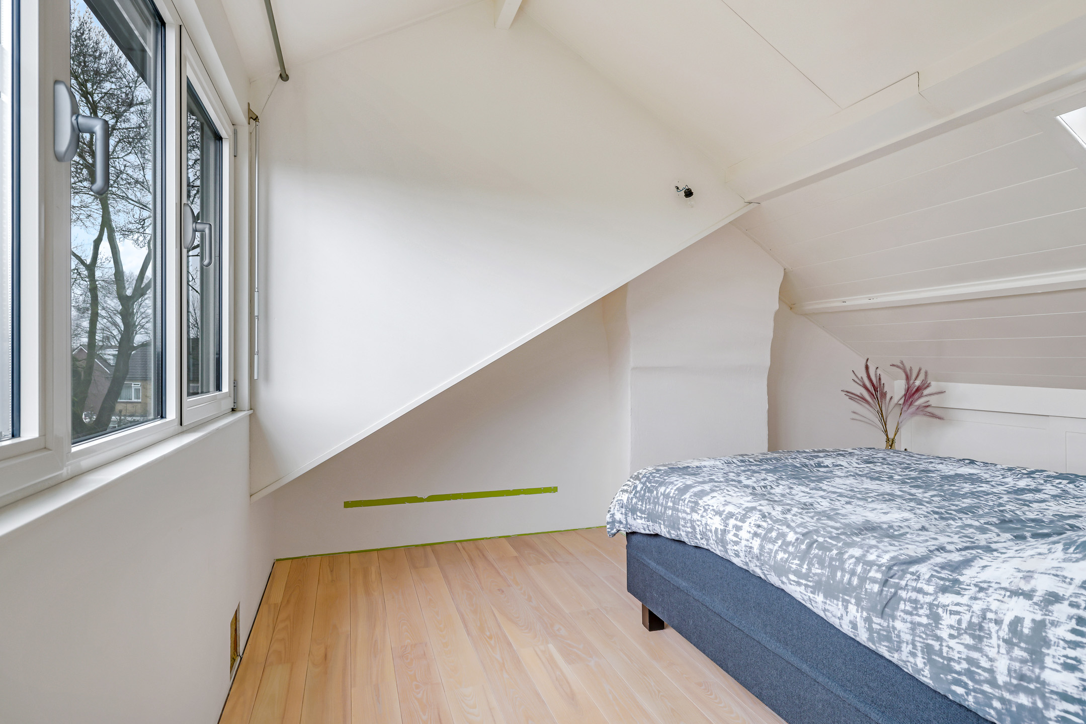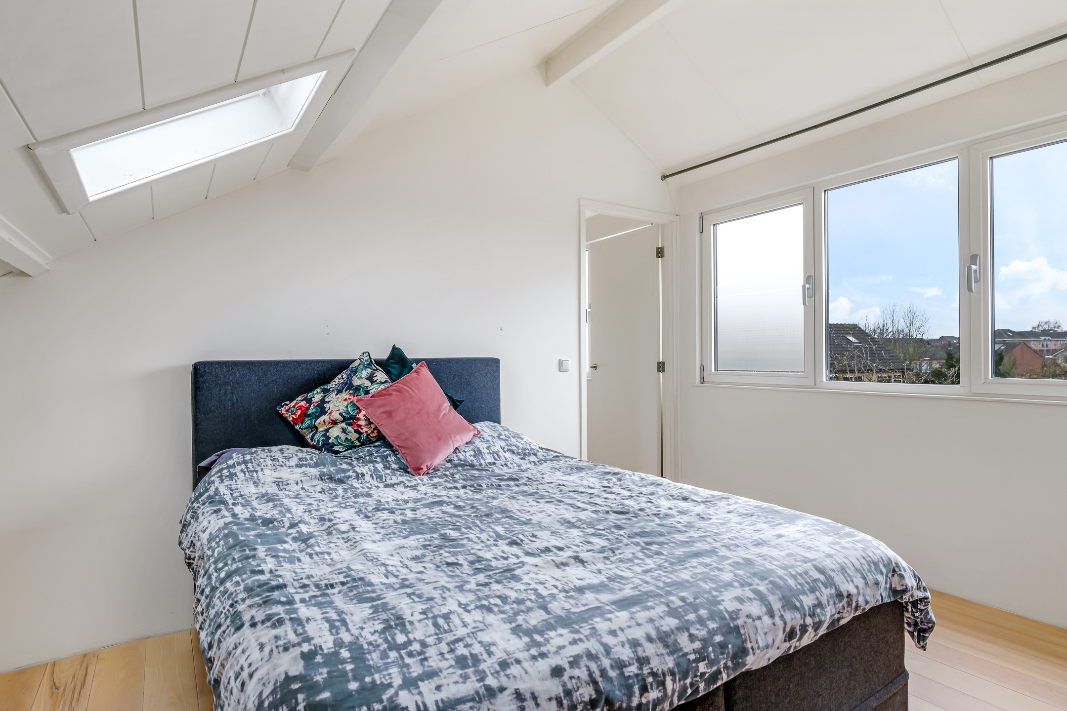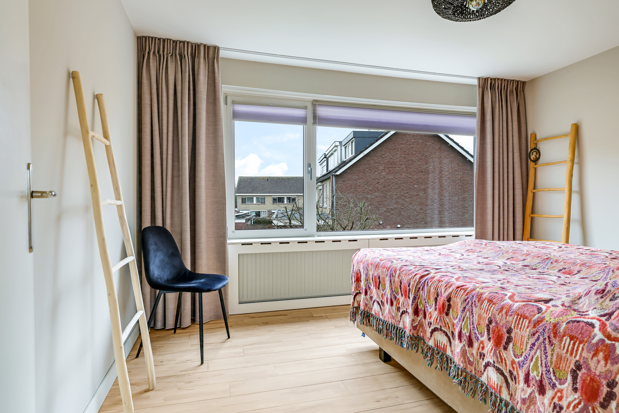 Net als de begane grond heeft ook de 1e verdieping een ruimtelijke indeling. Op deze woonlaag vind je 3 volwaardige slaapkamers van respectievelijk 12m2, 10m2 en 7m2 groot. Origineel had deze woning 4 slaapkamers, echter heeft een slaapkamer plaats gemaakt voor de badkamer. De slaapkamers zijn allen voorzien van rechte wanden en grote raampartijen waardoor deze praktisch en ruim doen voorkomen. Daarbij tref je op de kamers zonwering. De kleinste slaapkamer is voorzien van een kastenwand waarachter je de complete garderobe kwijt kan. Opvallend is de doorlopende beukenvloer welke zorgt voor een eenduidig geheel.