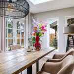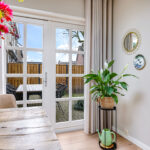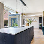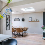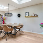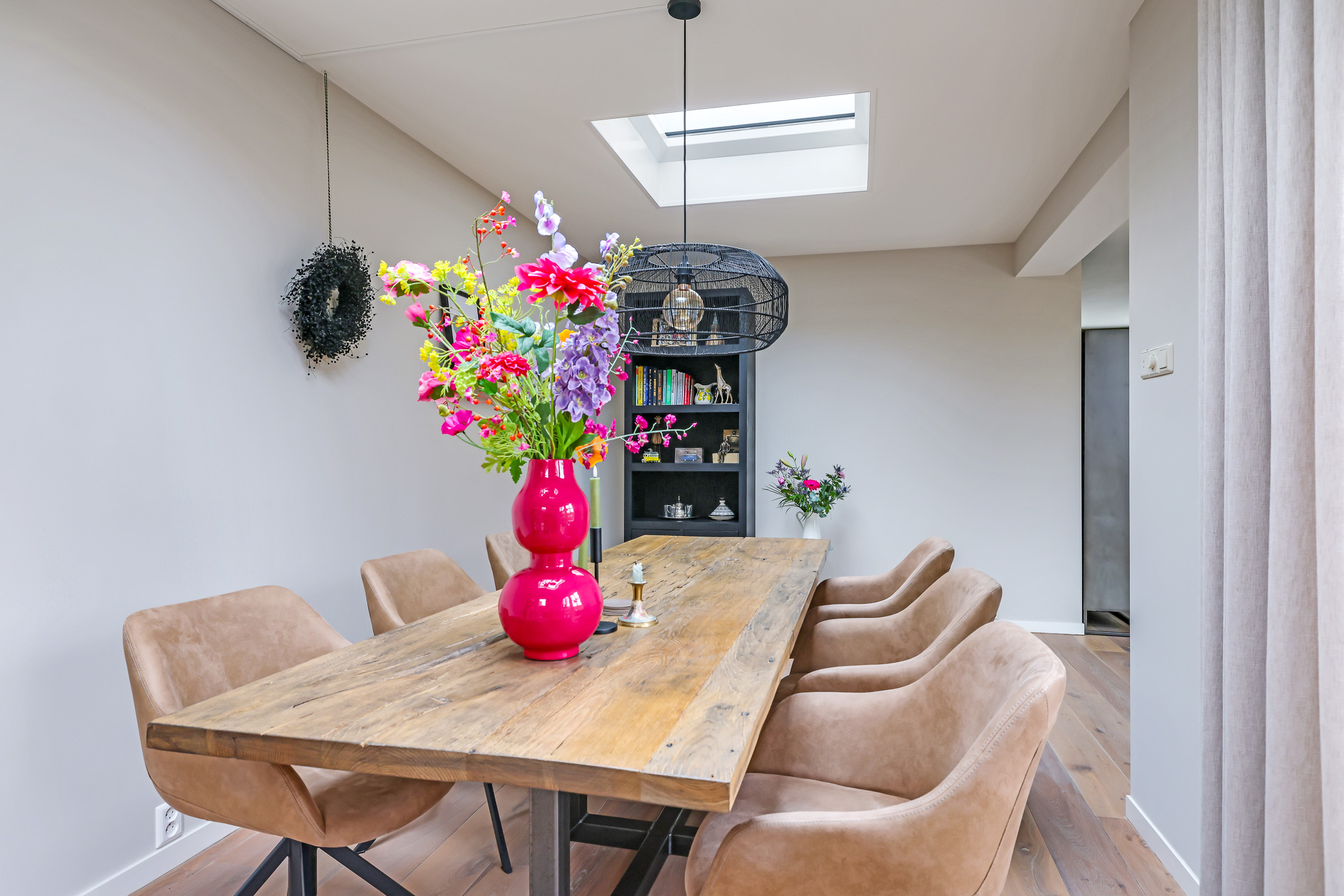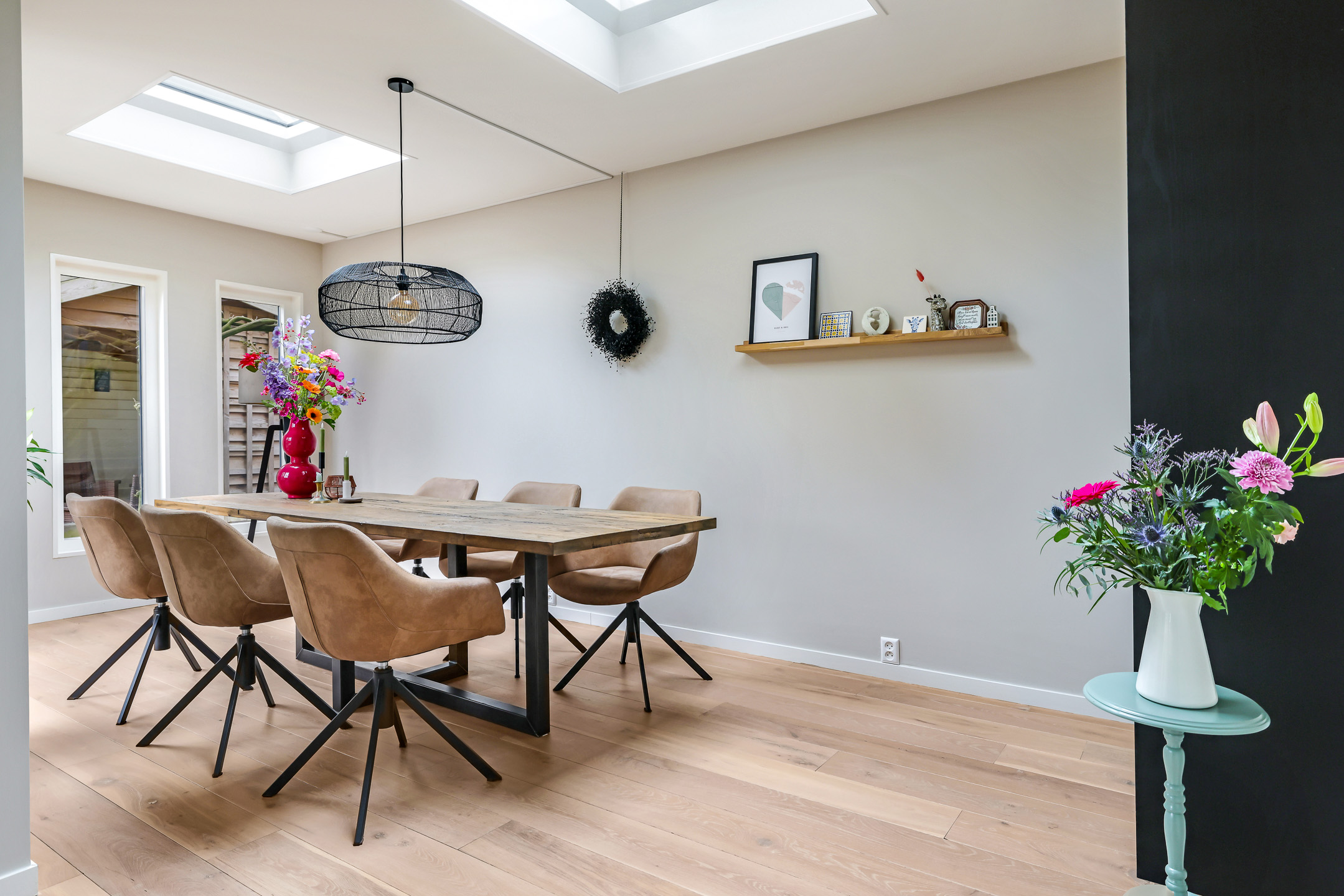 Eethoek in de aanbouw met 2 lichtkoepels en dubbele tuindeuren