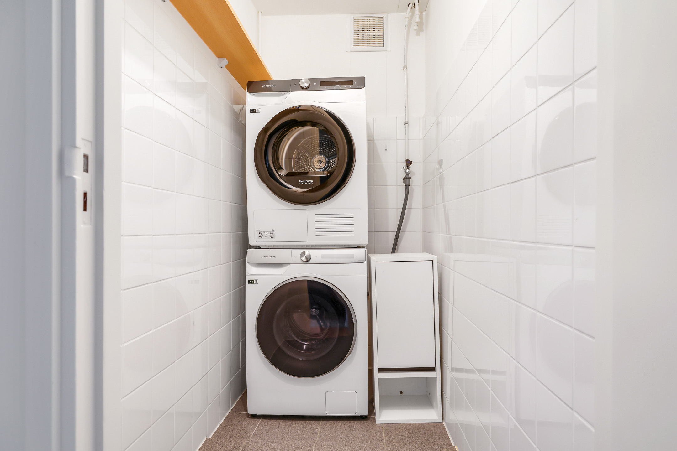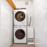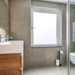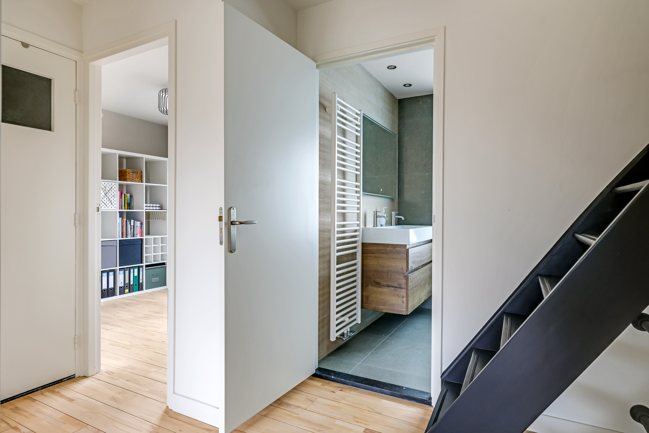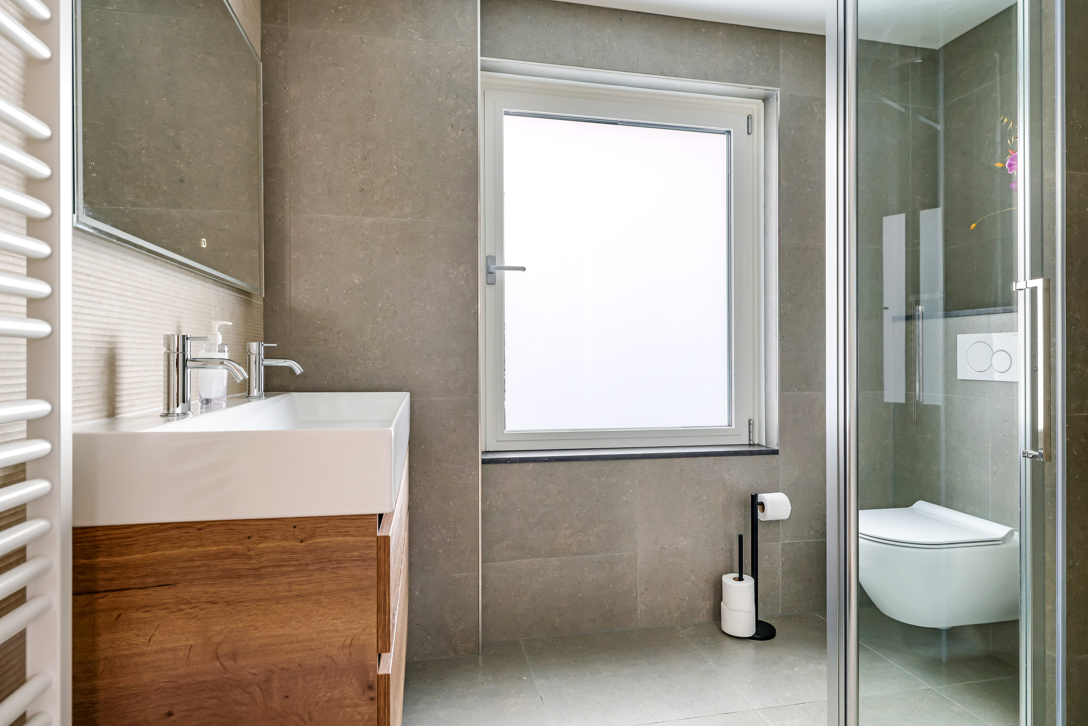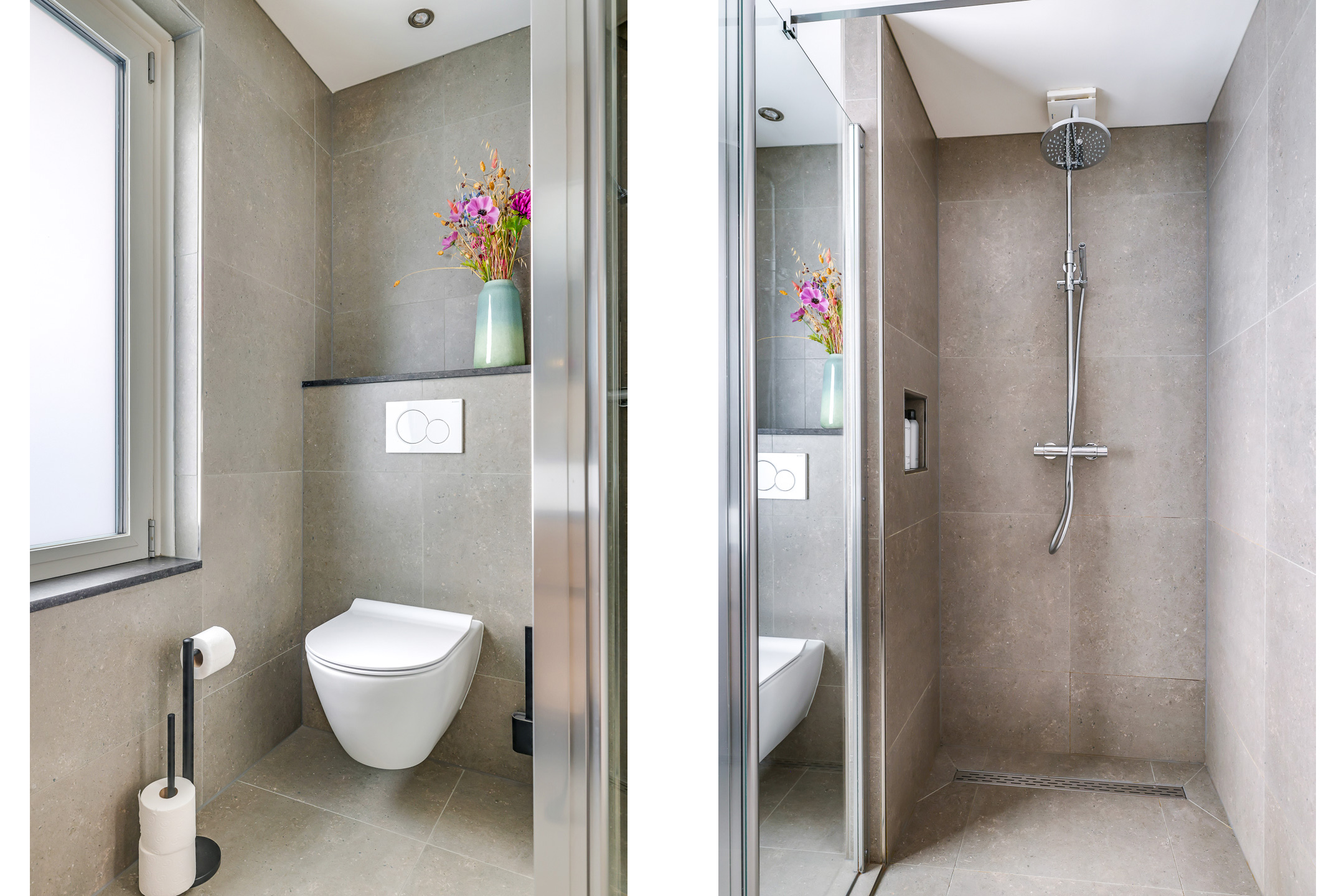 In 2021 is de badkamer geheel gerenoveerd. Het zal dan ook niet verbazen dat de badkamer geheel voldoet aan de laatste trends. De groot formaat zandkleurige tegels geven de ruimte een rustige, chique uitstraling. Uiteraard is er vloerverwarming (warm water) aangebracht. Al het wenselijke sanitair is aanwezig, zijnde een tweepersoonswastafelmeubel met brede lades en een spiegel met verlichting, een 2e (zwevend geplaatst) toilet en een ruime inloopdouche met hand- en stortdouche. Een handdoekradiator en mechanische ventilatie maken de ruimte af. Een groot raam zorgt voor de nodige lichtinval. Tussen de slaapkamers in is nog een wasruimte gelegen. Origineel was dit de badkamer maar deze is naar een slaapkamer verplaatst. De ruimte die is vrijgekomen is in gebruik genomen als wasruimte, je kan hier goed de wasmachine en wasdroger kwijt.