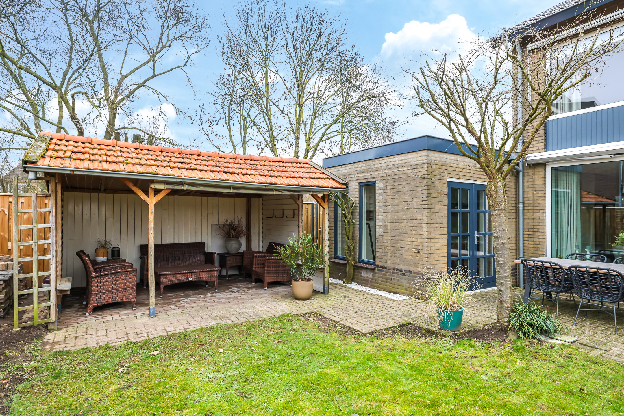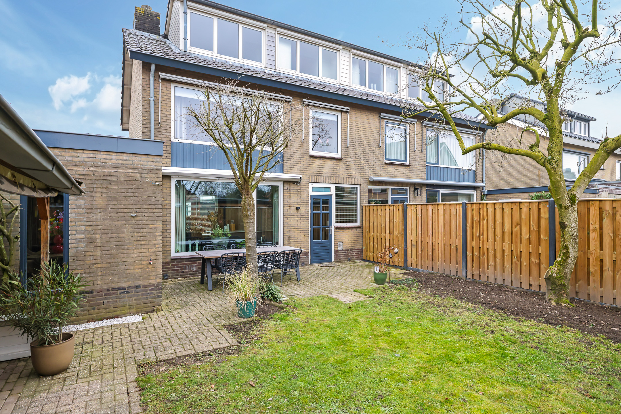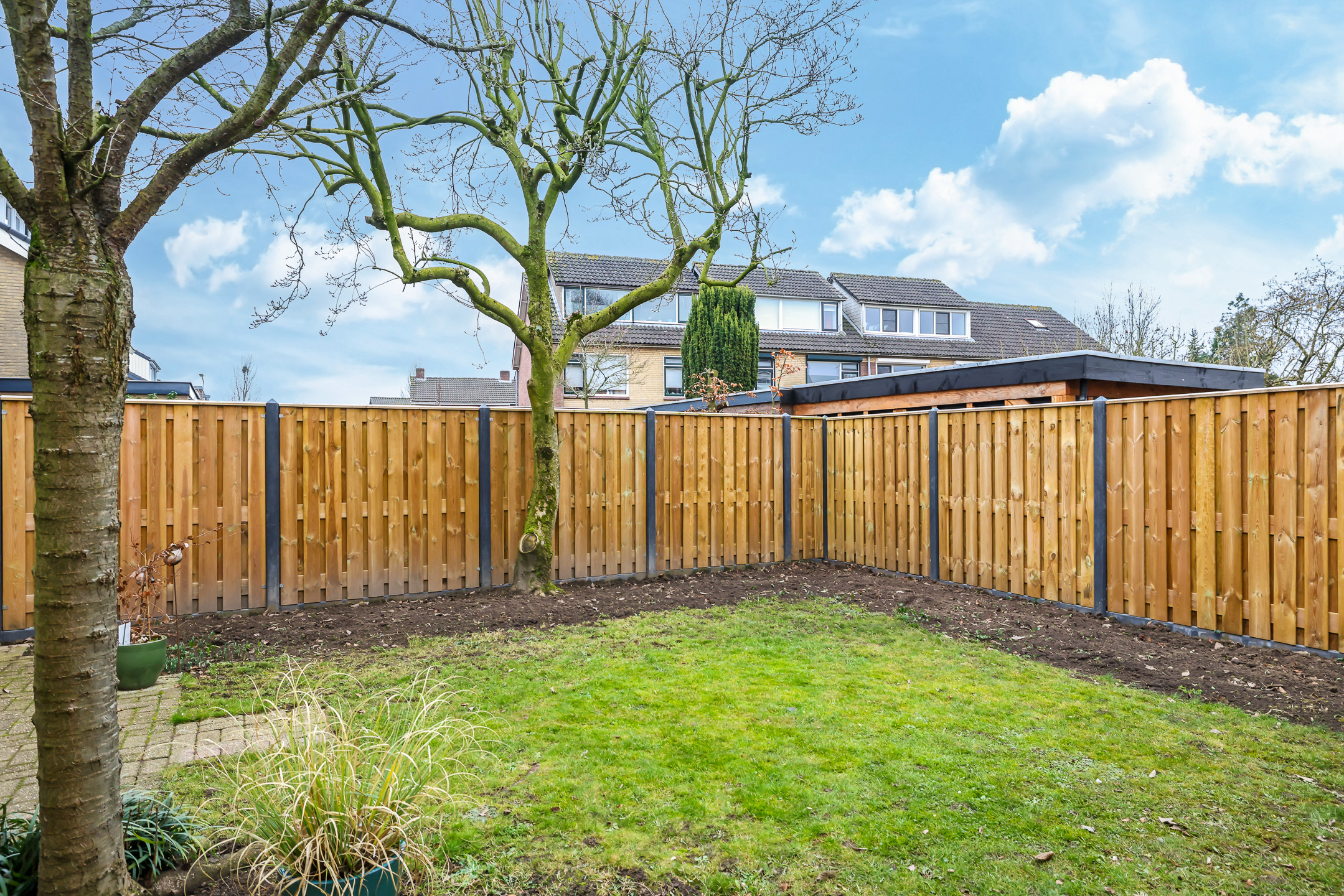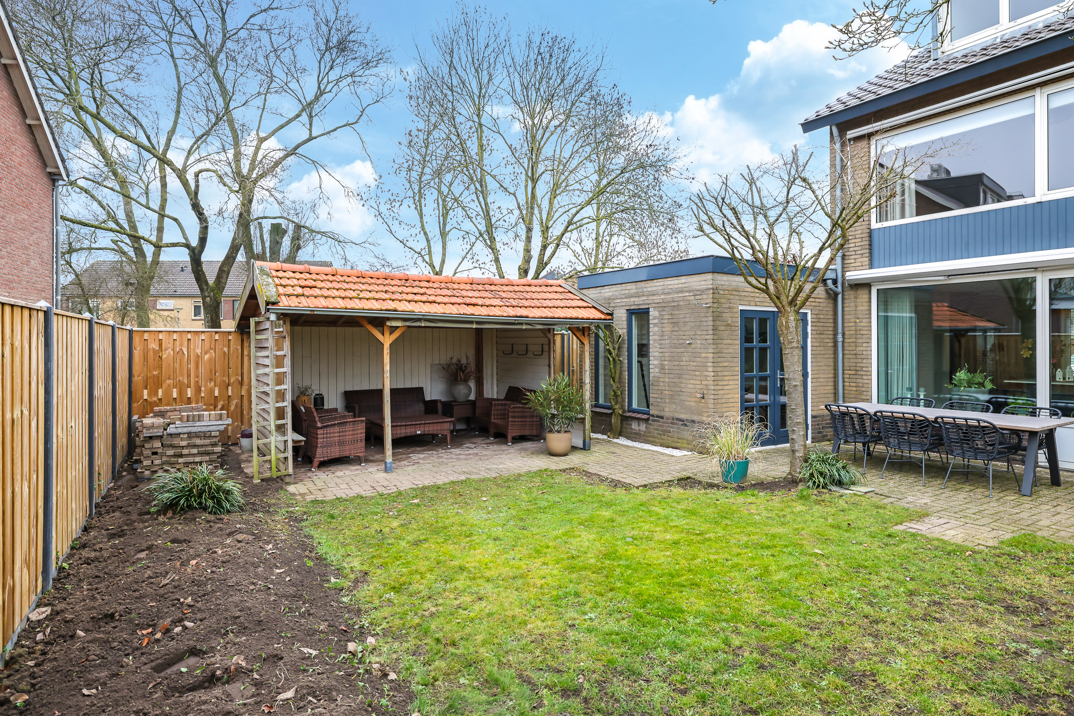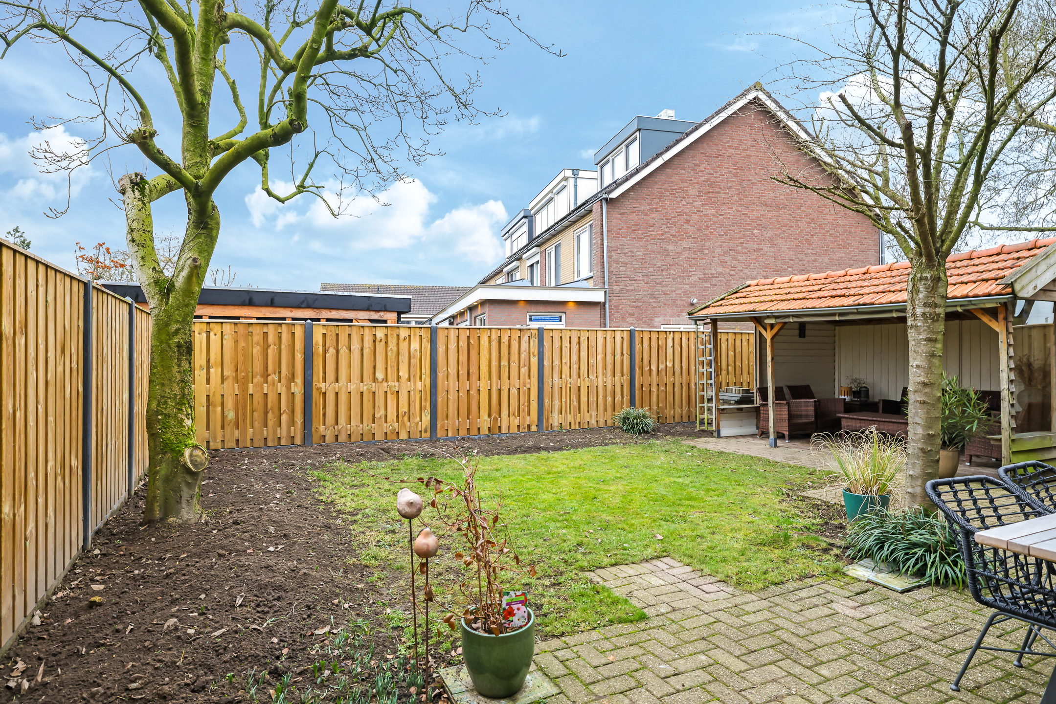 Wat deze gezinswoning compleet maakt is de zonnige achtertuin. Met een ligging op het zuidwesten geniet je hier met name in de middag- en avonduren van veel zonuren. Zonwering op de achtergevel maakt dat je ook schaduw kan creëren. Zit je liever beschut, dan neem je plaats onder de sfeervolle pangedekte veranda. De tuin is opgedeeld in een groot terras en gras waar je eventueel nog een speeltoestel kan plaatsen. Diverse bomen zorgen daarbij voor een groene sfeer. In 2025 is de schutting vervangen voor een solide exemplaar met betonpalen. Dit zorgt ervoor dat de erfafscheiding er weer verzorgd uitziet. De poort is tegelijkertijd vervangen. Erg prettig dat je langs de woning achterom kan lopen. Zo hoef je met bijvoorbeeld je snoeiafval niet door de woning heen. Ook is in 2025 de voortuin vernieuwd waardoor ook deze er weer verzorgd bij ligt.