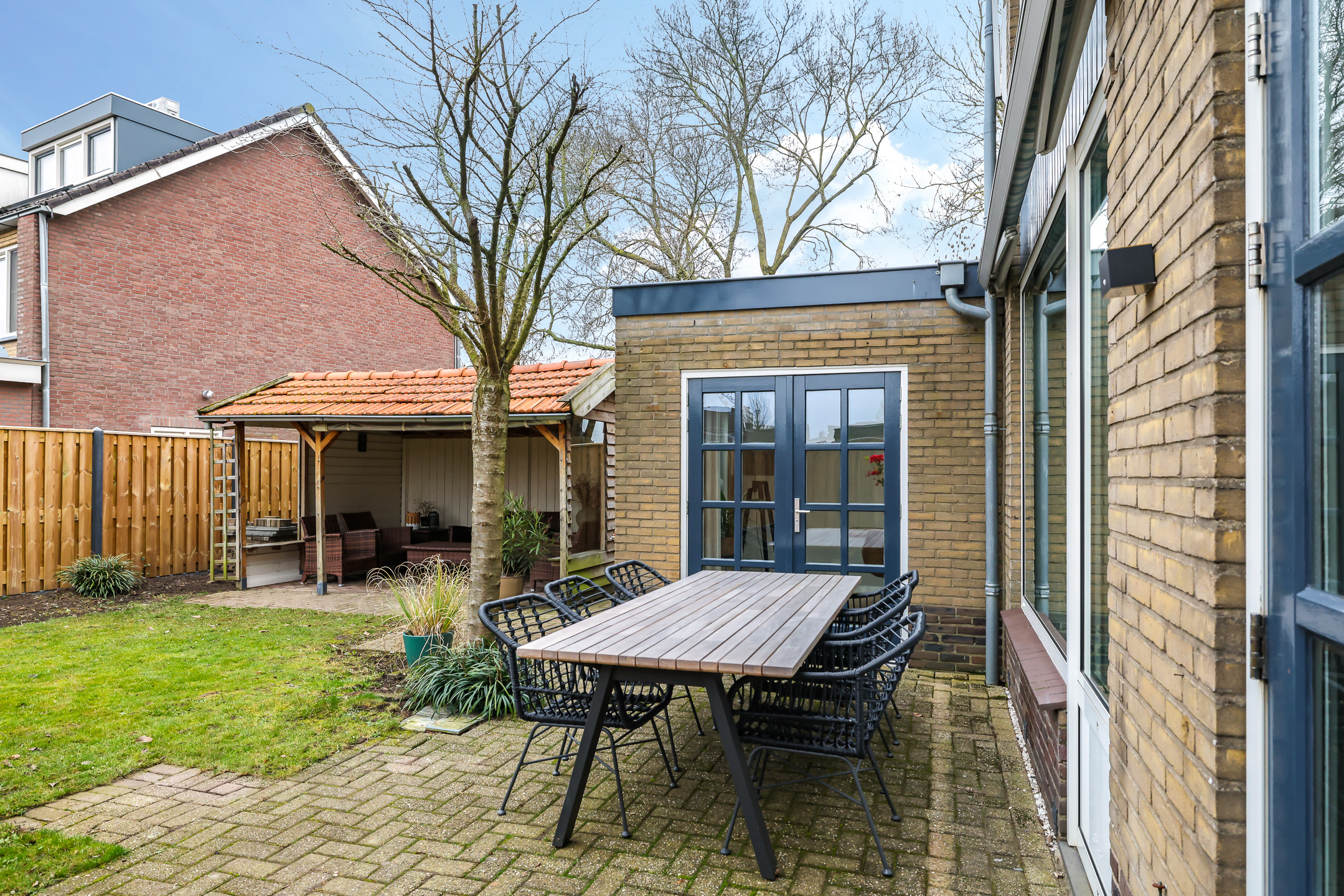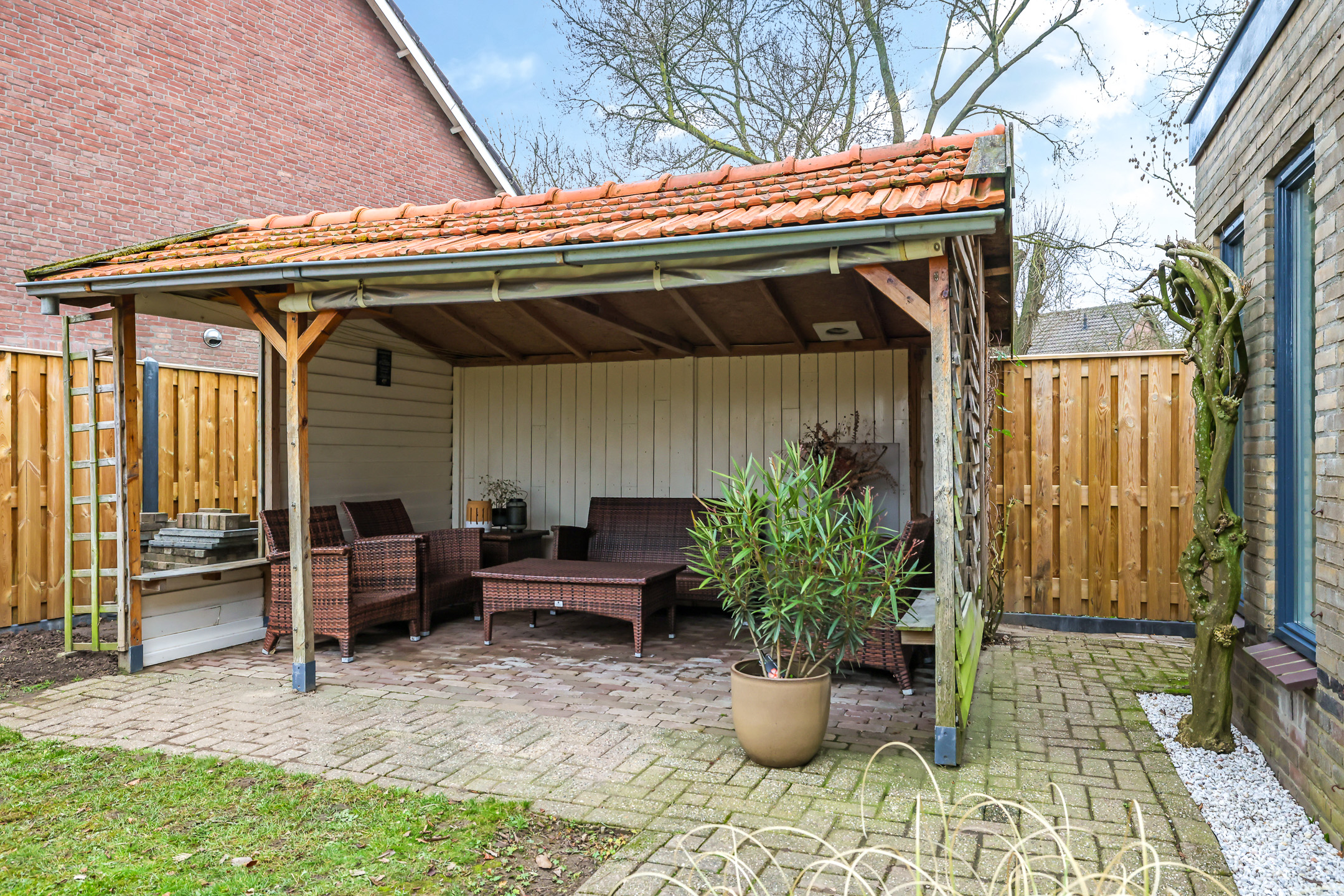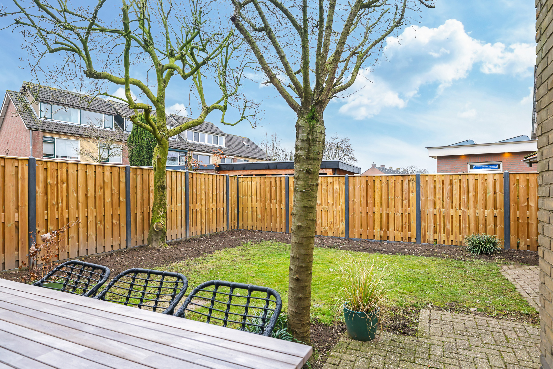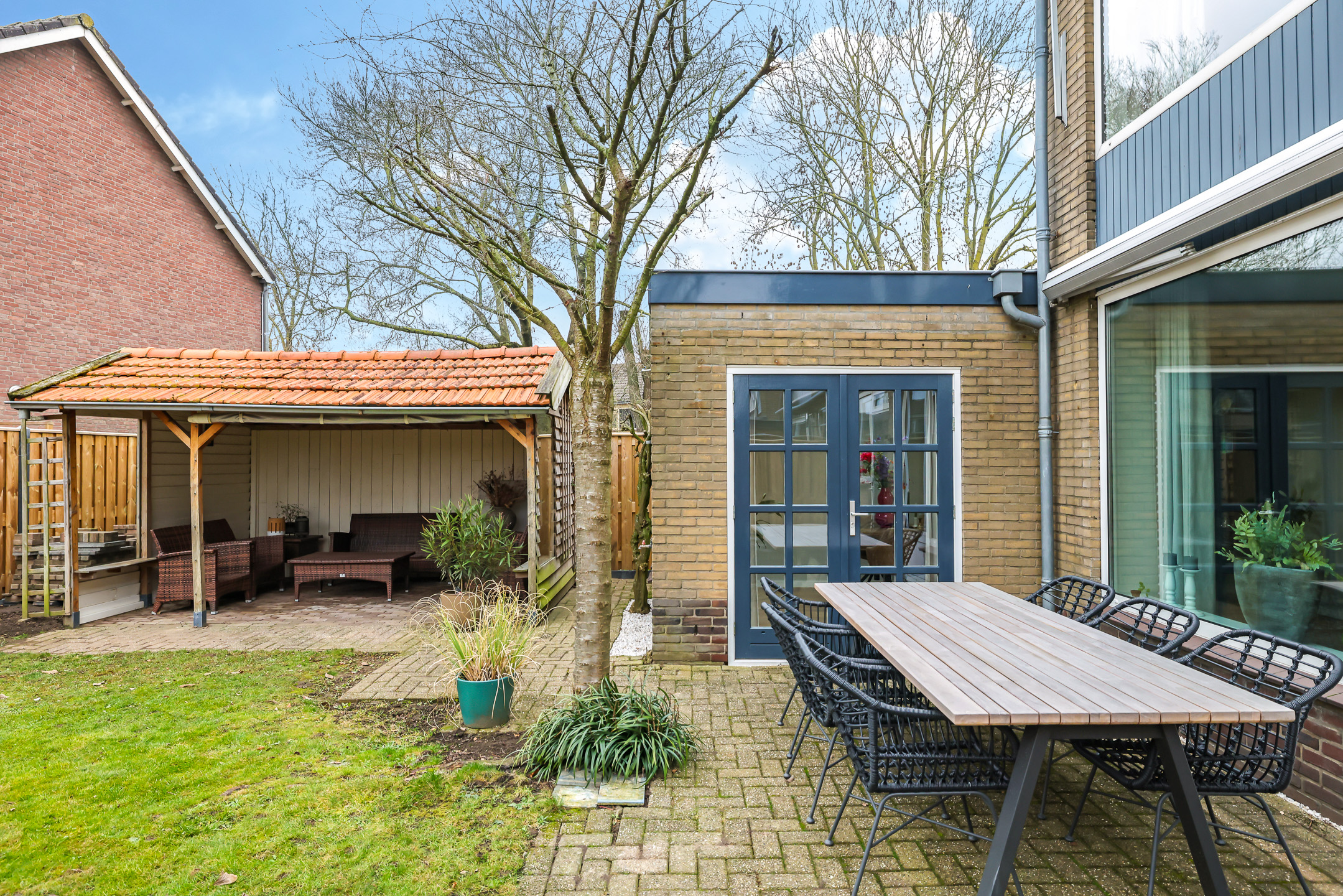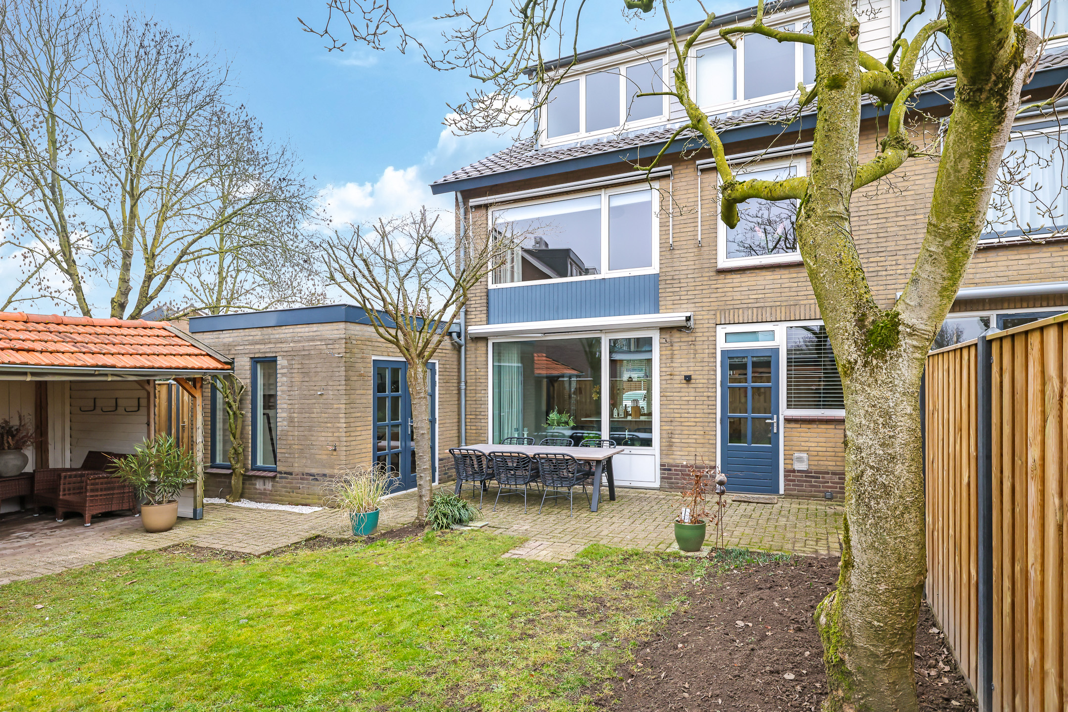 Wat deze gezinswoning compleet maakt is de zonnige achtertuin. Met een ligging op het zuidwesten geniet je hier met name in de middag- en avonduren van veel zonuren. Zonwering op de achtergevel maakt dat je ook schaduw kan creëren. Zit je liever beschut, dan neem je plaats onder de sfeervolle pangedekte veranda. De tuin is opgedeeld in een groot terras en gras waar je eventueel nog een speeltoestel kan plaatsen. Diverse bomen zorgen daarbij voor een groene sfeer. In 2025 is de schutting vervangen voor een solide exemplaar met betonpalen. Dit zorgt ervoor dat de erfafscheiding er weer verzorgd uitziet. De poort is tegelijkertijd vervangen. Erg prettig dat je langs de woning achterom kan lopen. Zo hoef je met bijvoorbeeld je snoeiafval niet door de woning heen. Ook is in 2025 de voortuin vernieuwd waardoor ook deze er weer verzorgd bij ligt.