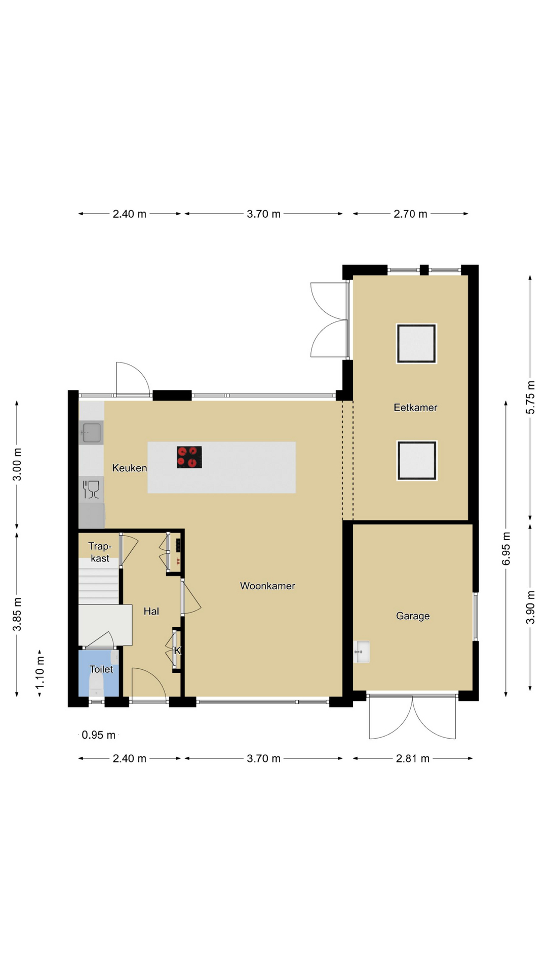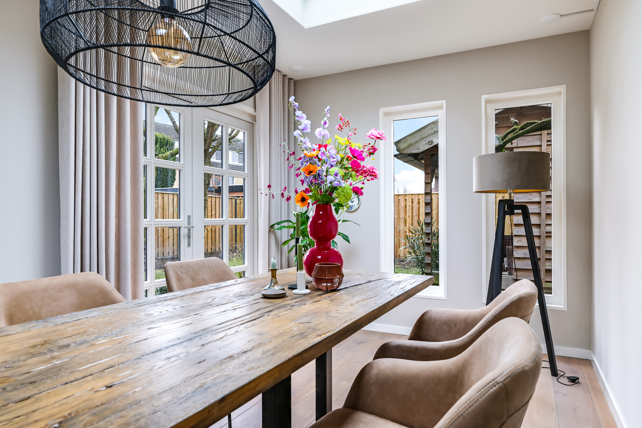De woonkamer van deze woning is aanzienlijk vergroot. Er is namelijk niet alleen een stukje van de garage bij de woning getrokken, er is ook een stuk aangebouwd waardoor hier een volwaardige eetkamer is ontstaan. 2 Lichtkoepels, openslaande deuren en 2 grote ramen zorgen hier voor lekker veel lichtinval. Daarbij kom je in de woonkamer ook geen lichtinval tekort door de grote doorzonramen. Erg aangenaam is de aanwezige vloerverwarming welke op de gehele begane grond is gelegd. Daarbij is er zelfs (gedeeltelijk) muurverwarming toegepast wat zorgt voor een hoog comfortgehalte. Een massief parketvloer zorgt voor een warme uitstraling. Nog een pluspunt is de loopdeur in de keuken en de openslaande deuren in de eetkamer. Hierdoor betrek je in de zomerdag eenvoudig de tuin en de woonkamer bij elkaar.