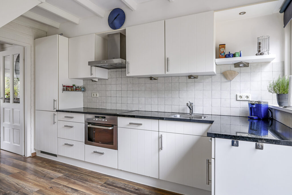 De keuken is modern en luxe te noemen, mede doordat het een zwart granieten aanrechtblad heeft en voorzien is van inbouwapparatuur. Hierbij moet je denken aan een vaatwasser, een combi-oven, 4-pits keramische kookplaat met afzuigschouw en een koel/vriescombi. Noemenswaardig is de hoekkast met “Le-man-slede”, een luxe en erg praktische, uitschuifbare pannenkast waardoor je overal bij kunt. Overigens heeft de keuken ook nog een tuindeur (met rolhor) waardoor er een directe verbinding is met de achtertuin. Op een zomerse dag lekker buiten eten is daardoor een goede optie.