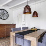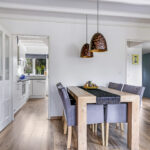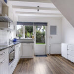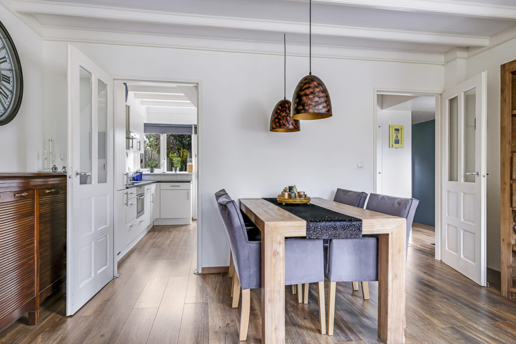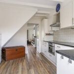 Ondanks dat de keuken direct aan de woonkamer grenst, is de keuken af te sluiten met een tussendeur. Doordat de keuken ruim van opzet is, kunnen we spreken van een woonkeuken. Er kan namelijk prima een 4-persoons eettafel staan. Hierdoor hoef je ook niet per se een eettafel in de woonkamer kwijt, waardoor er meer inrichtingsmogelijkheden zijn. Ook is er nog iets ruimte onder de trap, een ideaal speelhoekje voor kleine kinderen.