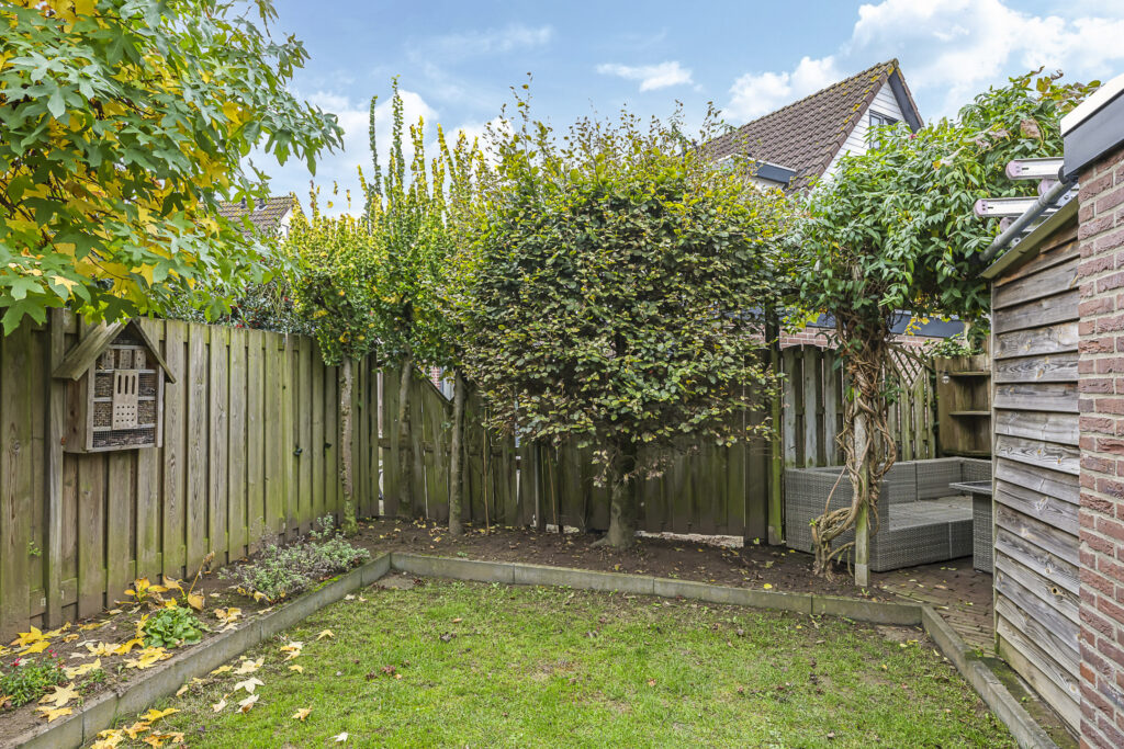 De achtertuin is groen omsloten en biedt relatief veel privacy. Zowel voor- als achterin is er een terras aangelegd met in het midden een verzorgd gazon. Door de gunstig ligging heeft de tuin veel zonuren. Op de oprit is plaats voor 2 auto’s.