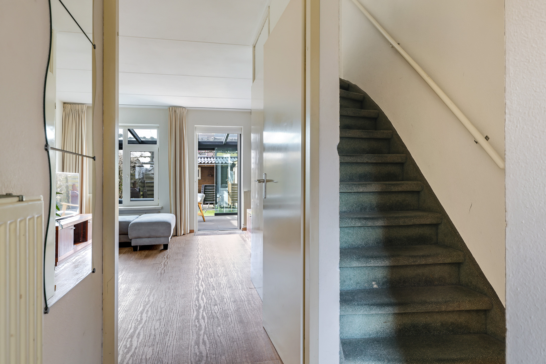 Tuingerichte woonkamer met trapkast en tuindeur