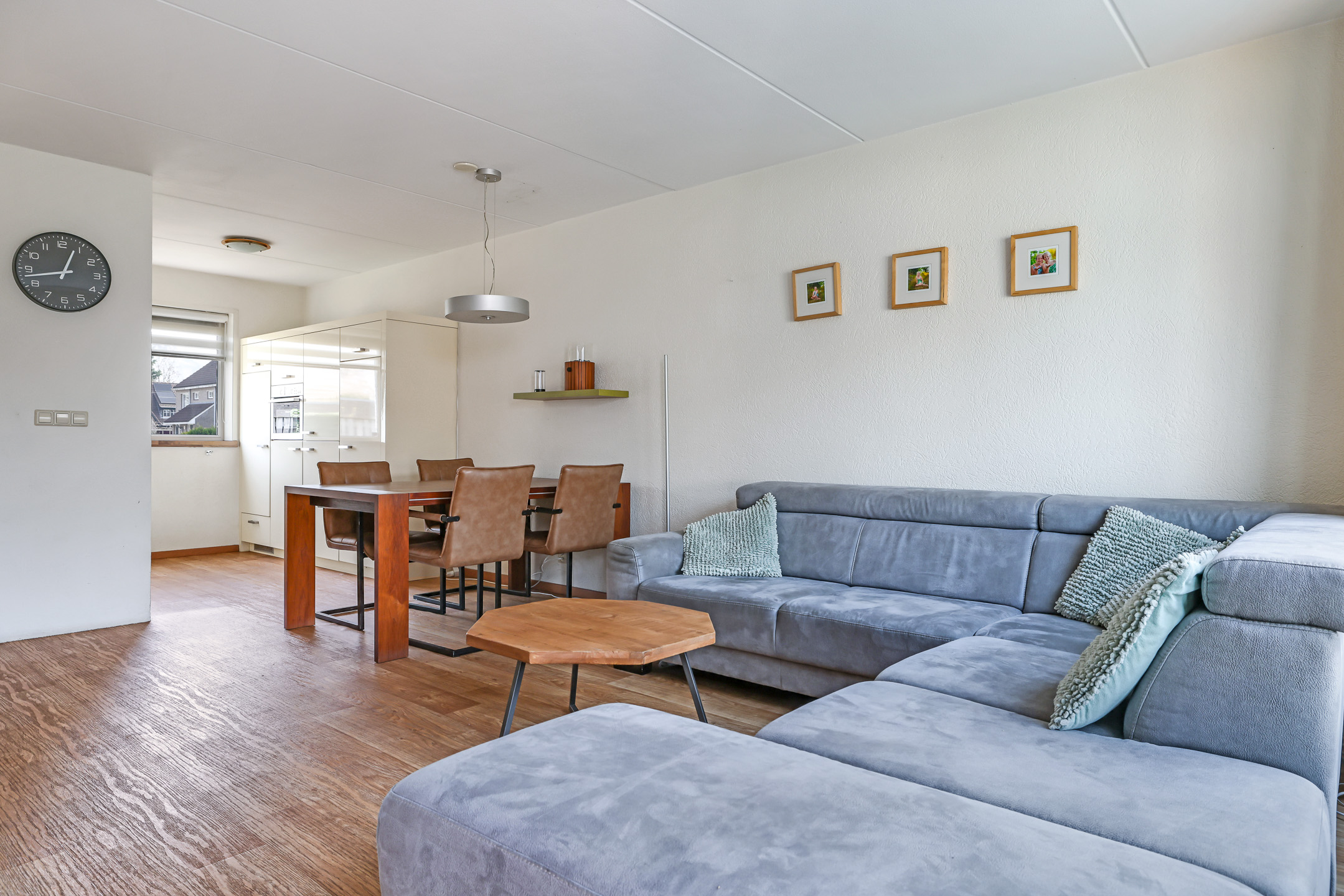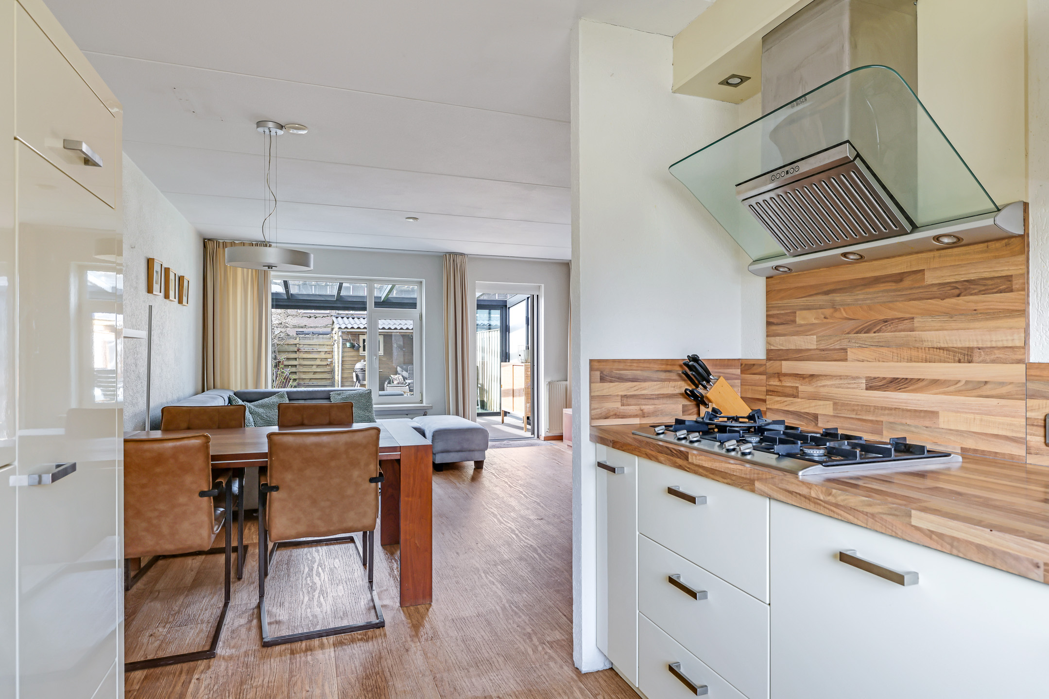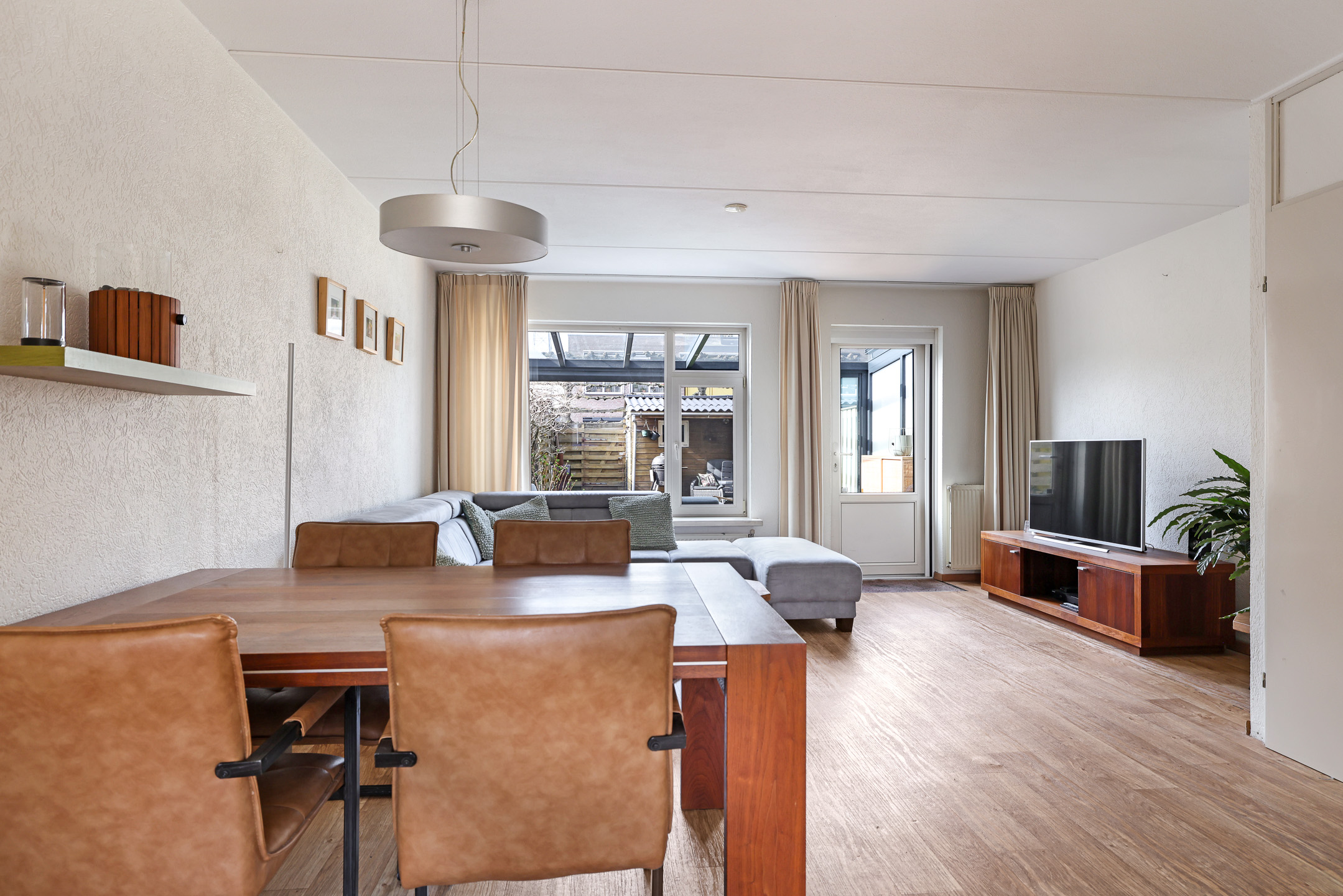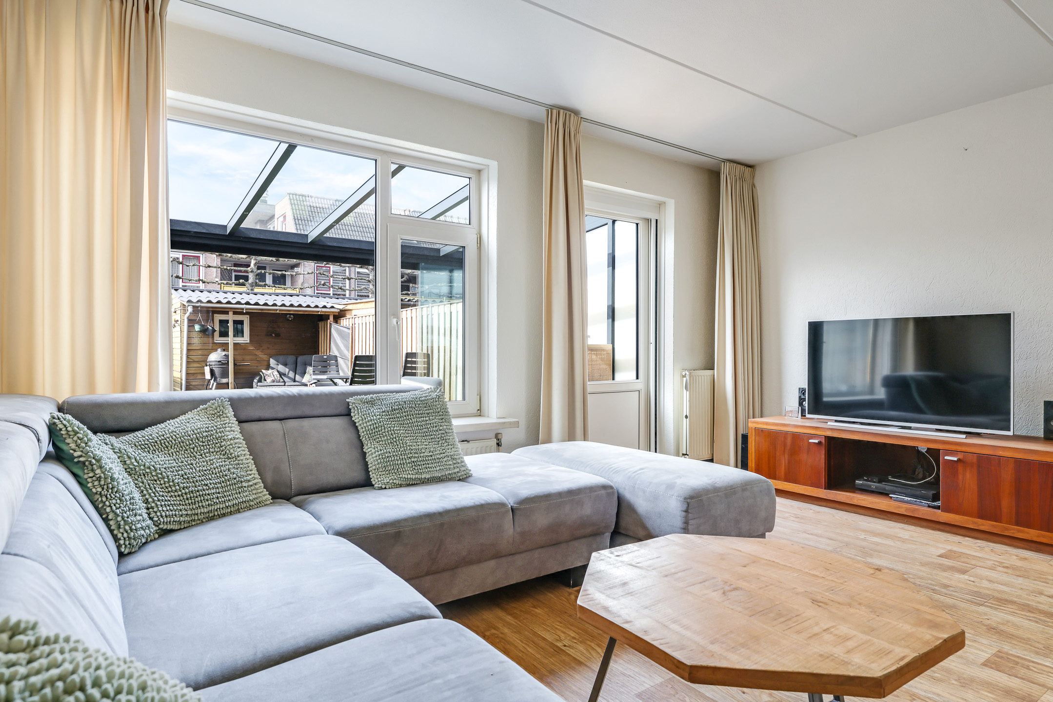 De woonkamer is aan de achterzijde gelegen en daardoor tuingericht. Een tuindeur geeft direct toegang tot de aangebouwde tuinkamer. Wat erg fijn is, is dat de woonkamer over de volle breedte van de woning is gelegen. Hierdoor kun je met gemak een grote hoekbank kwijt, evenals een gezellige (ronde) eettafel richting de open keuken. Vloerverwarming zorgt voor een aangenaam woonklimaat in zowel de woonkamer als de keuken. Verder is er nog een handige inbouw/trapkast te vinden met wandschappen en praktische opbergruimte voor bijvoorbeeld een stofzuiger.