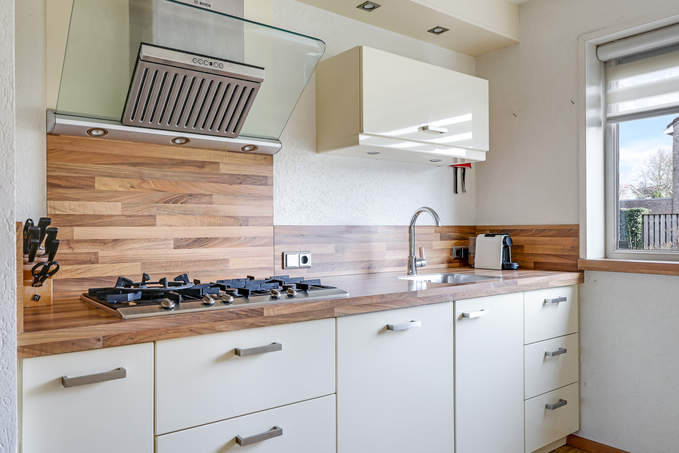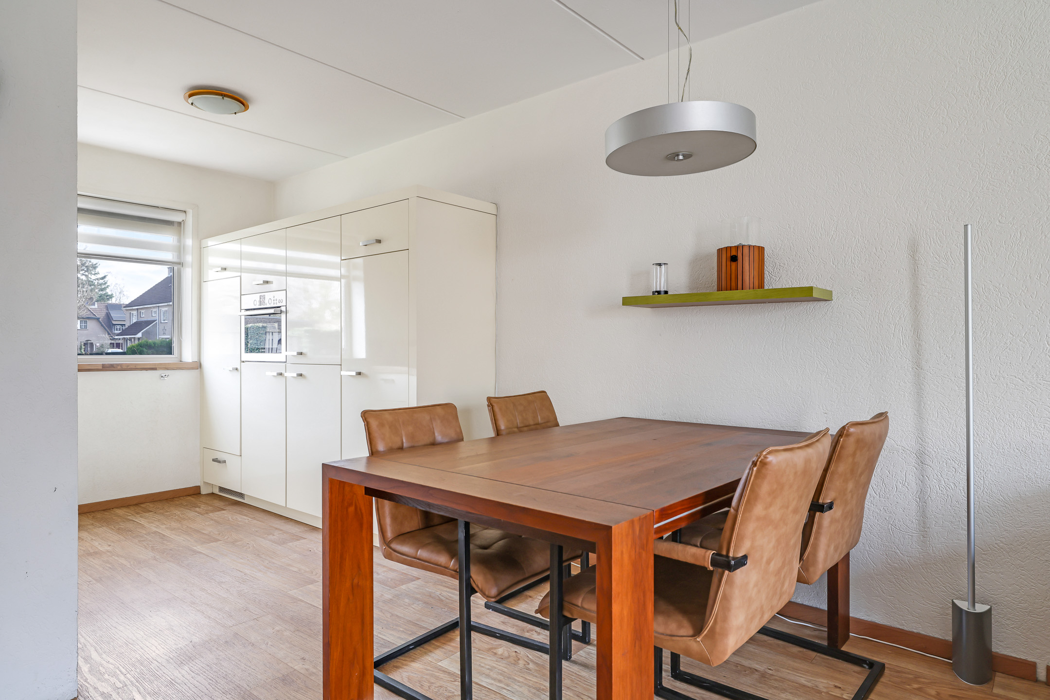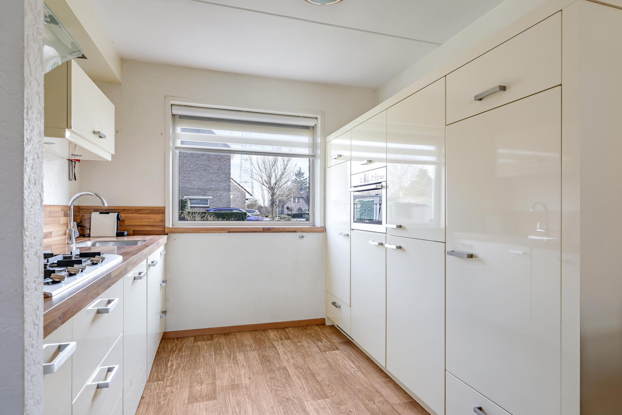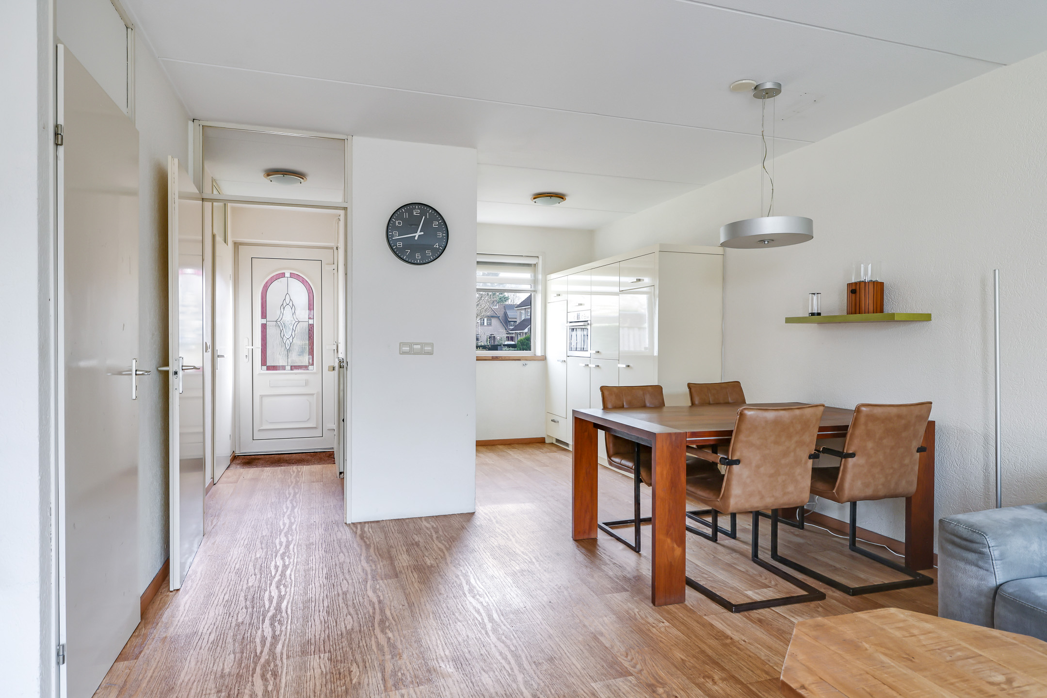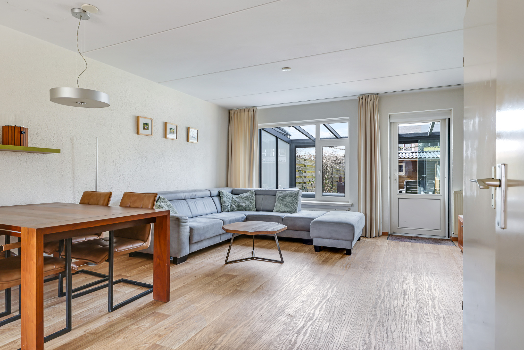 De woonkamer is aan de achterzijde gelegen en daardoor tuingericht. Een tuindeur geeft direct toegang tot de aangebouwde tuinkamer. Wat erg fijn is, is dat de woonkamer over de volle breedte van de woning is gelegen. Hierdoor kun je met gemak een grote hoekbank kwijt, evenals een gezellige (ronde) eettafel richting de open keuken. Vloerverwarming zorgt voor een aangenaam woonklimaat in zowel de woonkamer als de keuken. Verder is er nog een handige inbouw/trapkast te vinden met wandschappen en praktische opbergruimte voor bijvoorbeeld een stofzuiger.