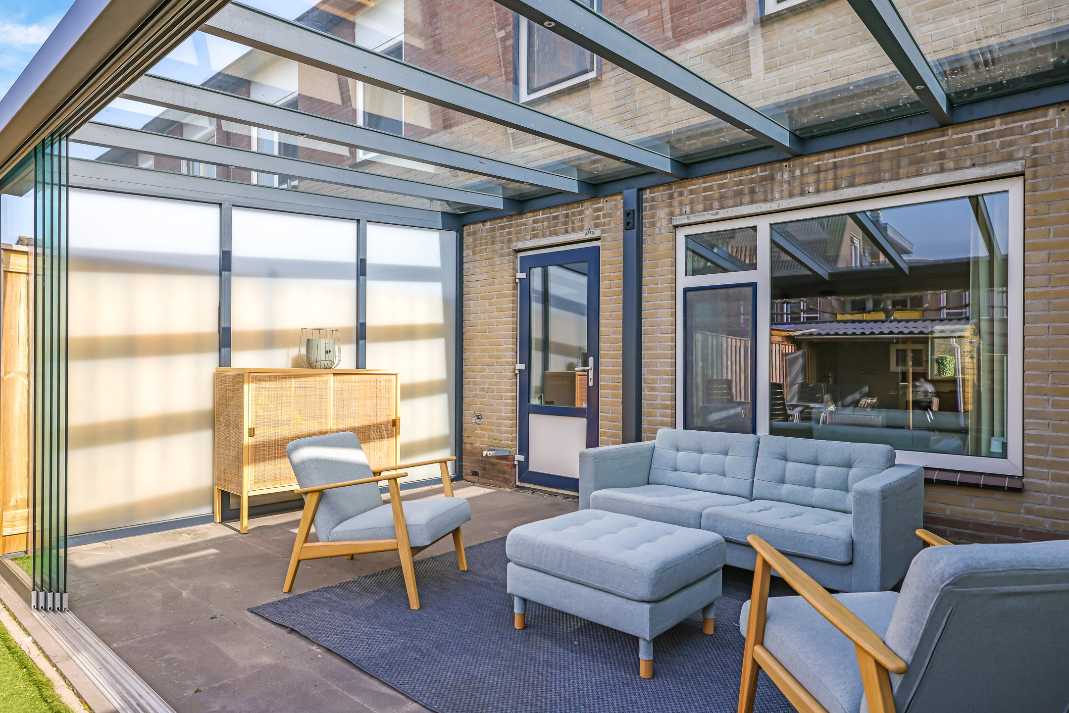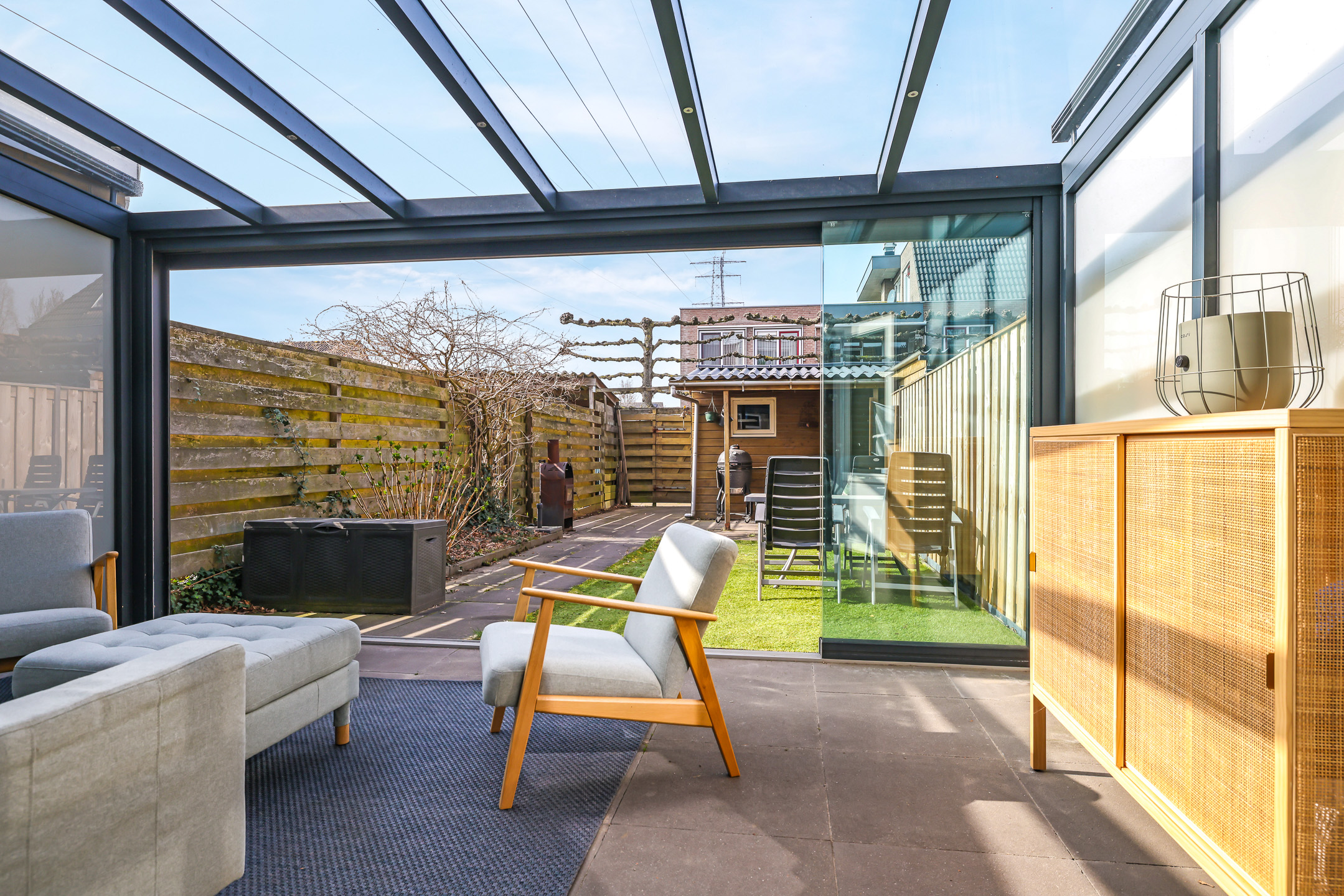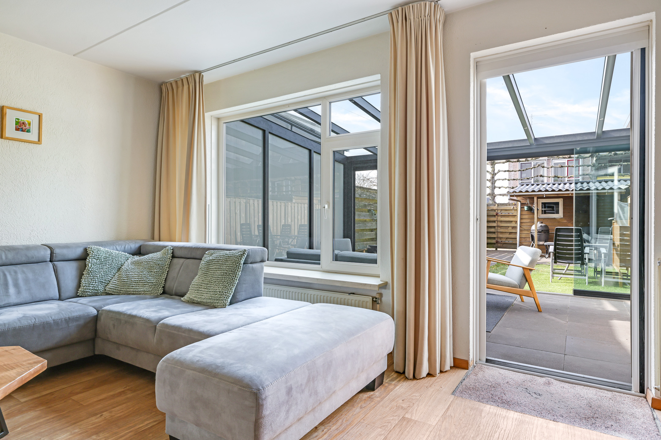 Nog geen 2 jaar geleden is er een fraaie tuinkamer aan de woning gezet. Deze tuinkamer is net zo breed als de woning en met 3,5 meter diepte is deze tuinkamer maar liefst 18m2 groot. Het frame van de tuinkamer is in aluminium uitgevoerd en waar we vaak bij vergelijkbare ‘aanbouwen’ kunststof dakplaten tegen komen, is het ‘dak’ hier in glas uitgevoerd. Daardoor wordt de woonkamer niet donkerder en kun je in de donkere avonduren zo naar de sterrenhemel kijken. Overigens zijn er in de dragende liggers inbouwspots aangebracht. De tuinkamer is geheel af te sluiten met glazen schuifpanelen die je dus ook helemaal open kunt zetten. Dan krijg je het idee van een veranda. Er zijn extra wandcontactdozen voorzien, zelfs op hoogte waardoor je (indien gewenst) ook nog een elektrische wandheater zou kunnen plaatsen.