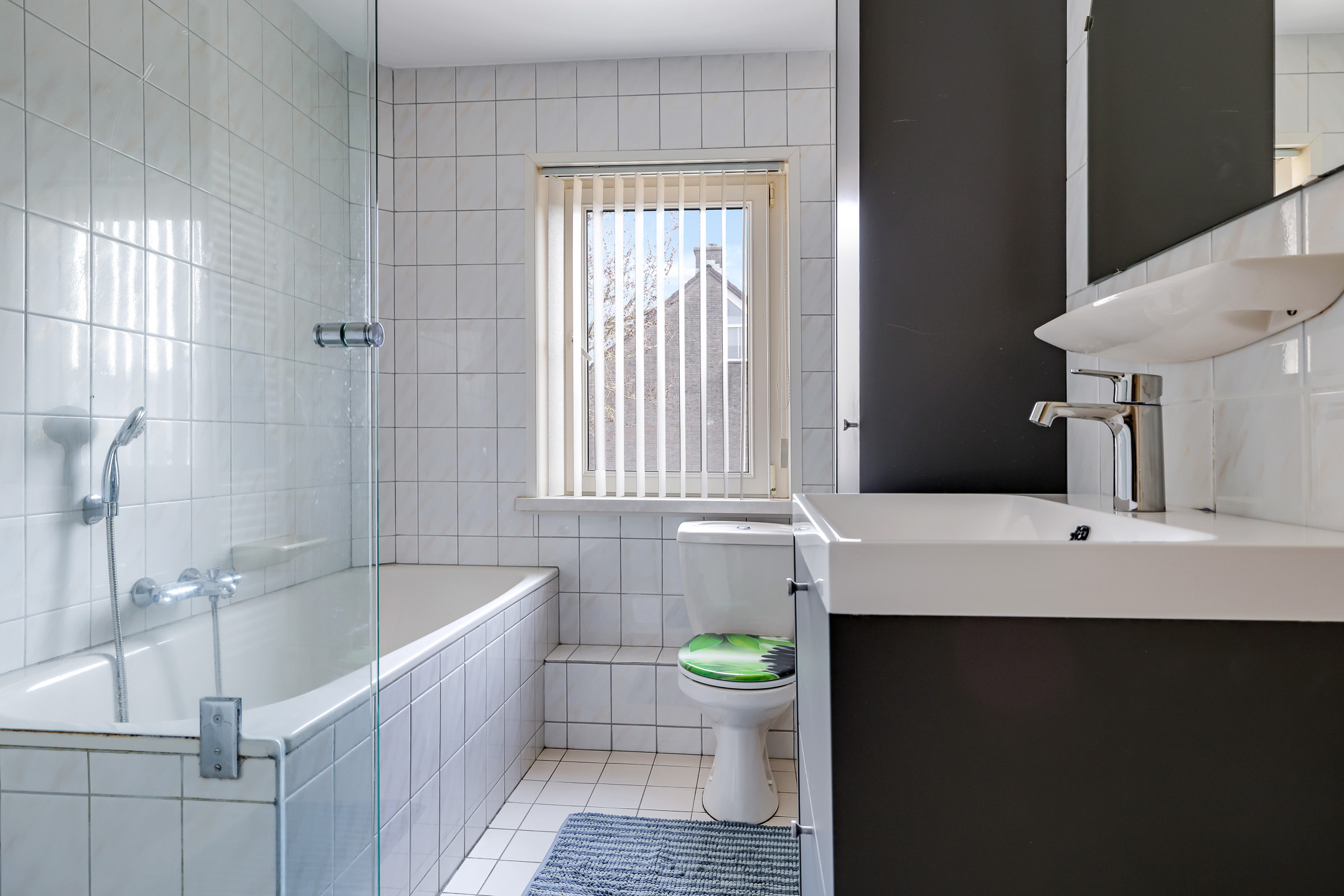 Ook de badkamer heeft een goed formaat en daar is dankbaar gebruik van gemaakt door deze compleet in te delen. De badkamer is ingedeeld met een volwaardig ligbad, een separate inloopdouche ernaast, een wastafelmeubel en een 2e toilet. Het wastafelmeubel is voorzien van een handige opberglade en ook de kolomkast ernaast biedt de mogelijke opbergruimte voor toiletspullen. Verder is de badkamer neutraal betegeld waarbij het tegelwerk tot aan het plafond doorloopt. Het raam zorgt voor een fijne lichtinval, evenals een prima ventilatiemogelijkheid met draai/kiepfunctie.