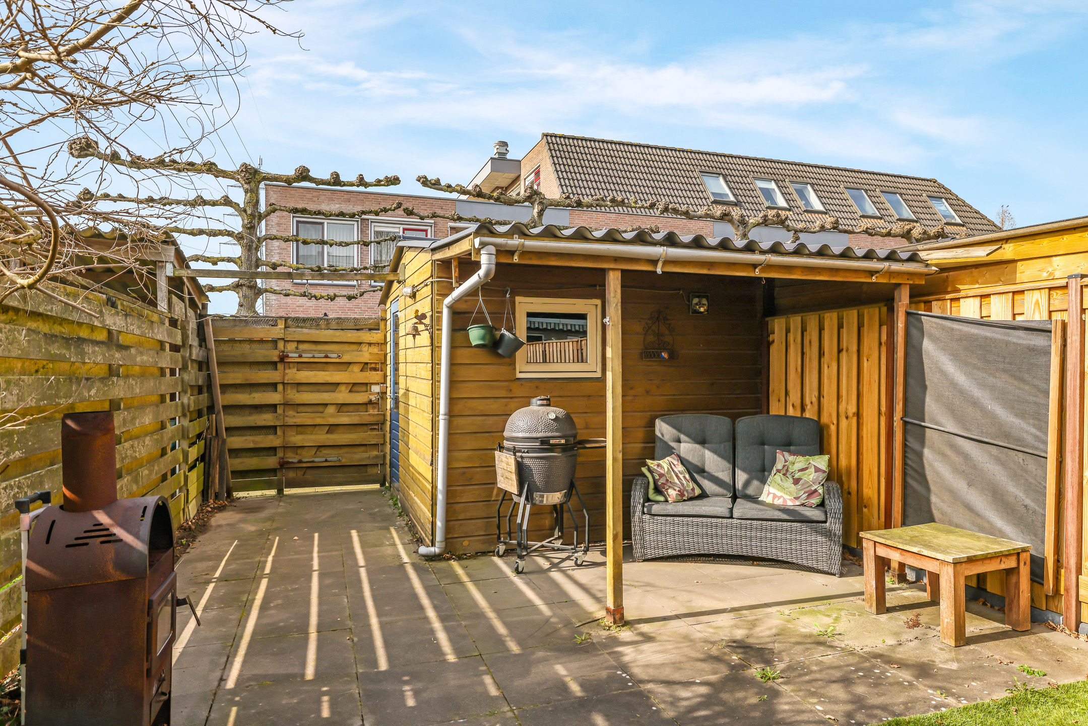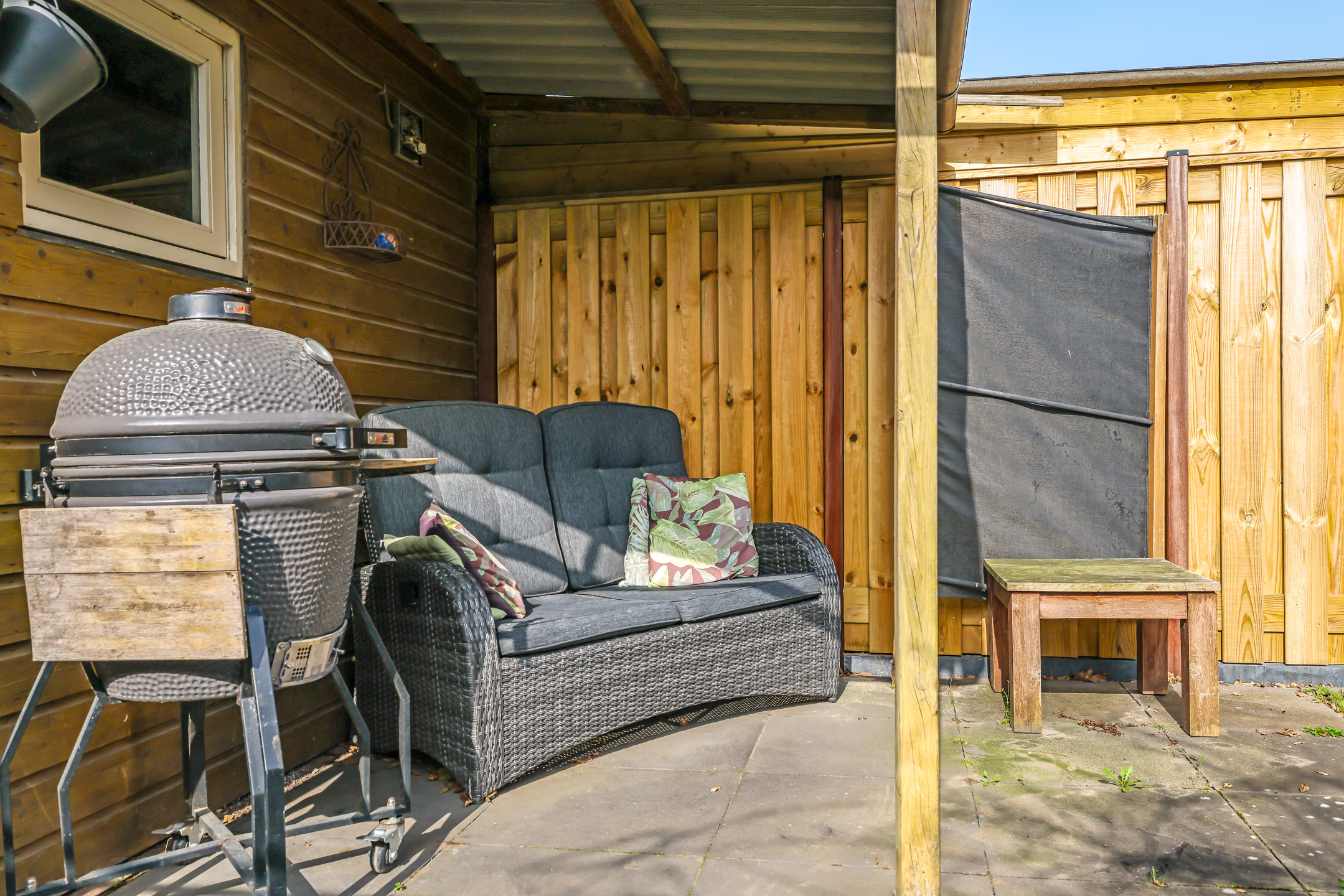 Aan de voorzijde van de schuur is een terrasoverkapping aangebouwd. Hier kun je een leuke tuinset beschut neerzetten en wellicht de schaduw opzoeken wanneer het in de zomer echt warm wordt. Het dak van dit bijgebouw (schuur en veranda) is in 2025 nog vervangen door nieuwe dakplaten.